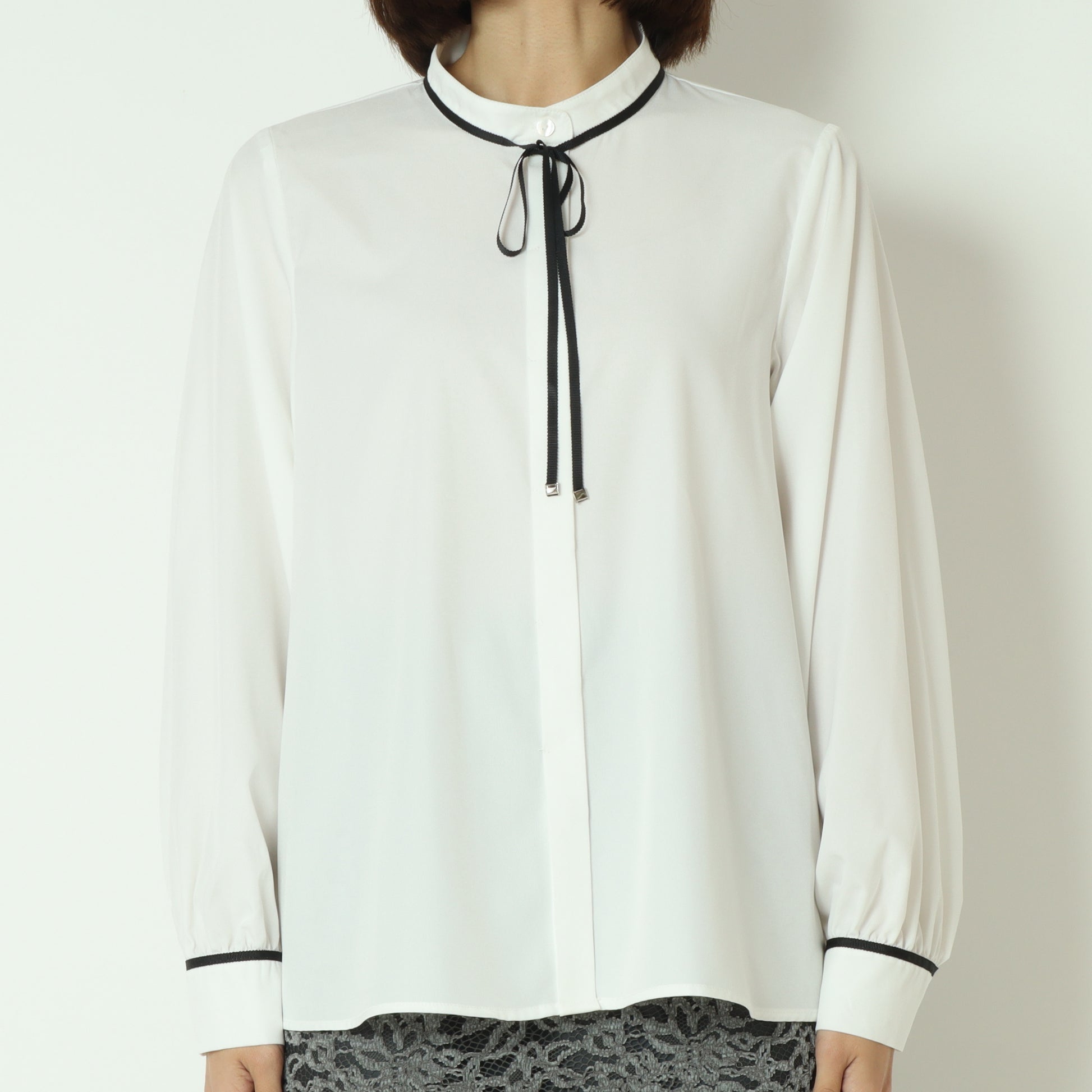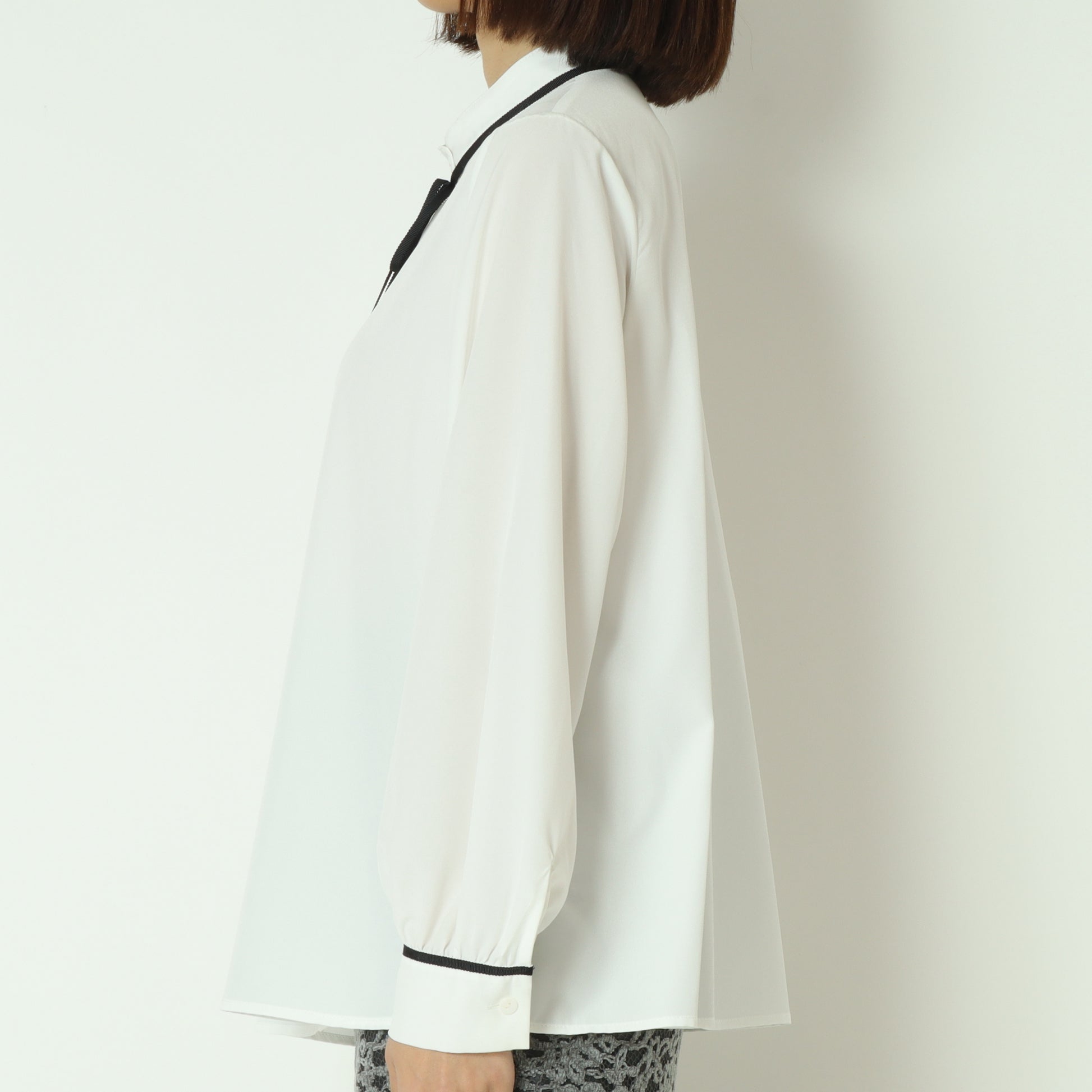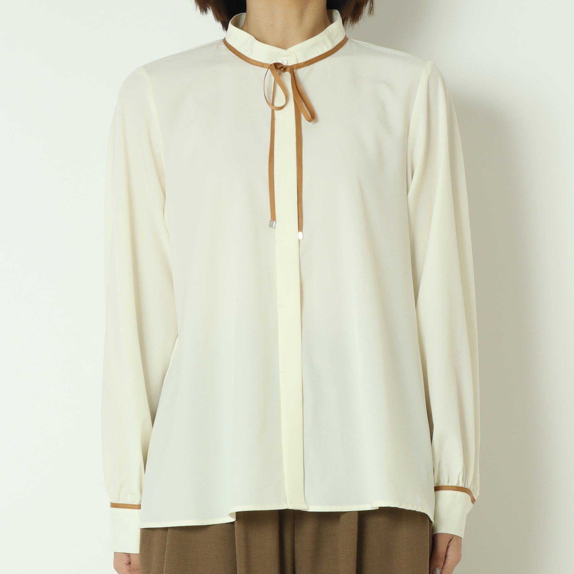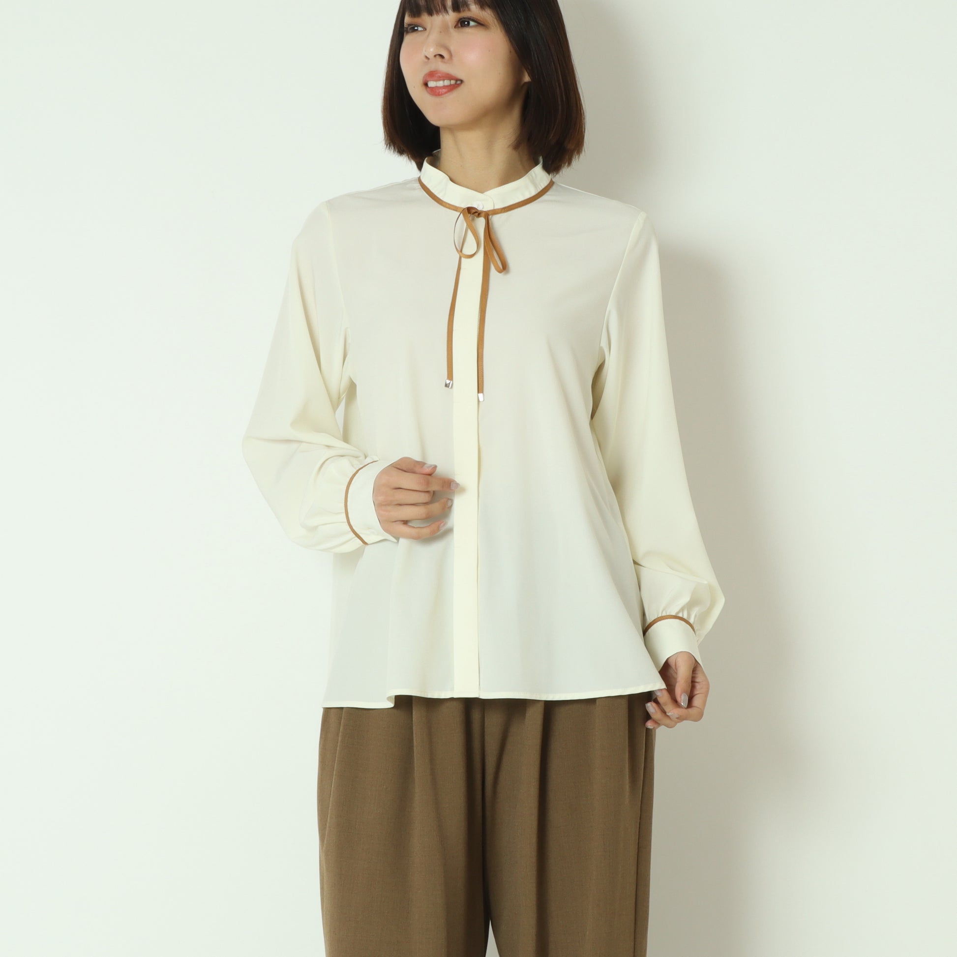 アクセントカラーのパイピングとリボンタイが上品で可愛らしいブラウス。