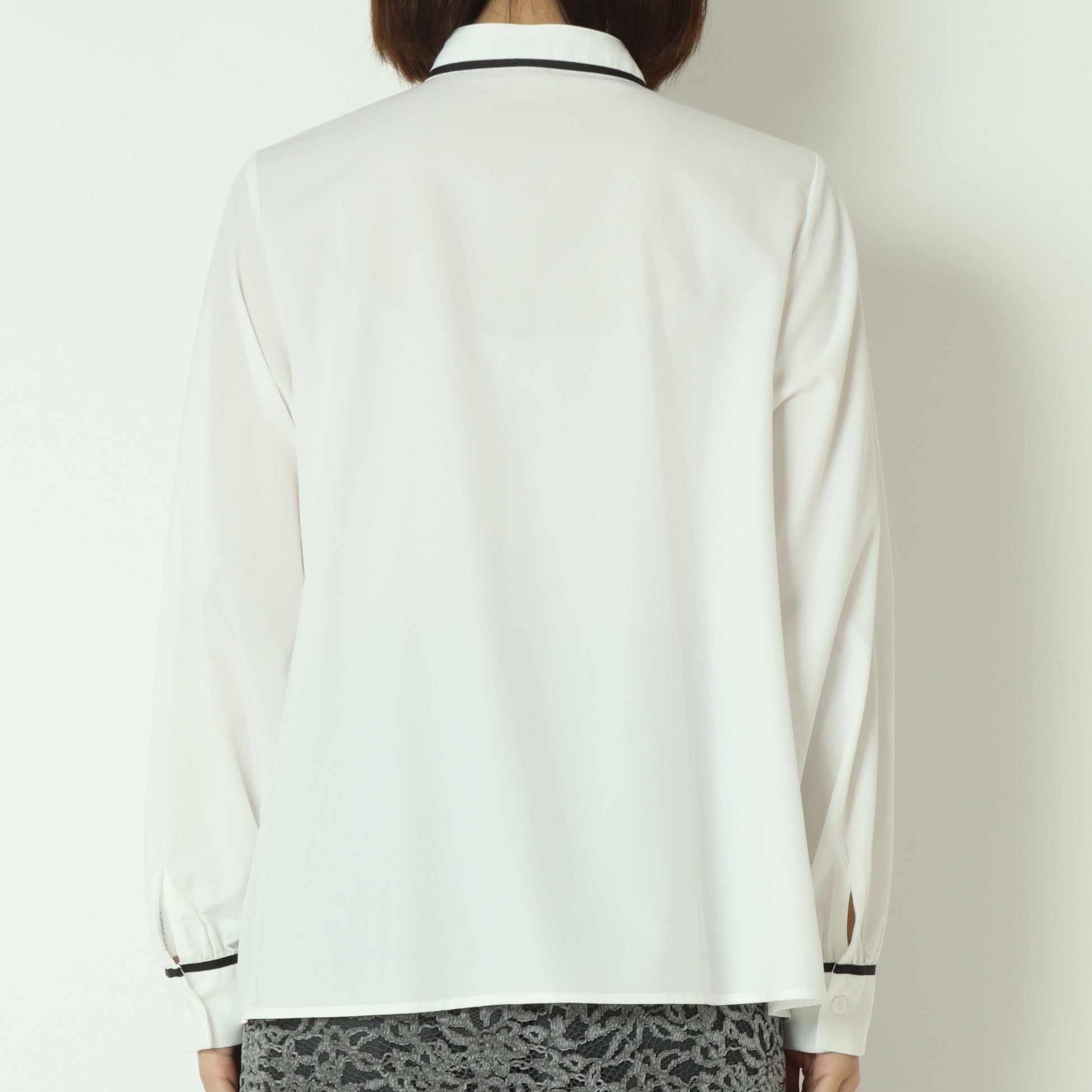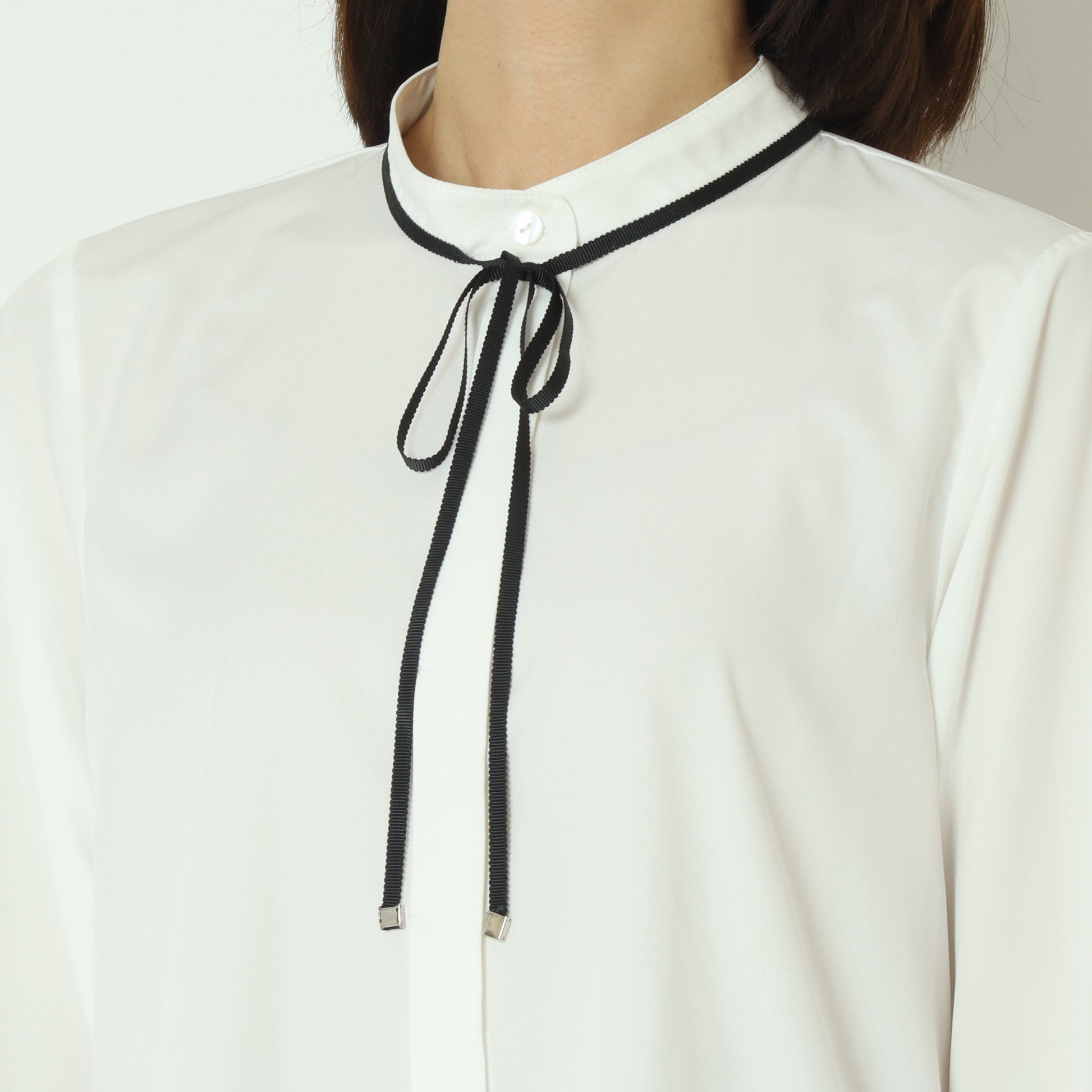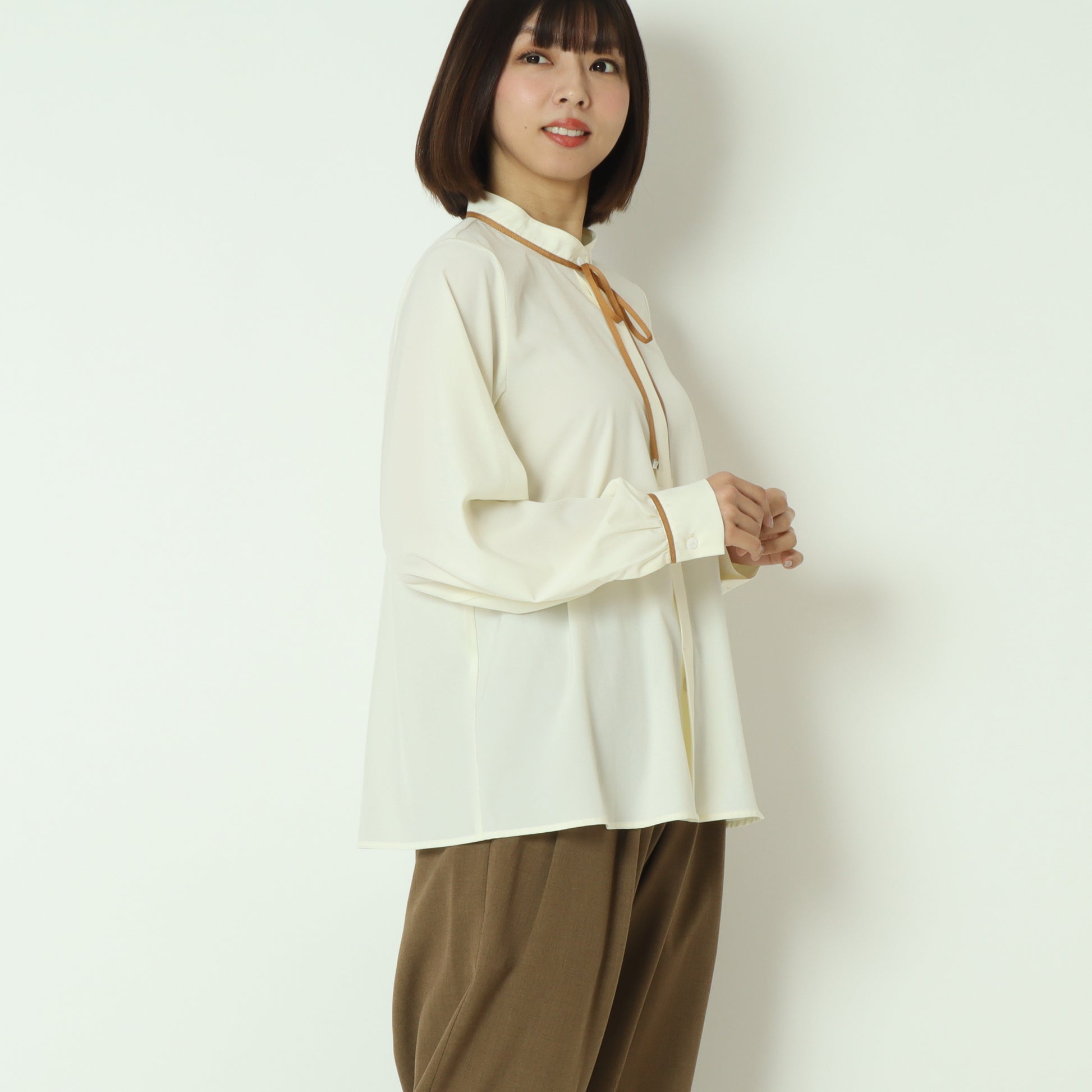 アクセントカラーのパイピングとリボンタイが上品で可愛らしいブラウス。