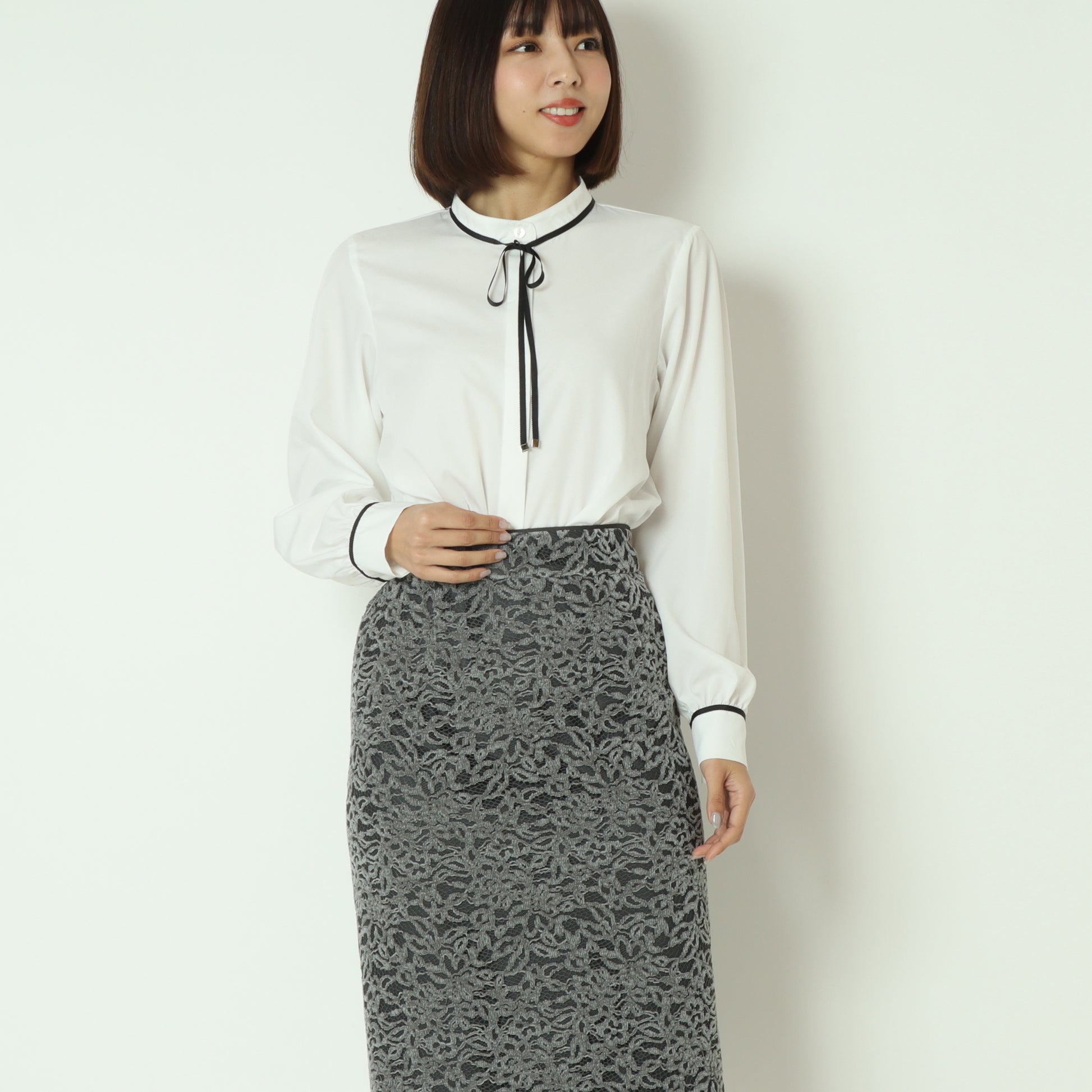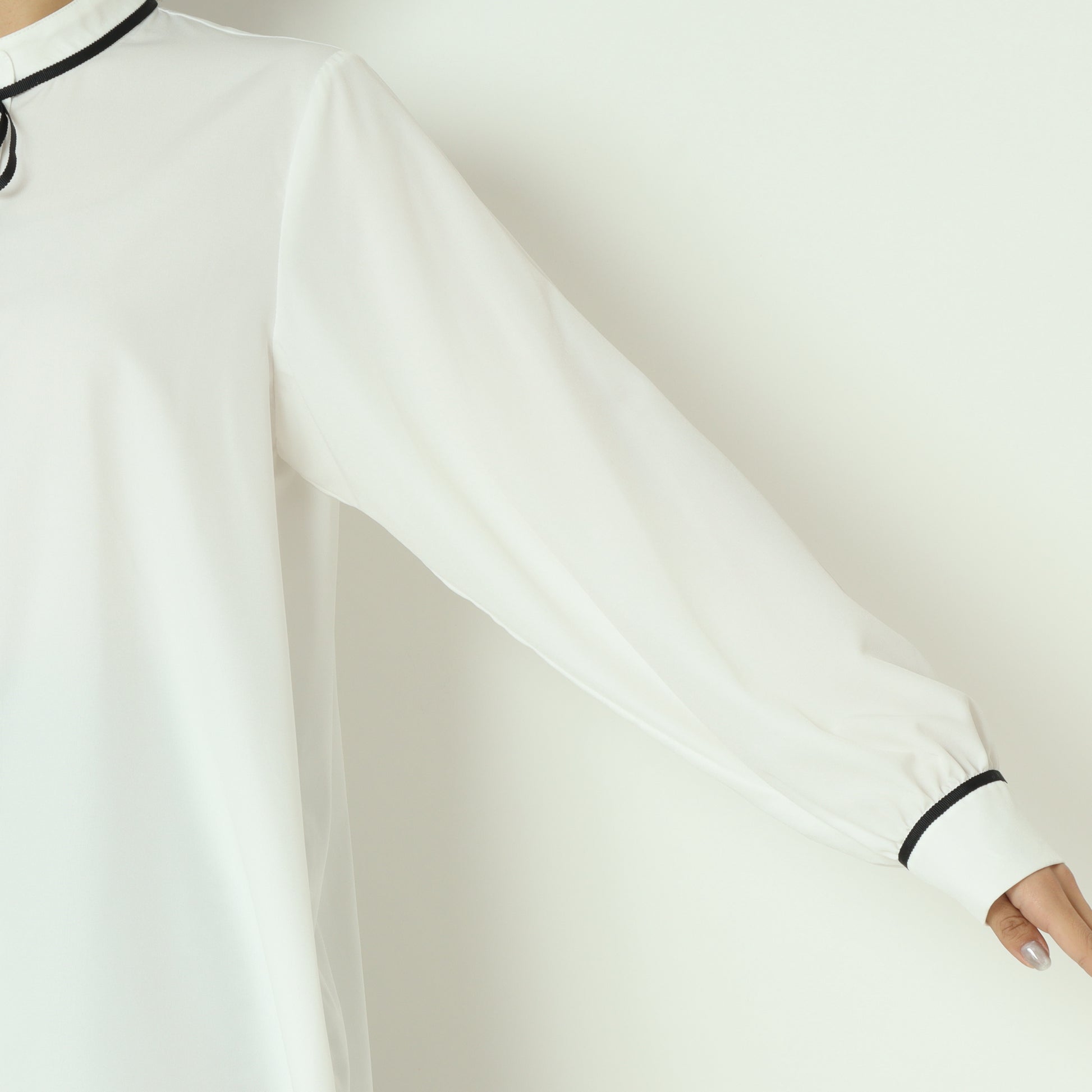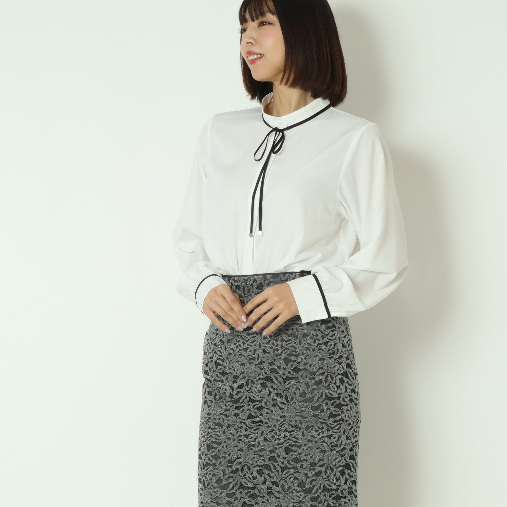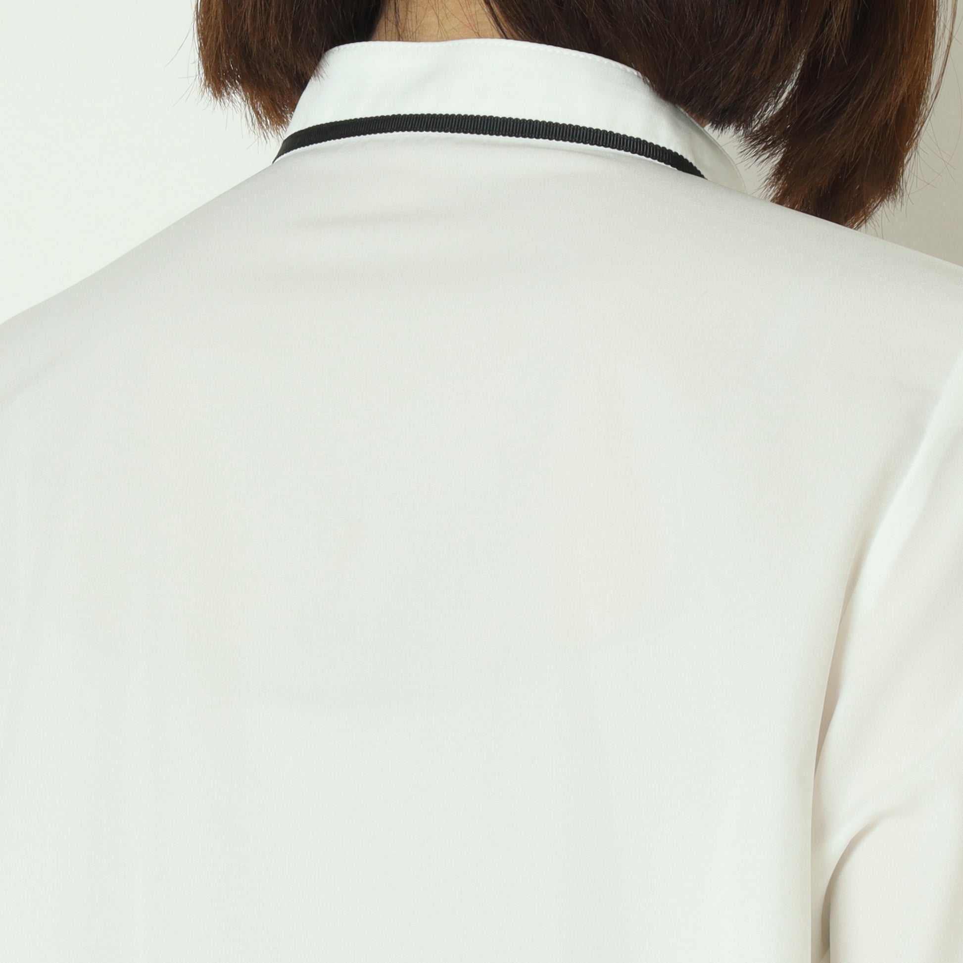 アクセントカラーのパイピングとリボンタイが上品で可愛らしいブラウス。