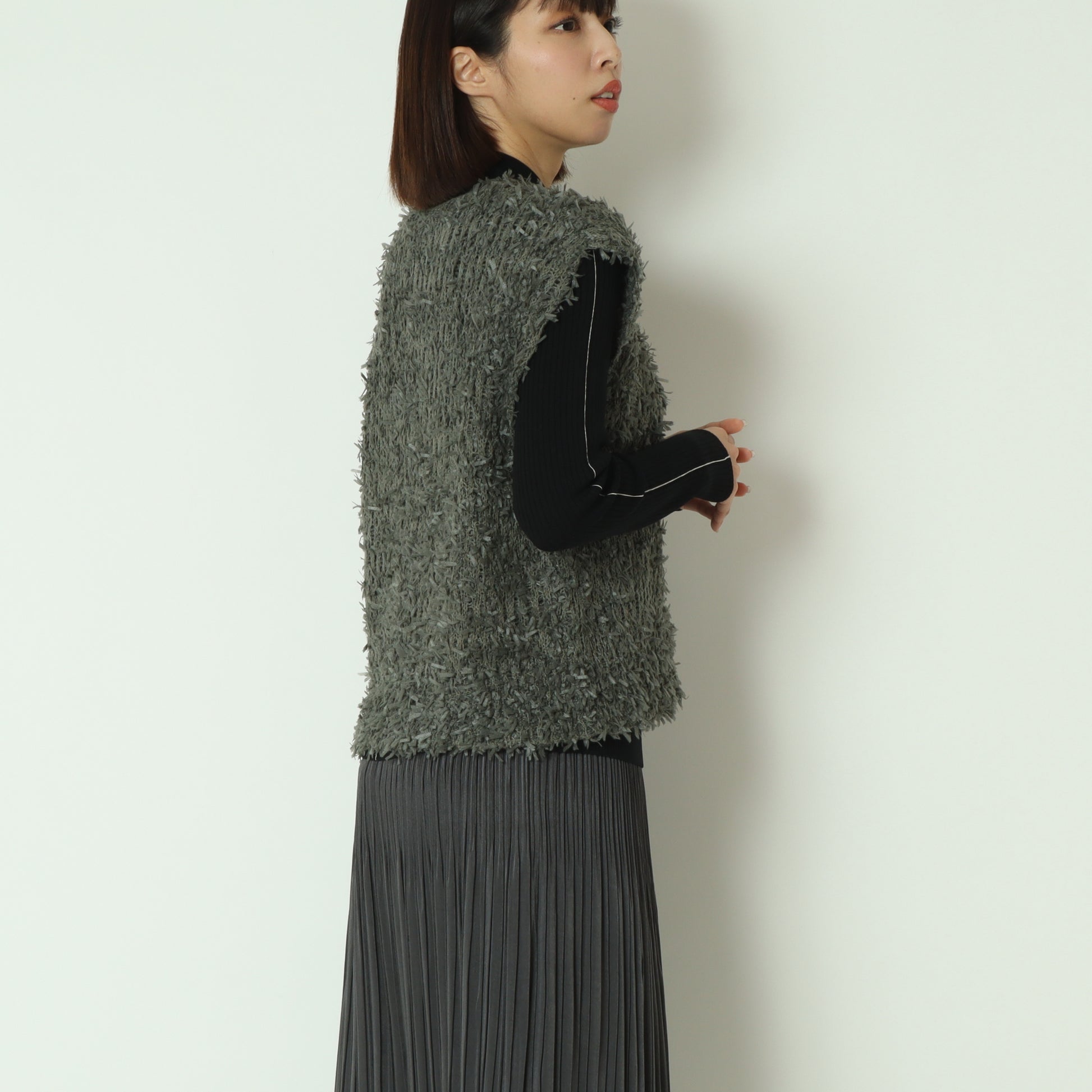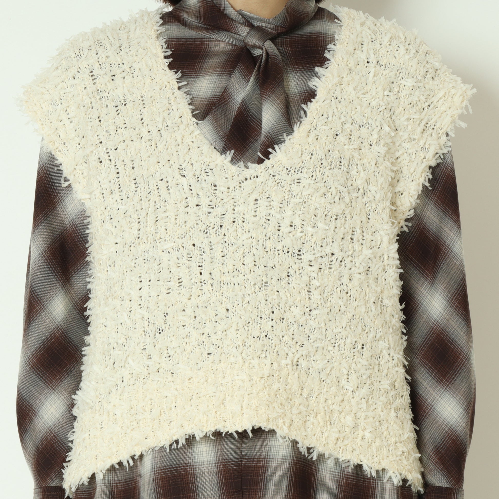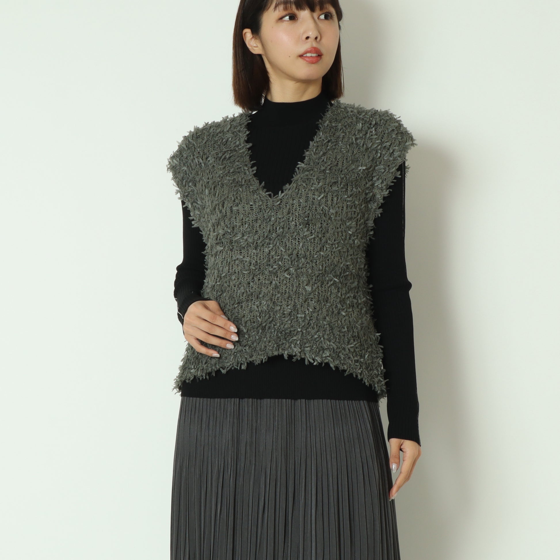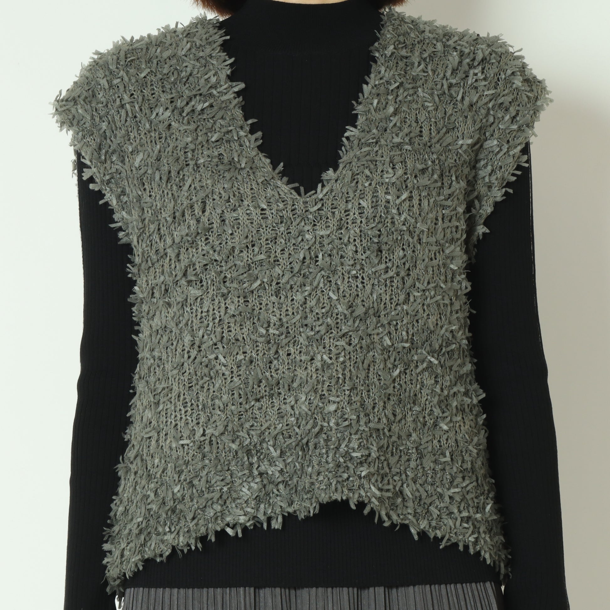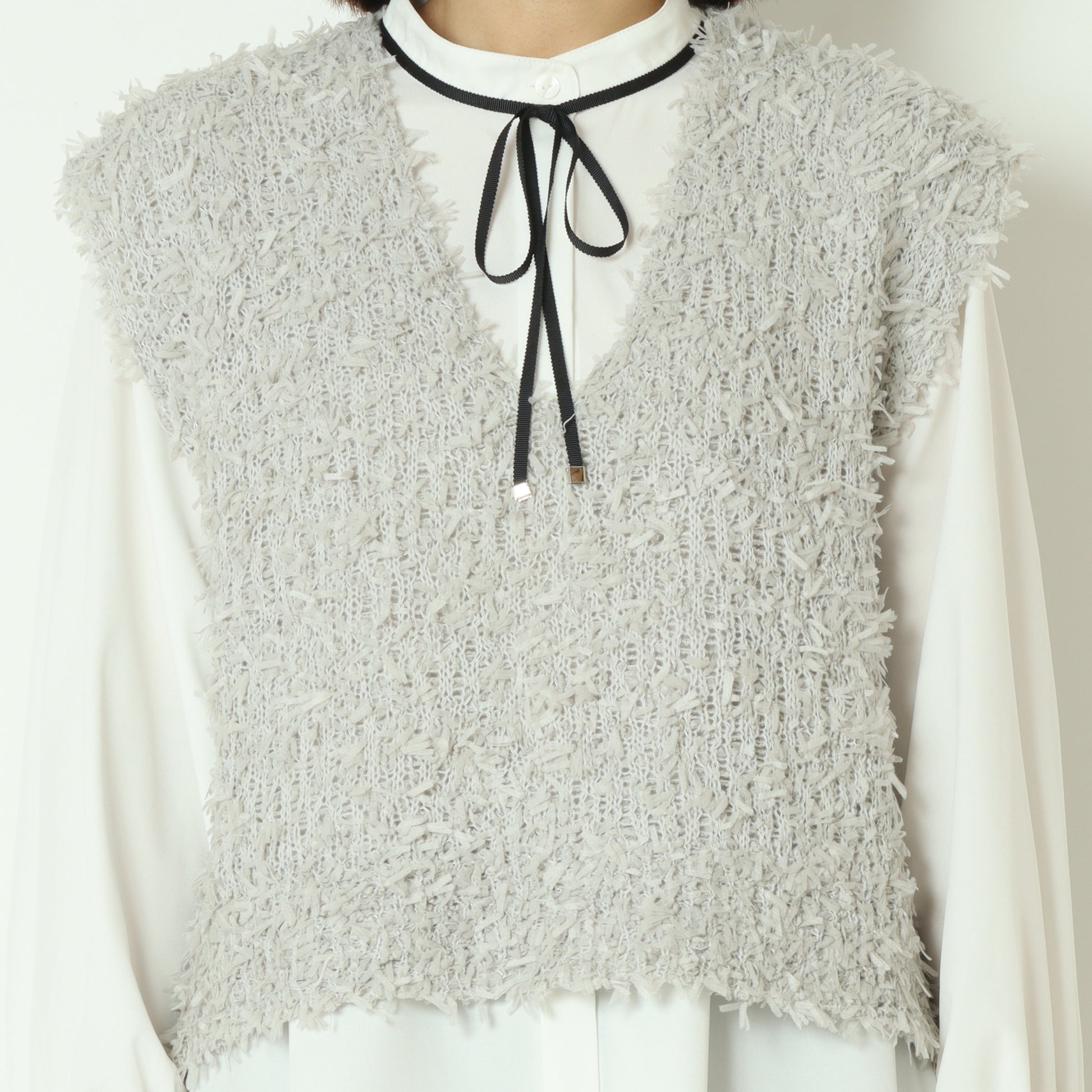 ざっくりと編み立てたテープヤーンが華やかさをプラスしてくれる表情豊かなVネックベスト。