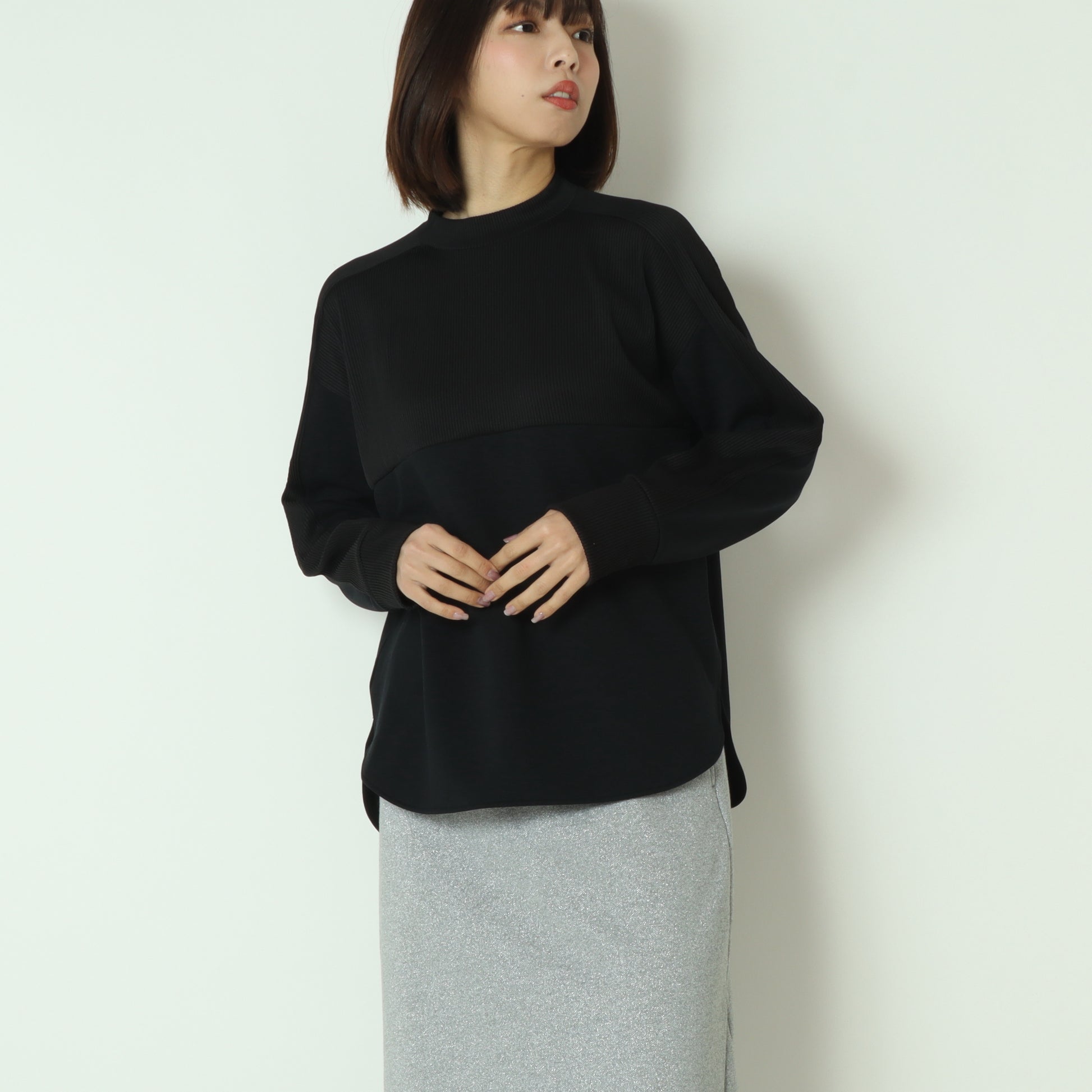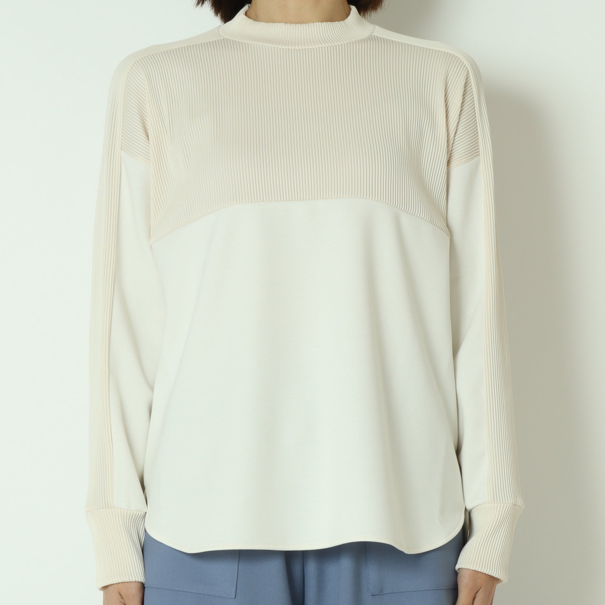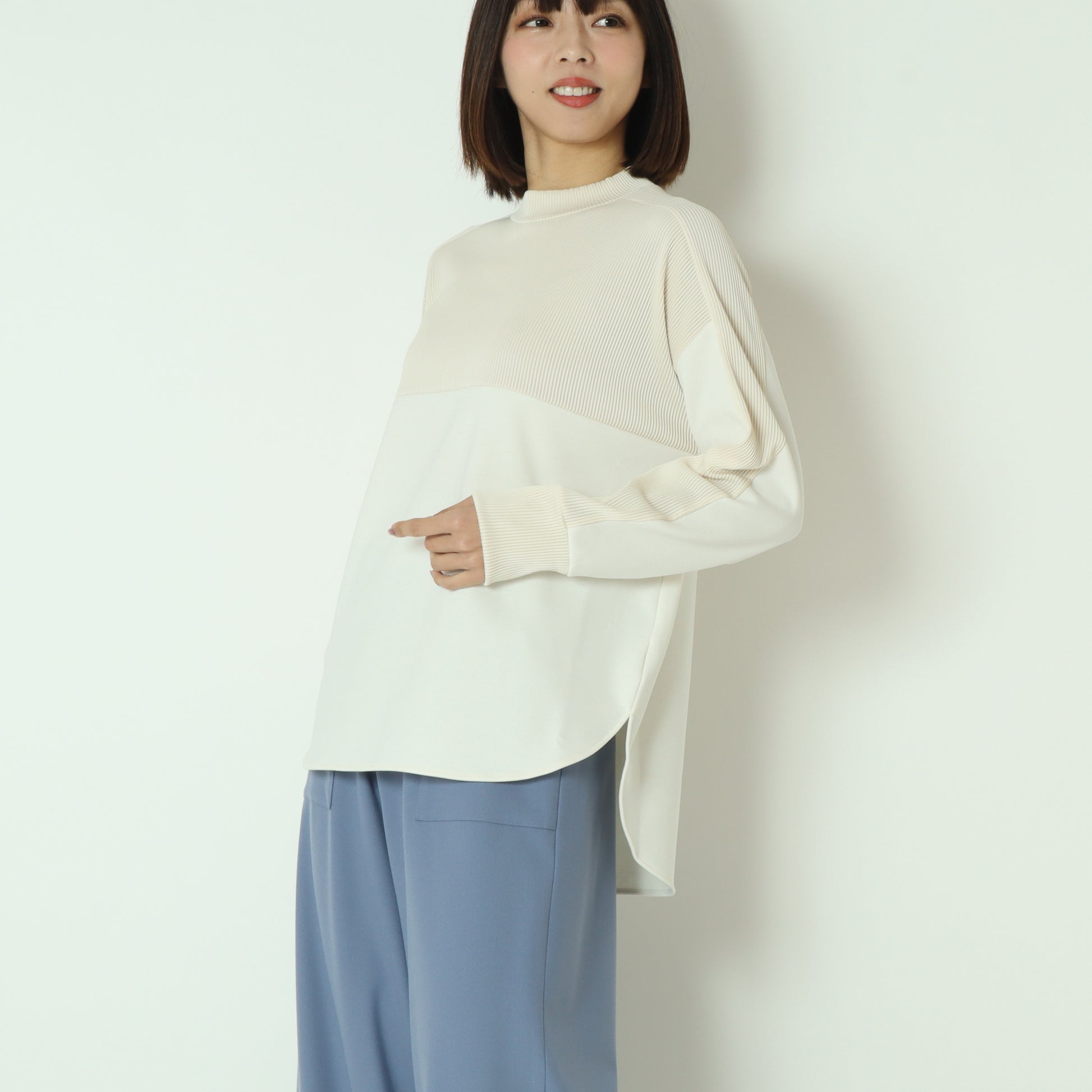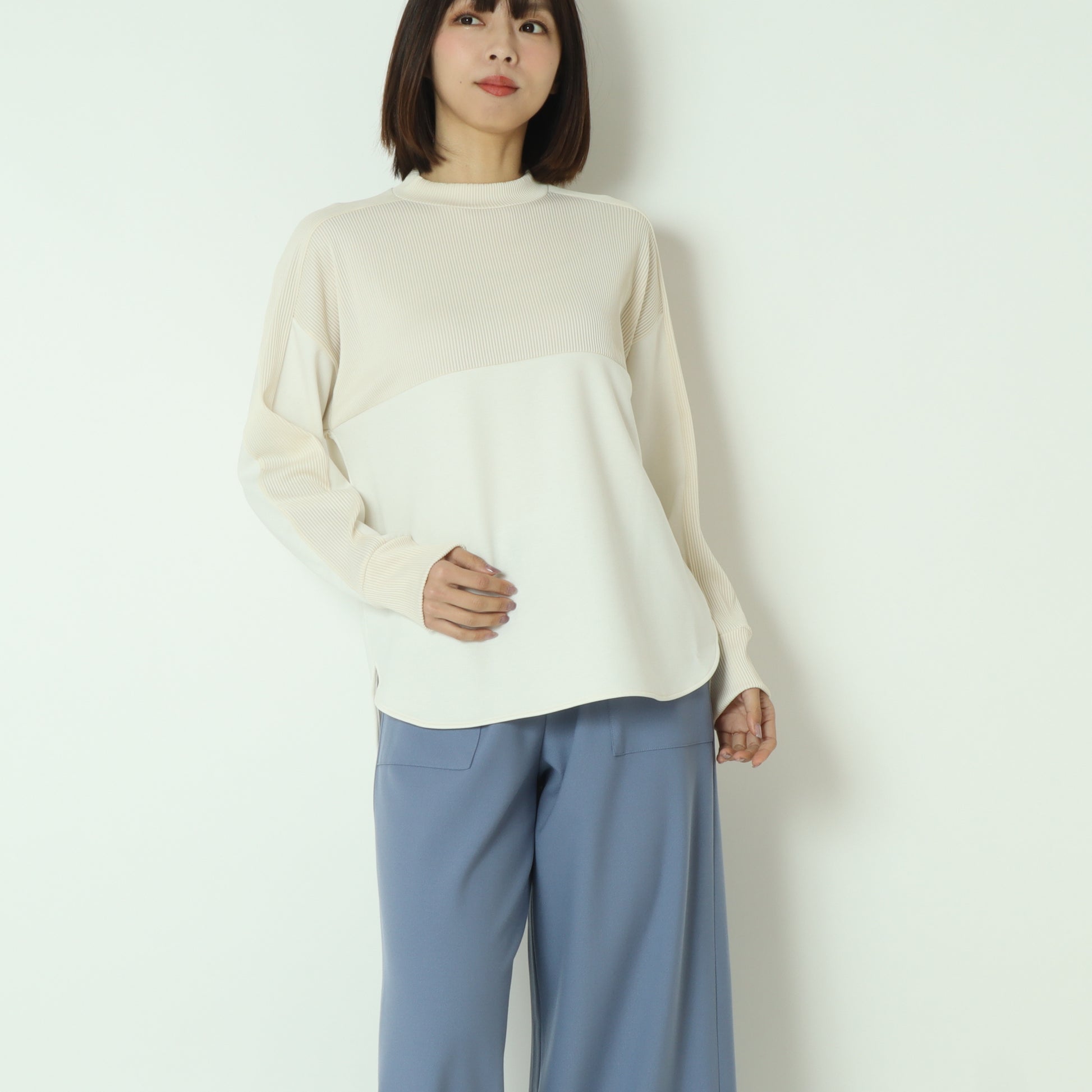 身頃上部と袖、袖口にリブ素材が切り替えでデザインされている長袖のカットソー。