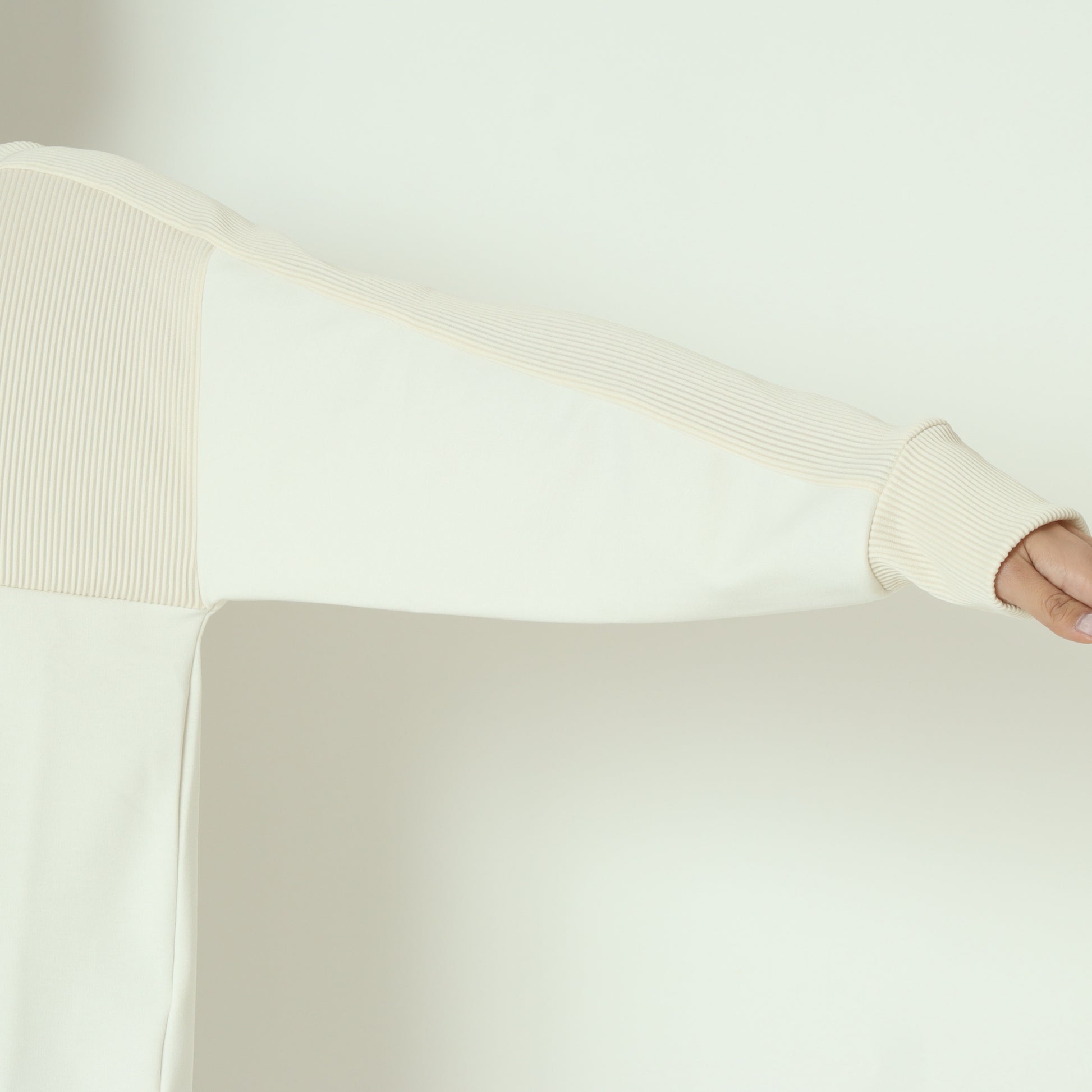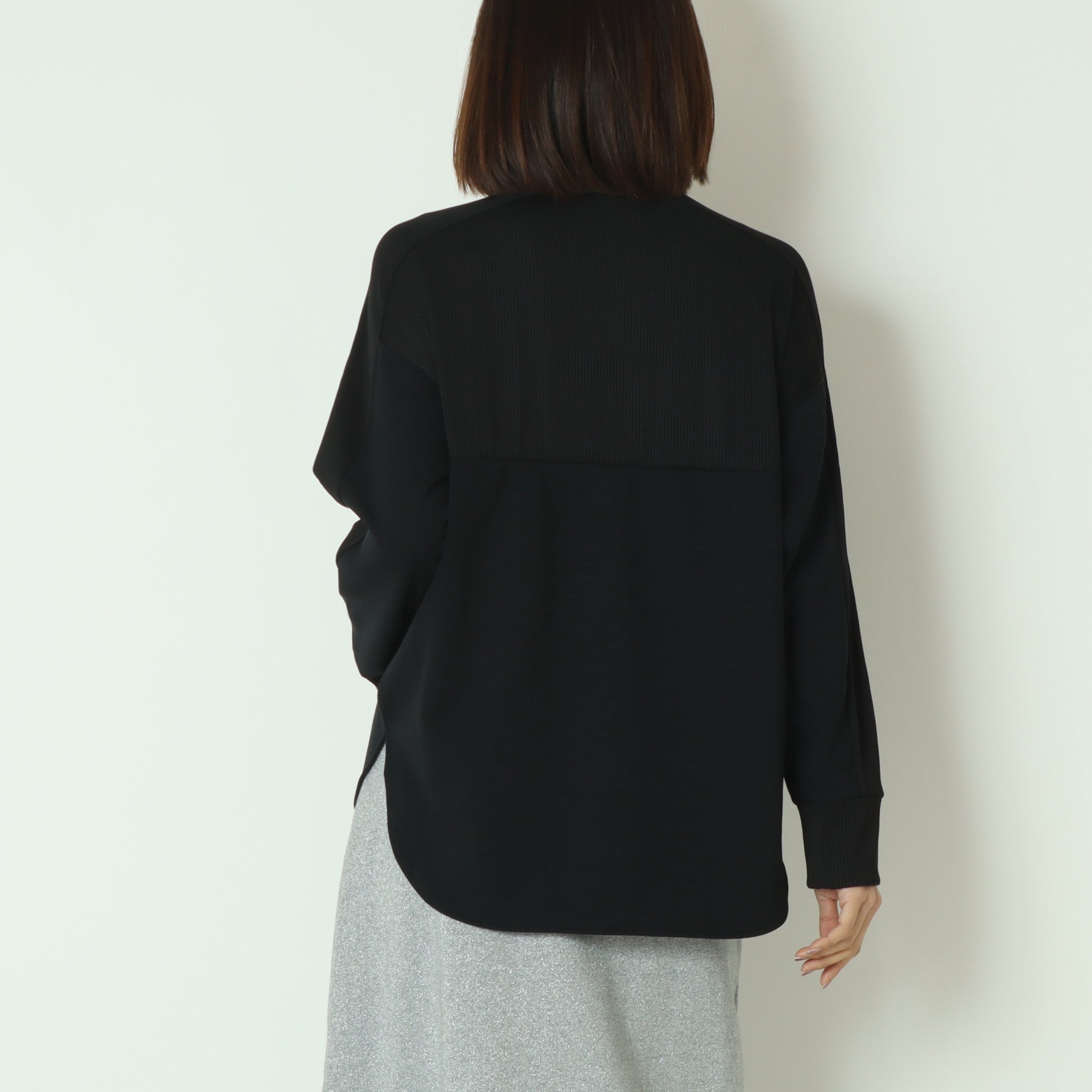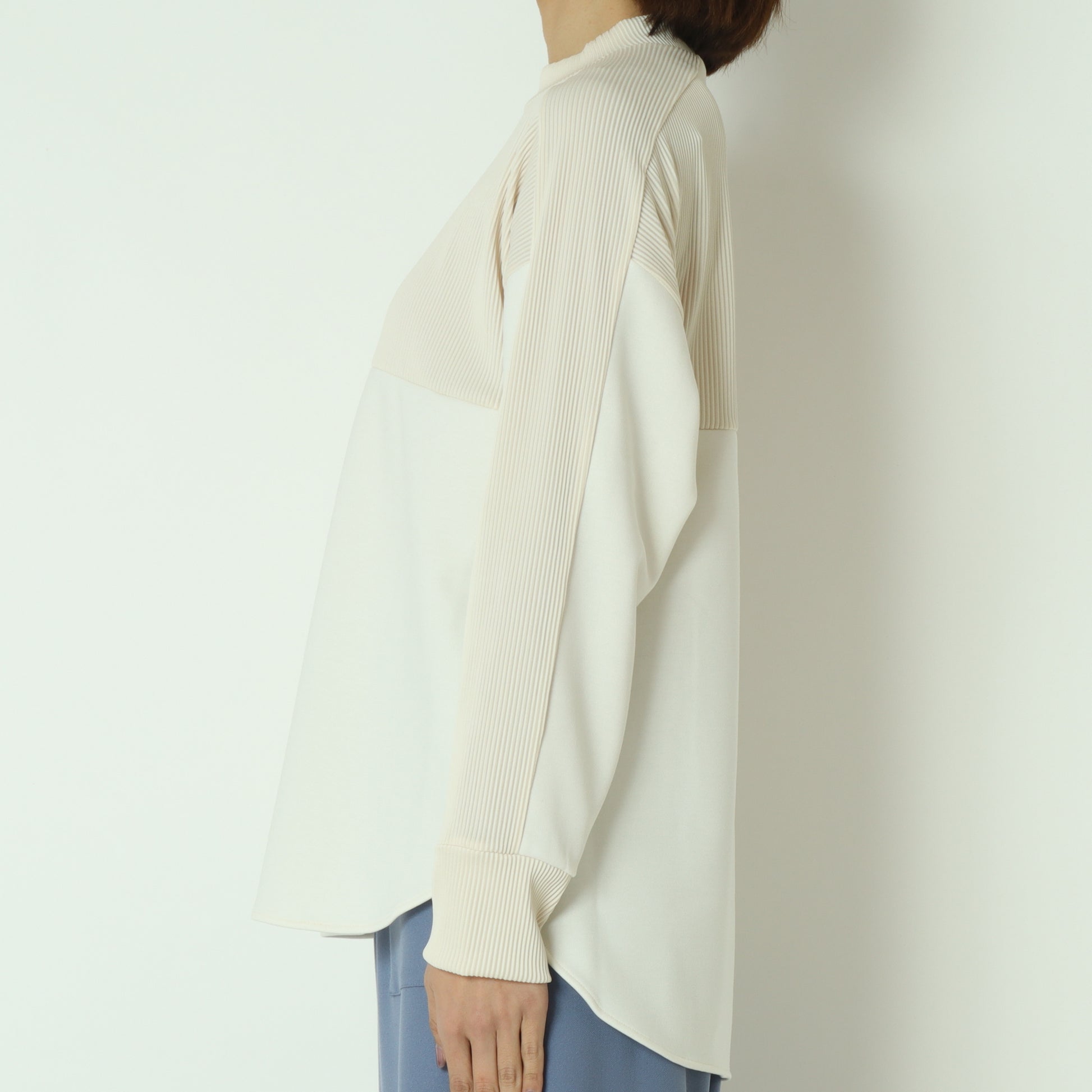 身頃上部と袖、袖口にリブ素材が切り替えでデザインされている長袖のカットソー。