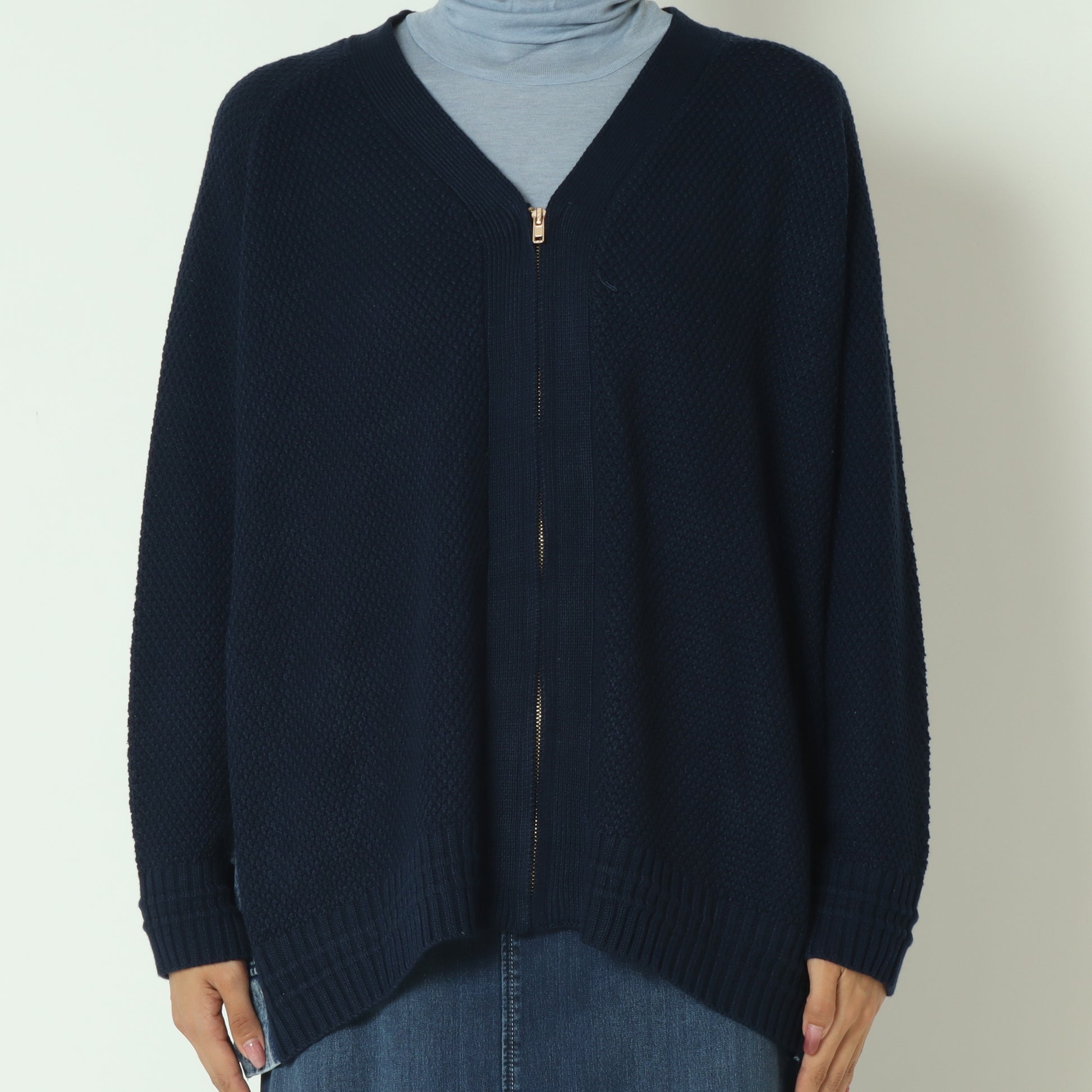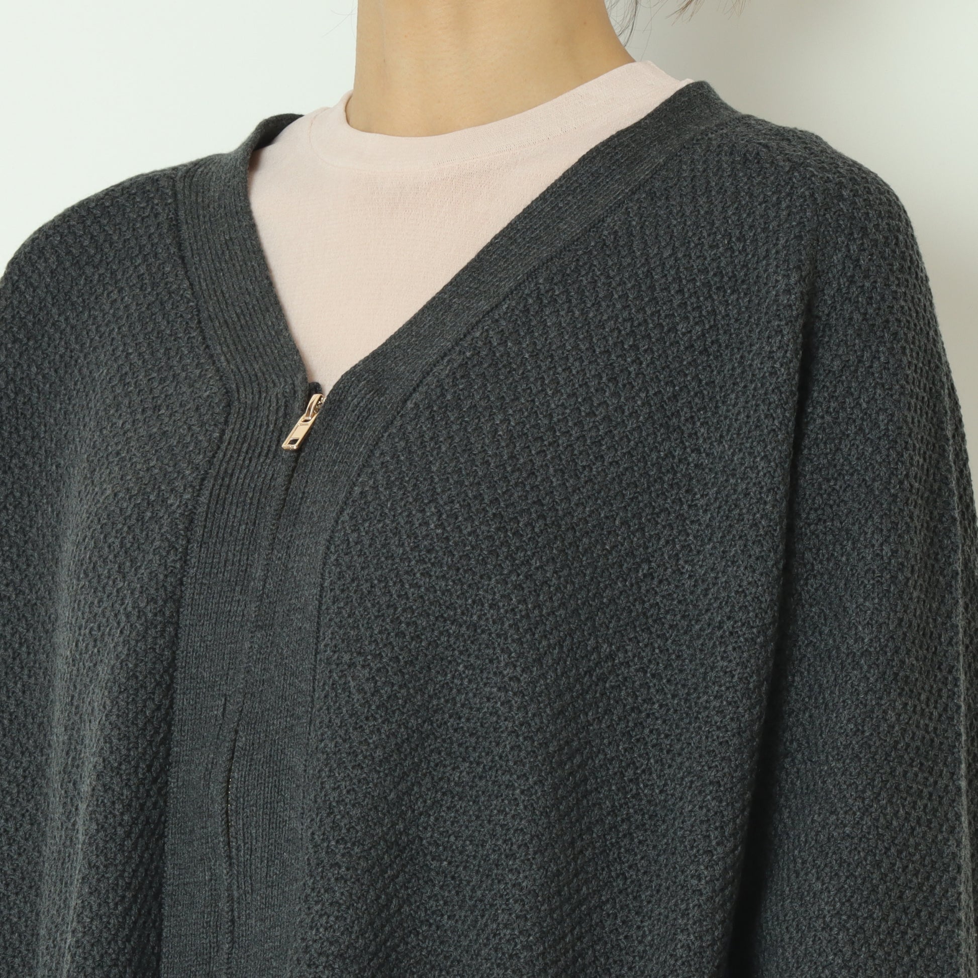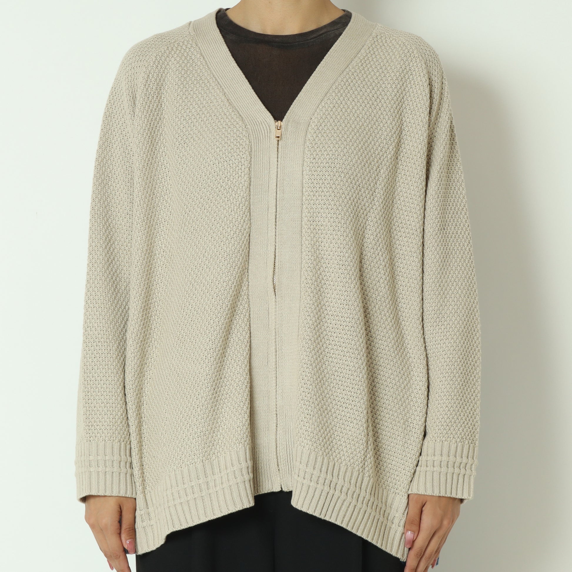 Vネックとジップファスナーがスタイリッシュな印象を与え、カジュアルでありながらも上品さを感じさせるデザインです。