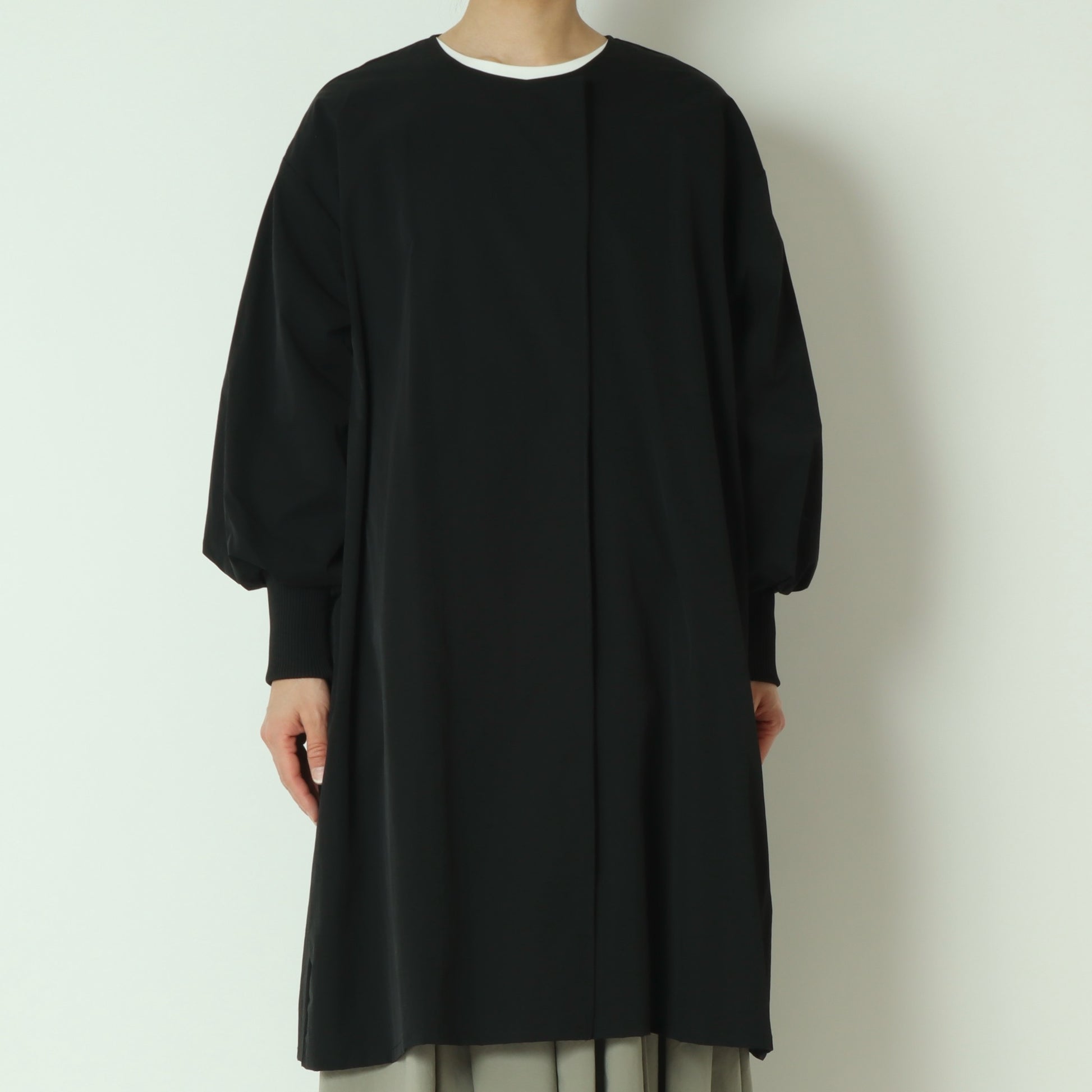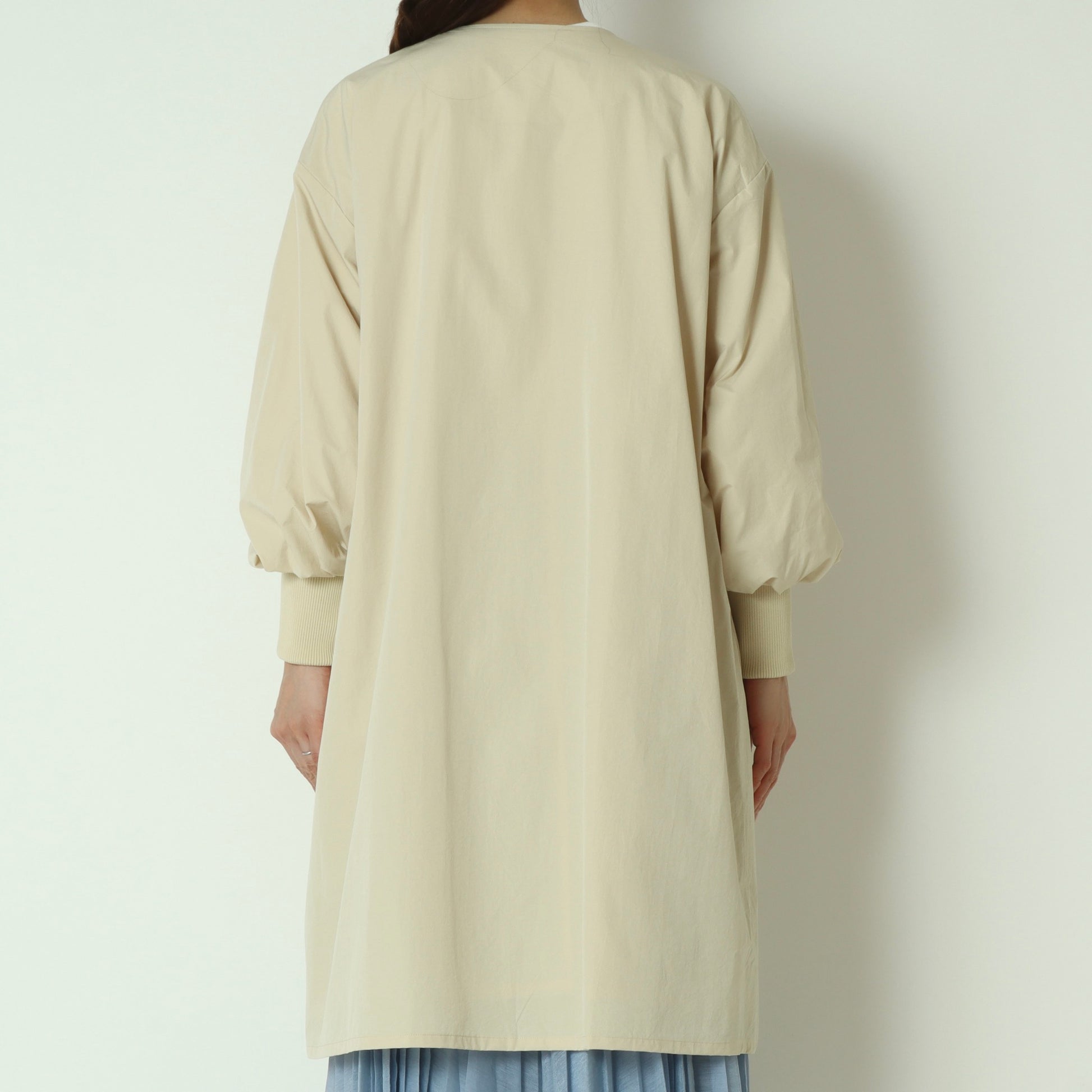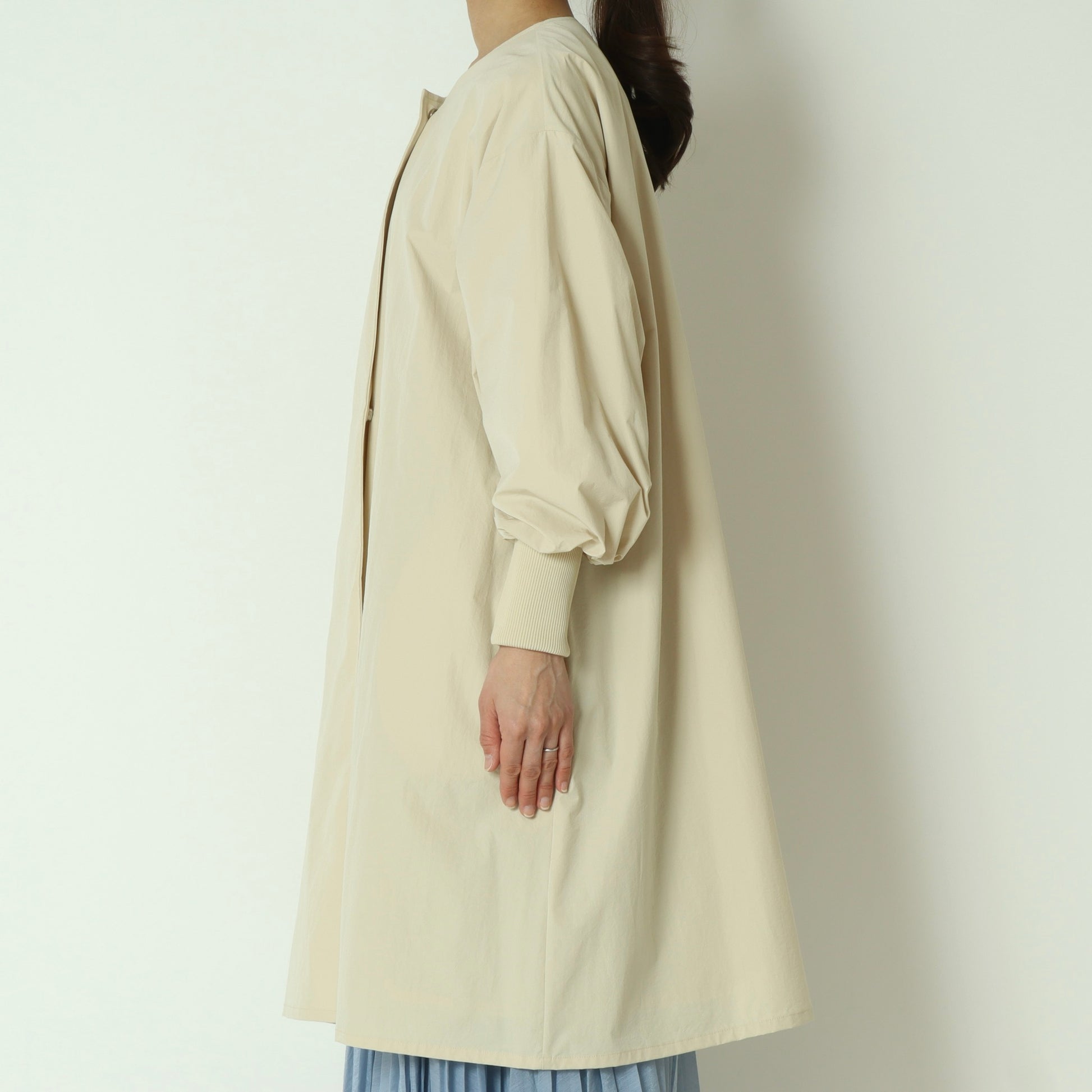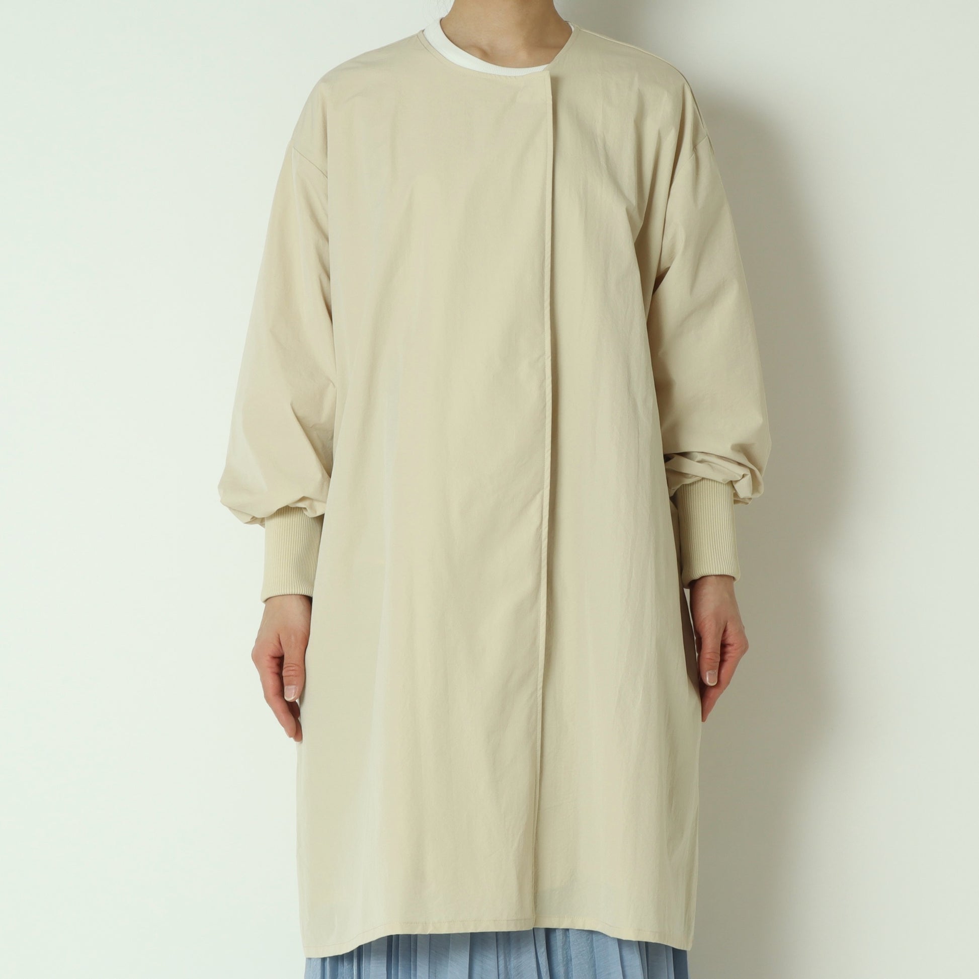 ライトに着こなせるリブ袖ノーカラーカラーコート。