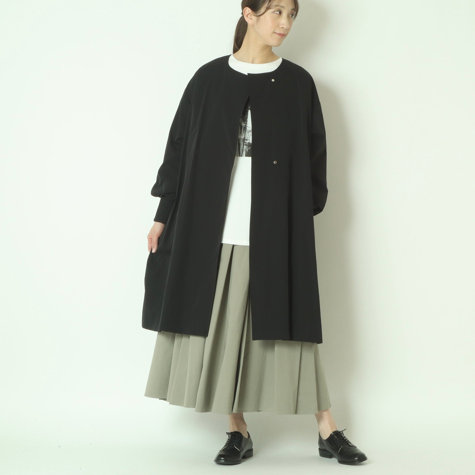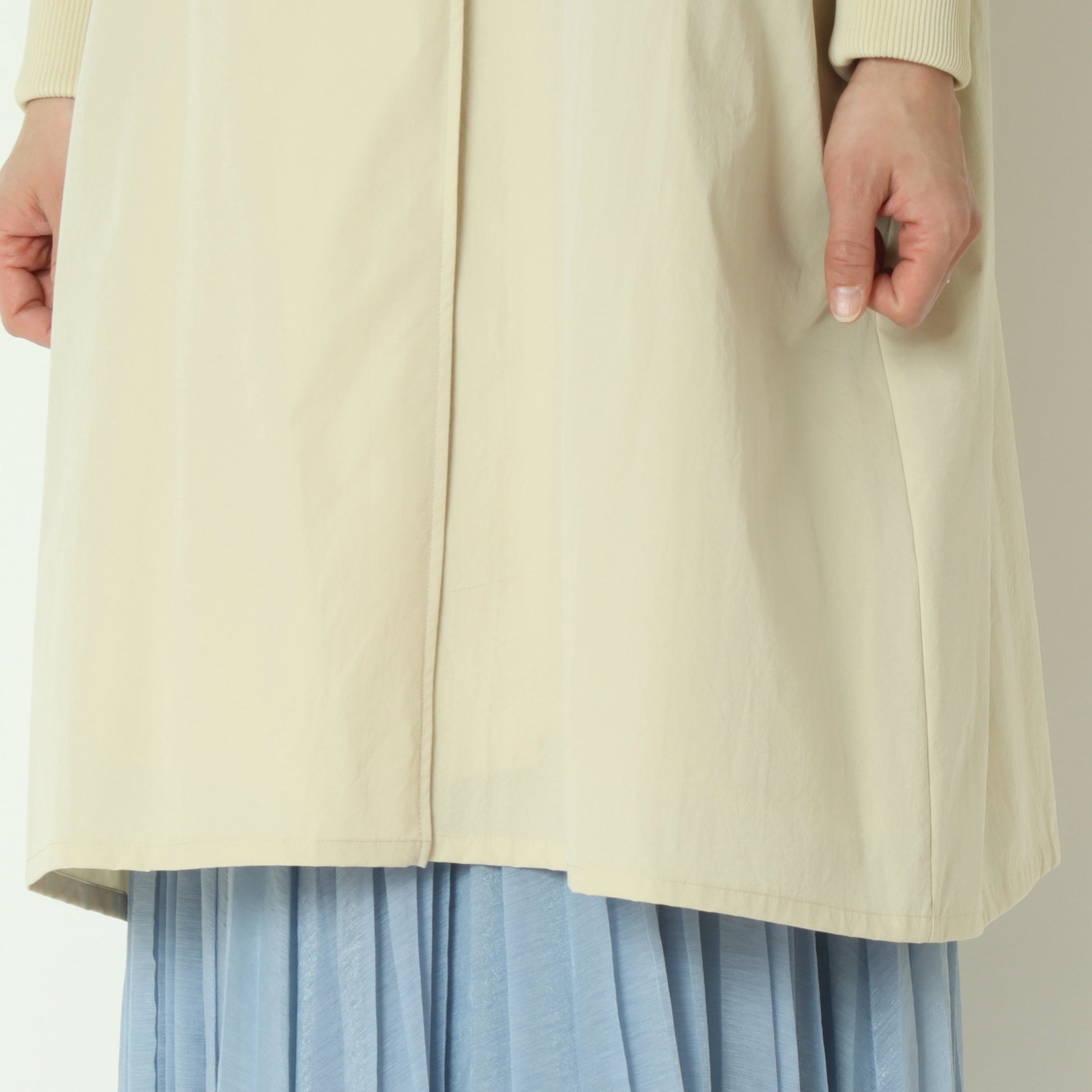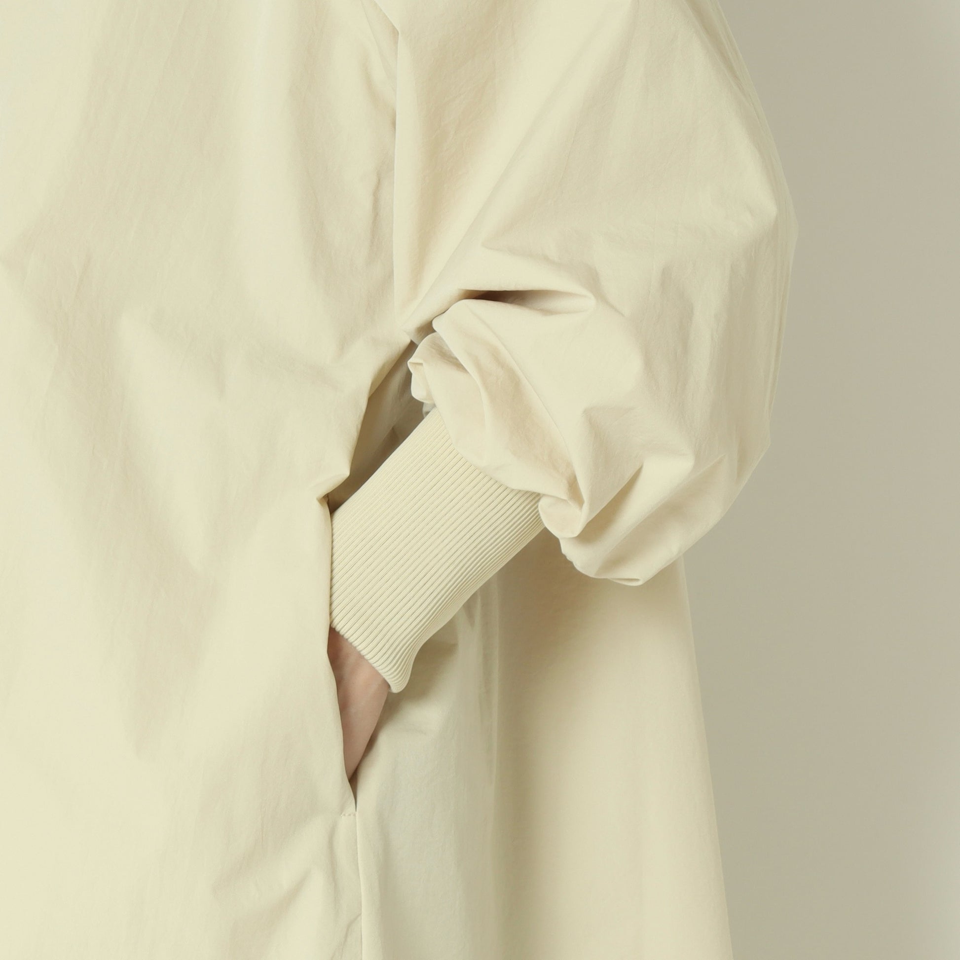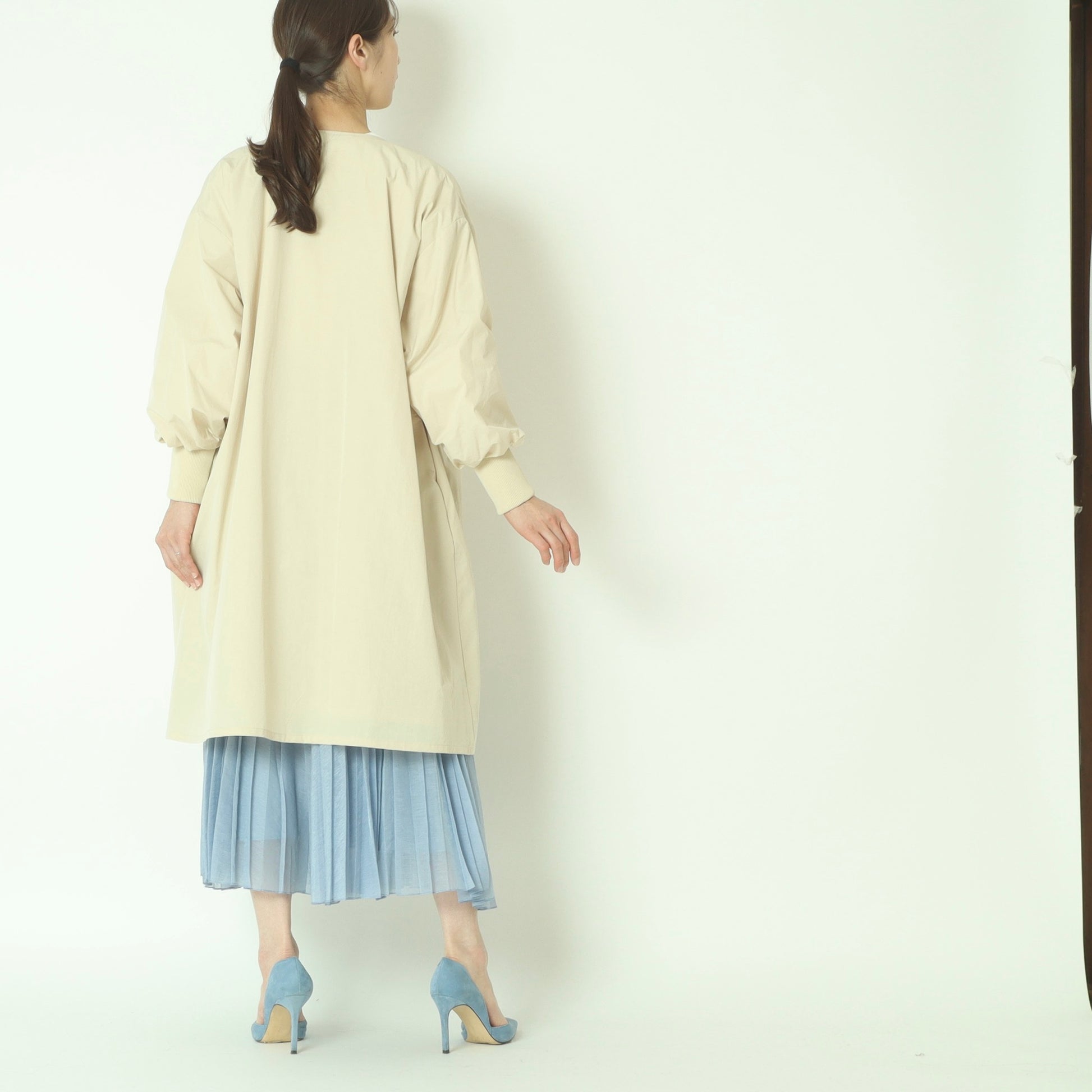 ライトに着こなせるリブ袖ノーカラーカラーコート。