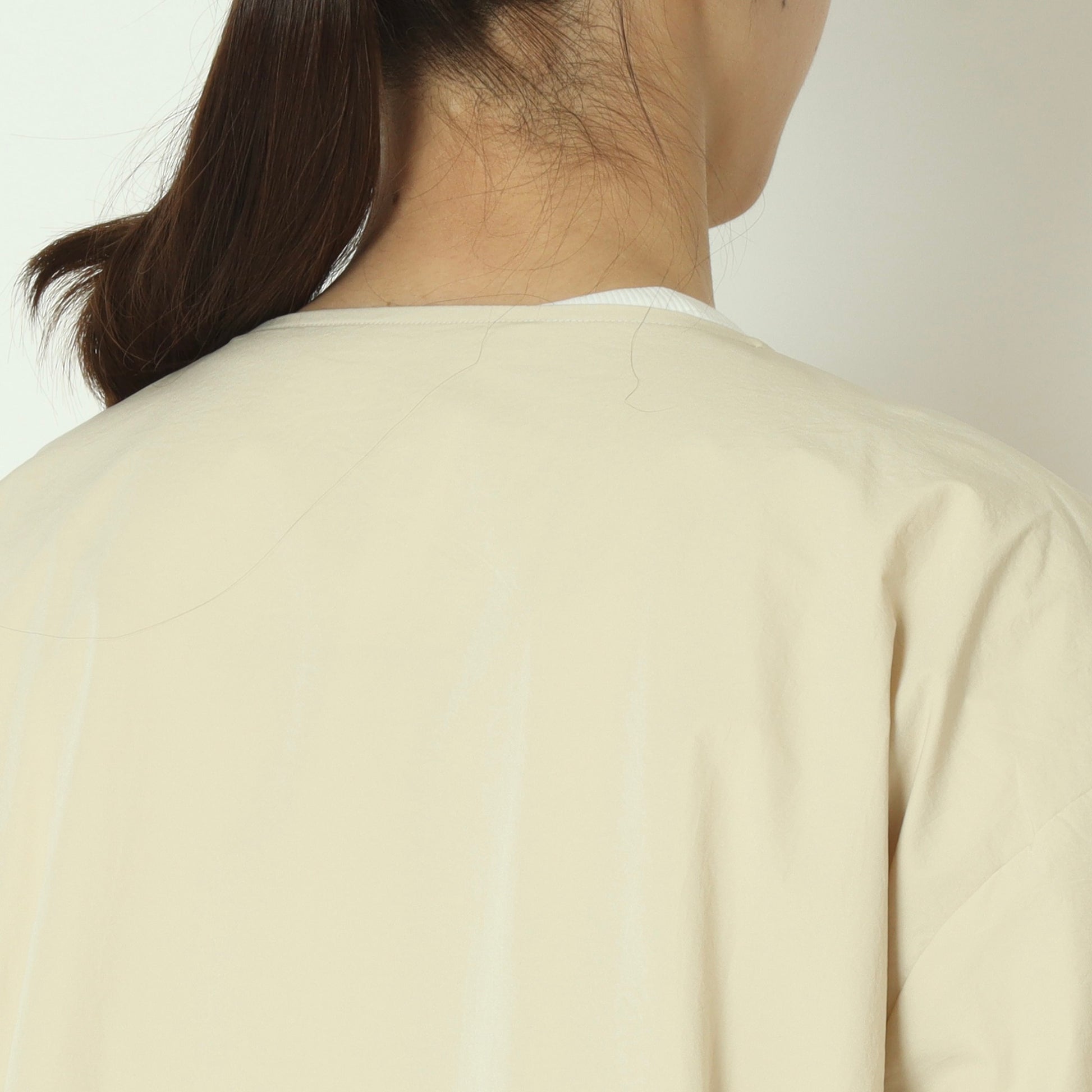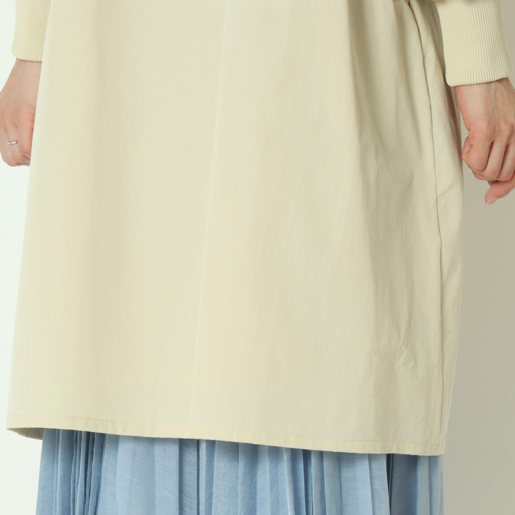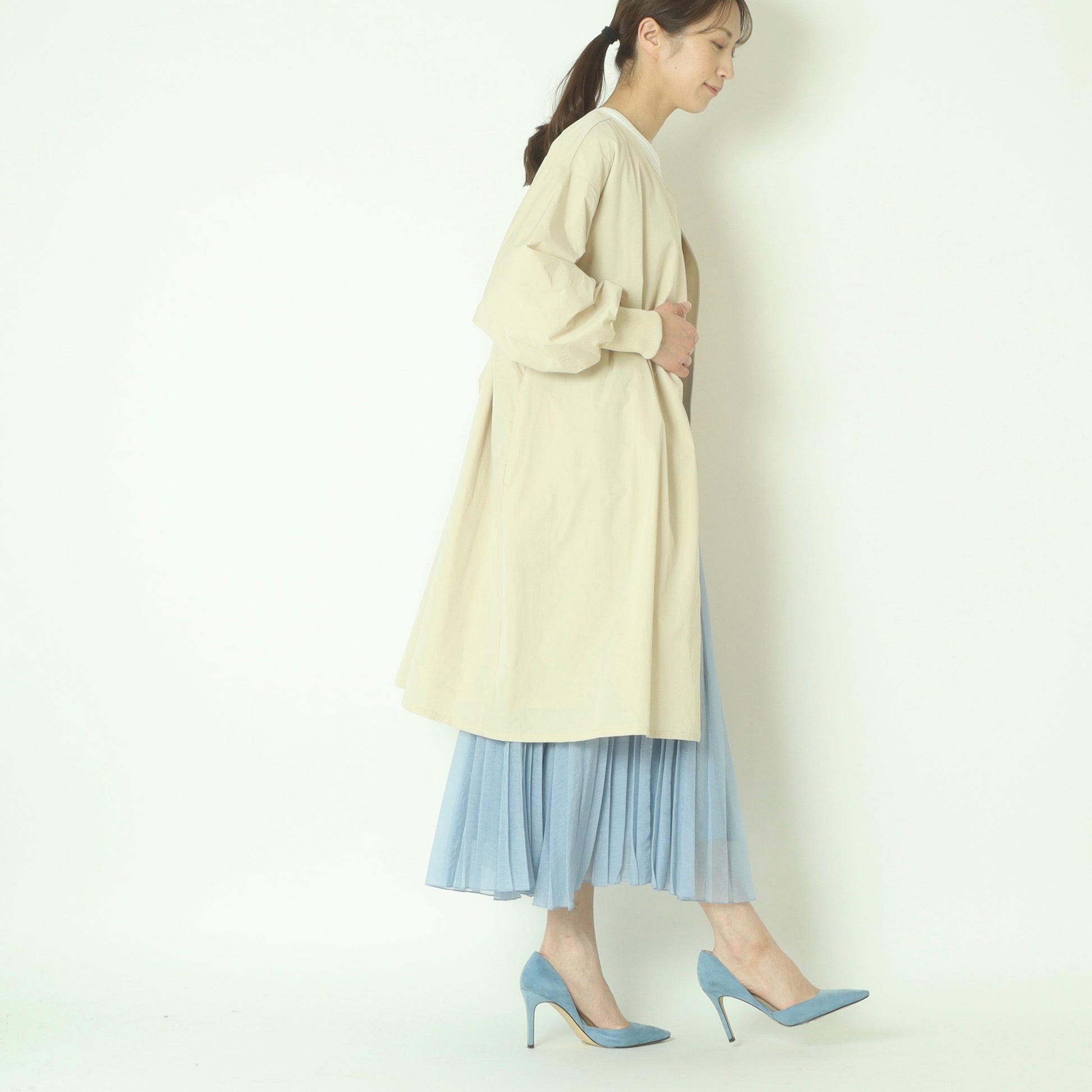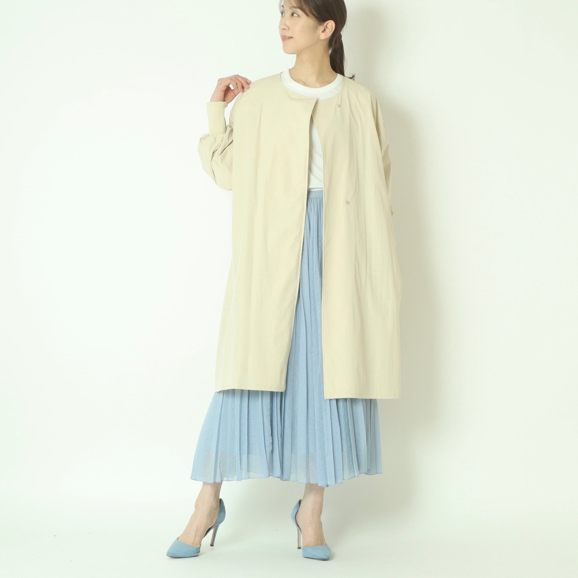ライトに着こなせるリブ袖ノーカラーカラーコート。