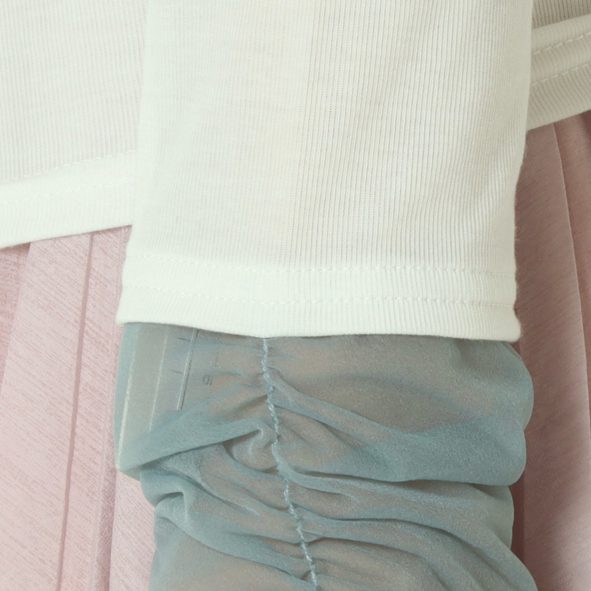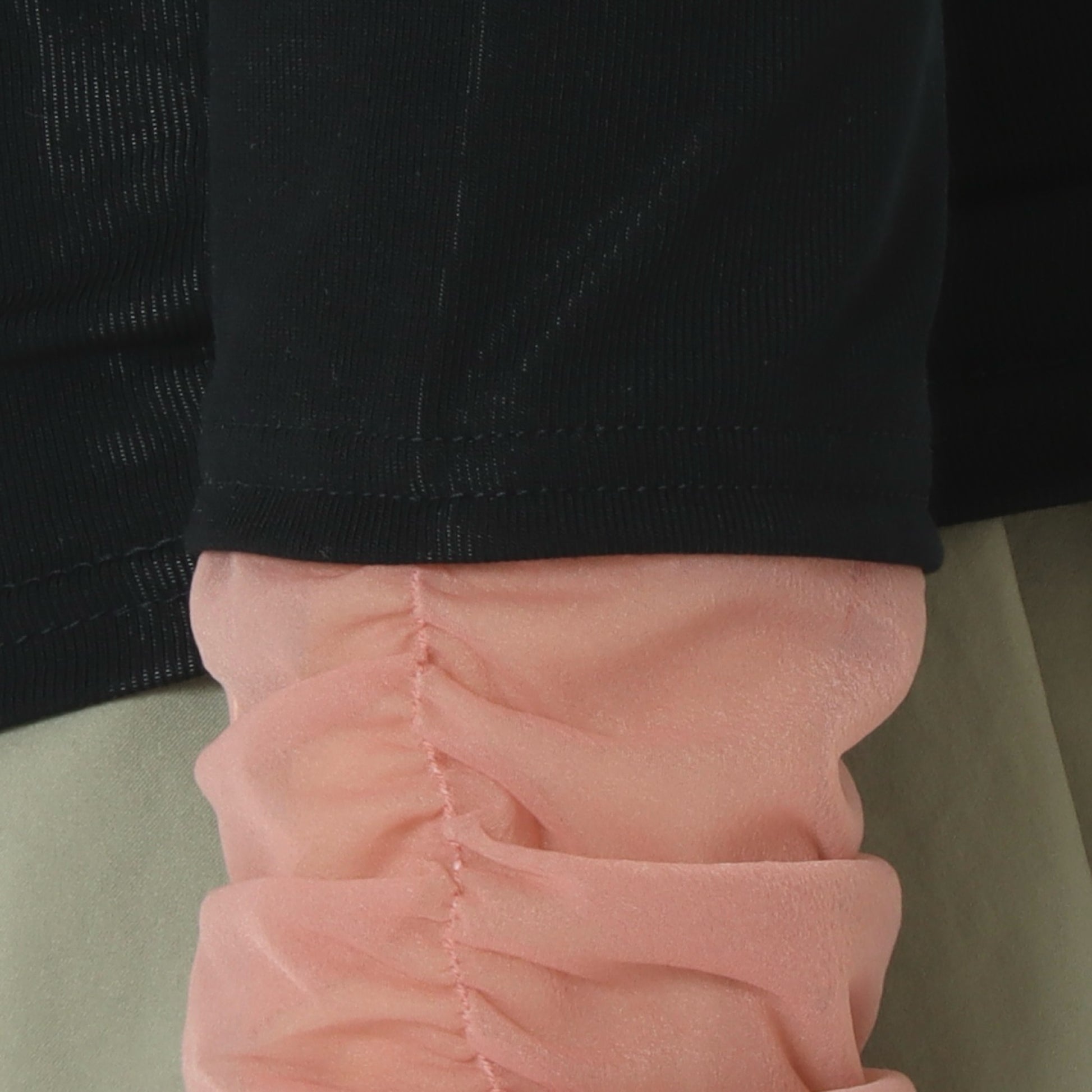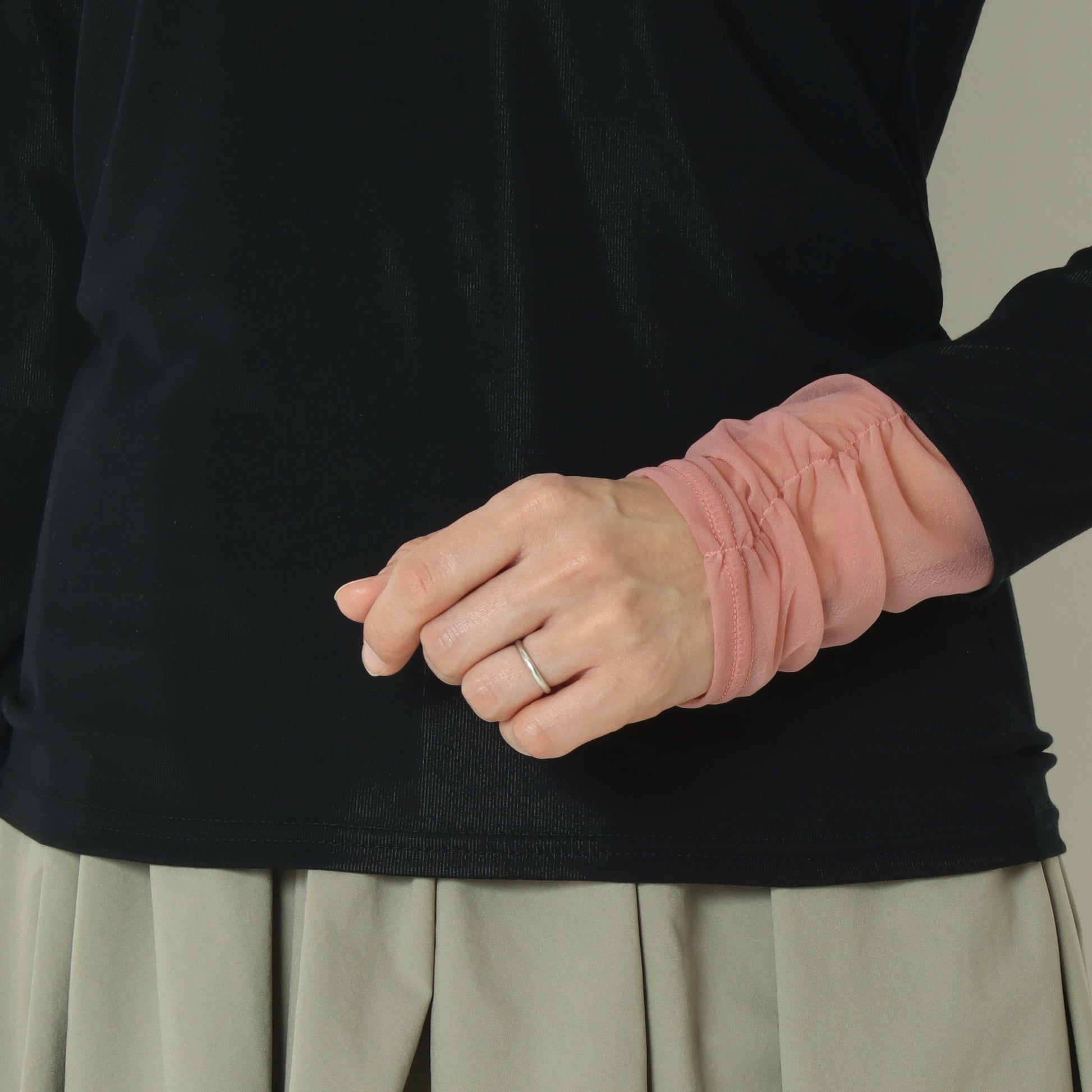 シフォンレースにシャーリングを施してクシュっとさせることで、甘さを抑え、大人っぽく落ち着いたカラー配色がスタイリングに自然に馴染みます。