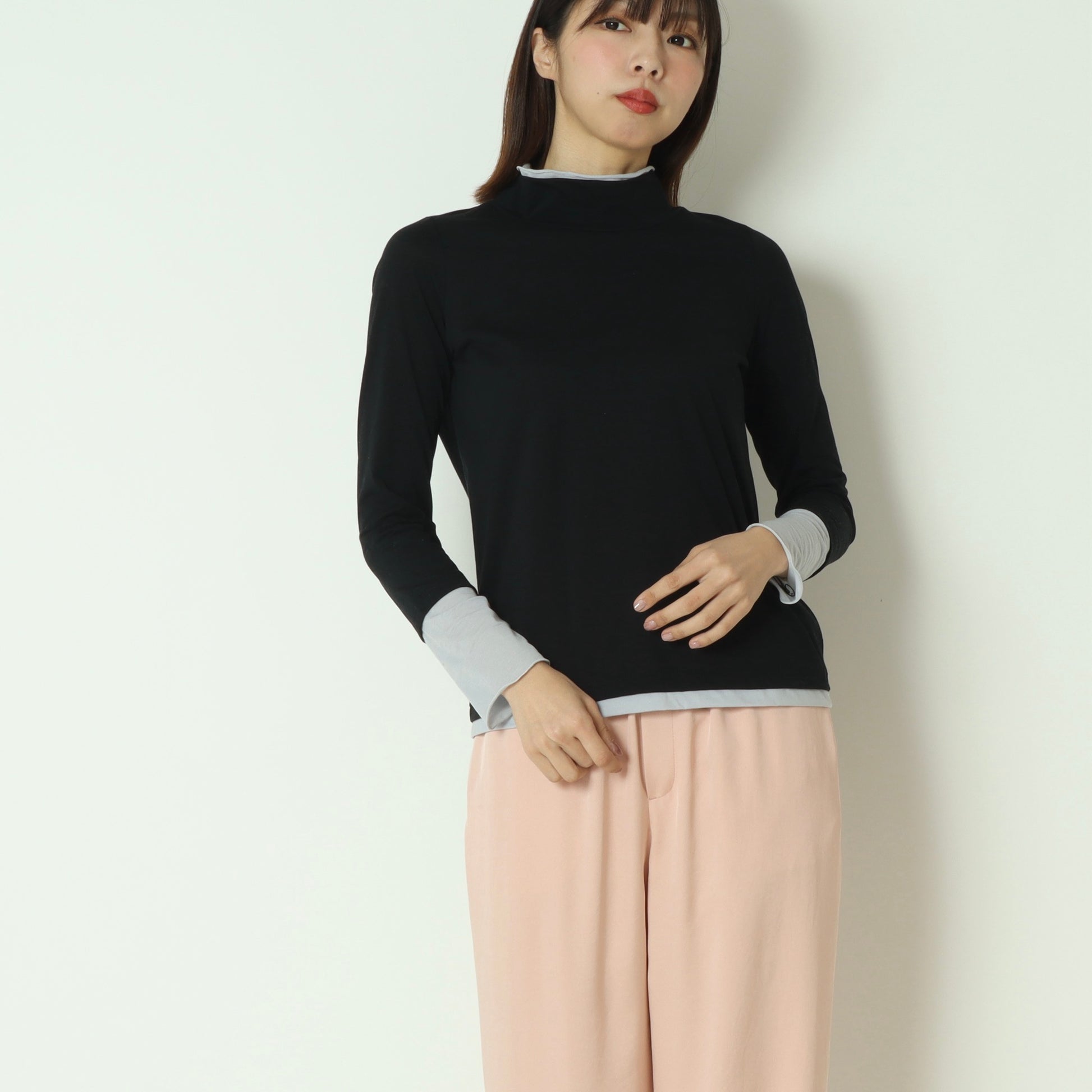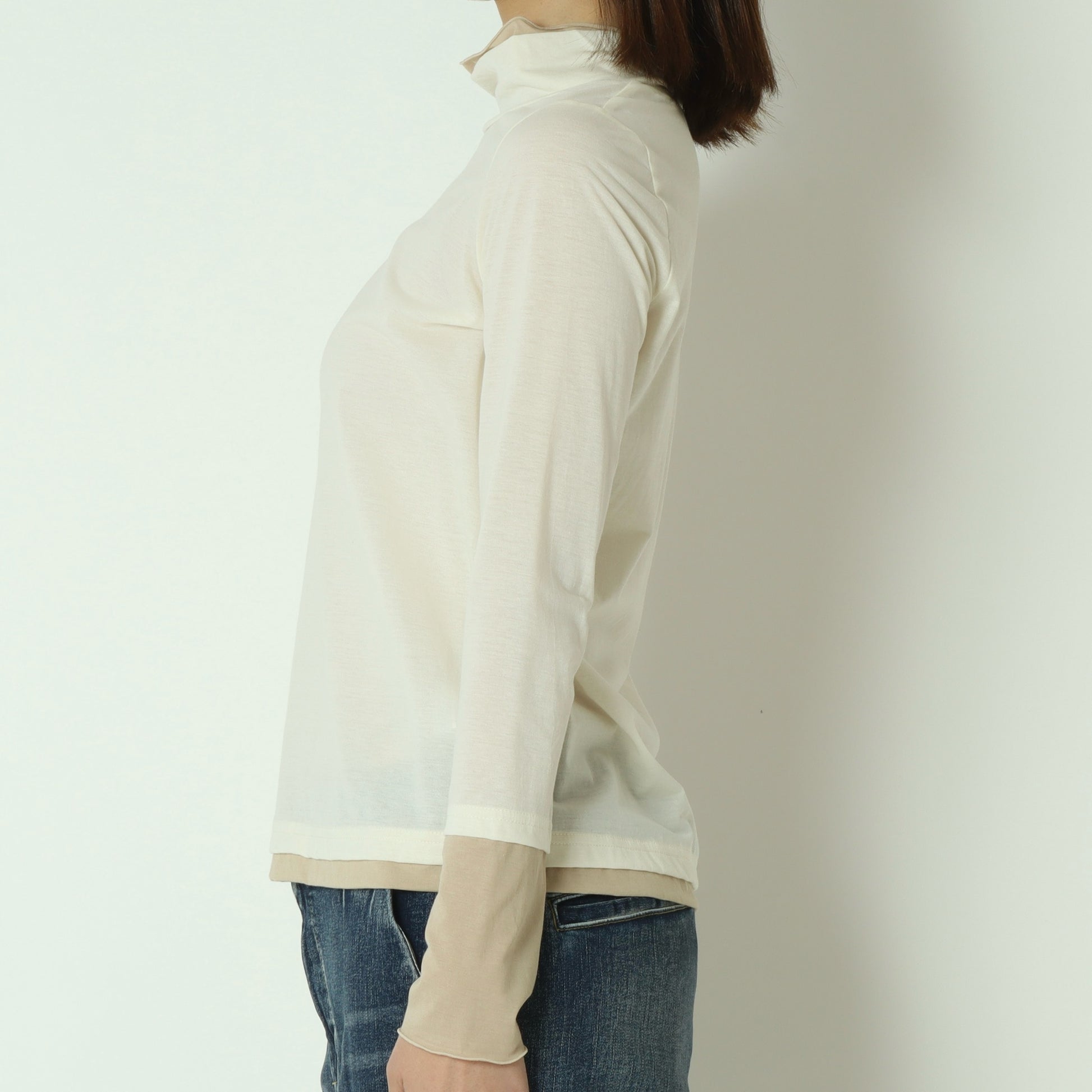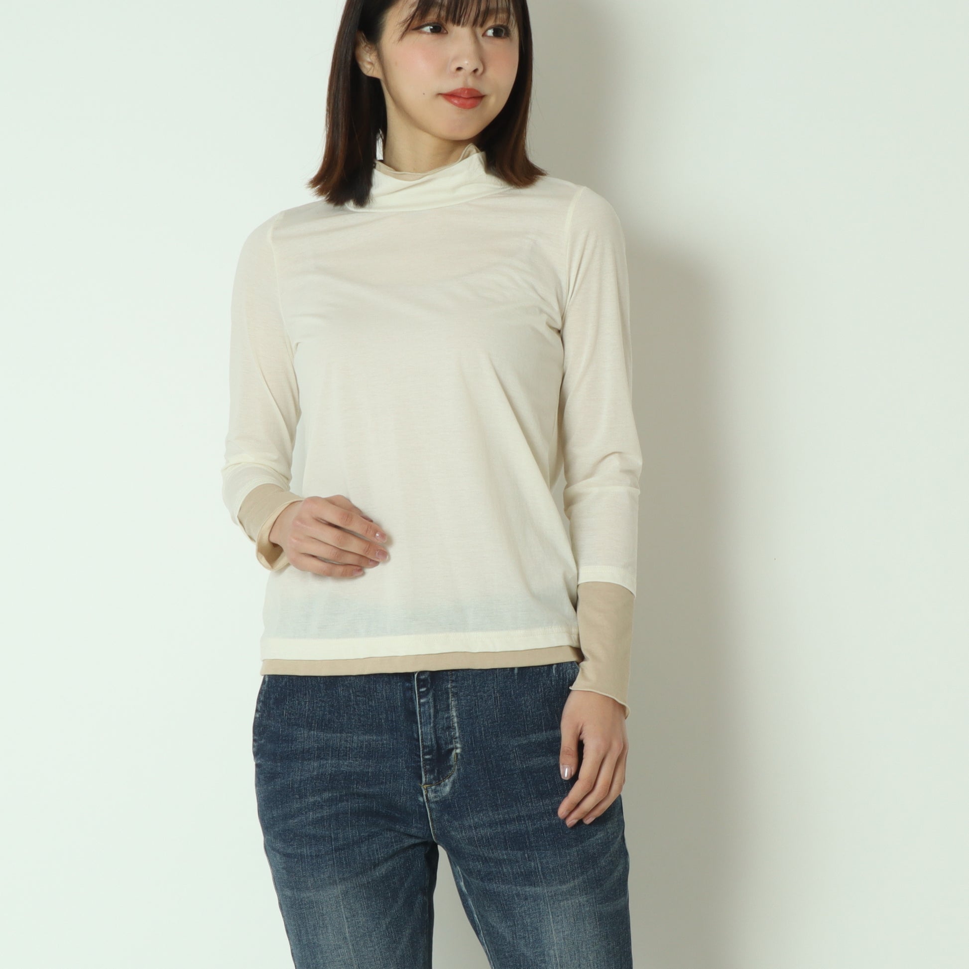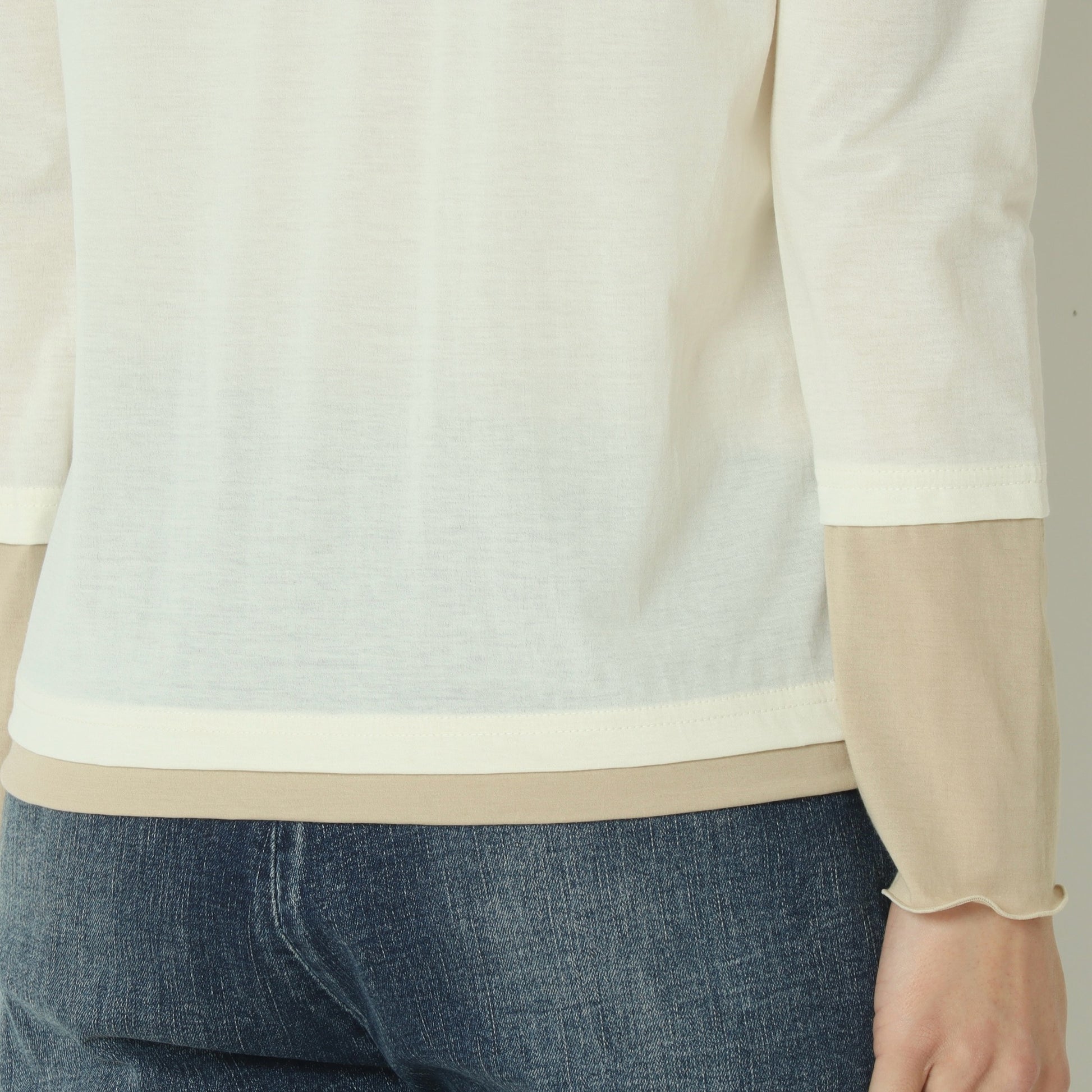 春夏シーズンにはキャミソールやタンクトップとのレイヤードスタイル、秋冬シーズンにはニットやスウェットのインナーとしてご活用いただけます。