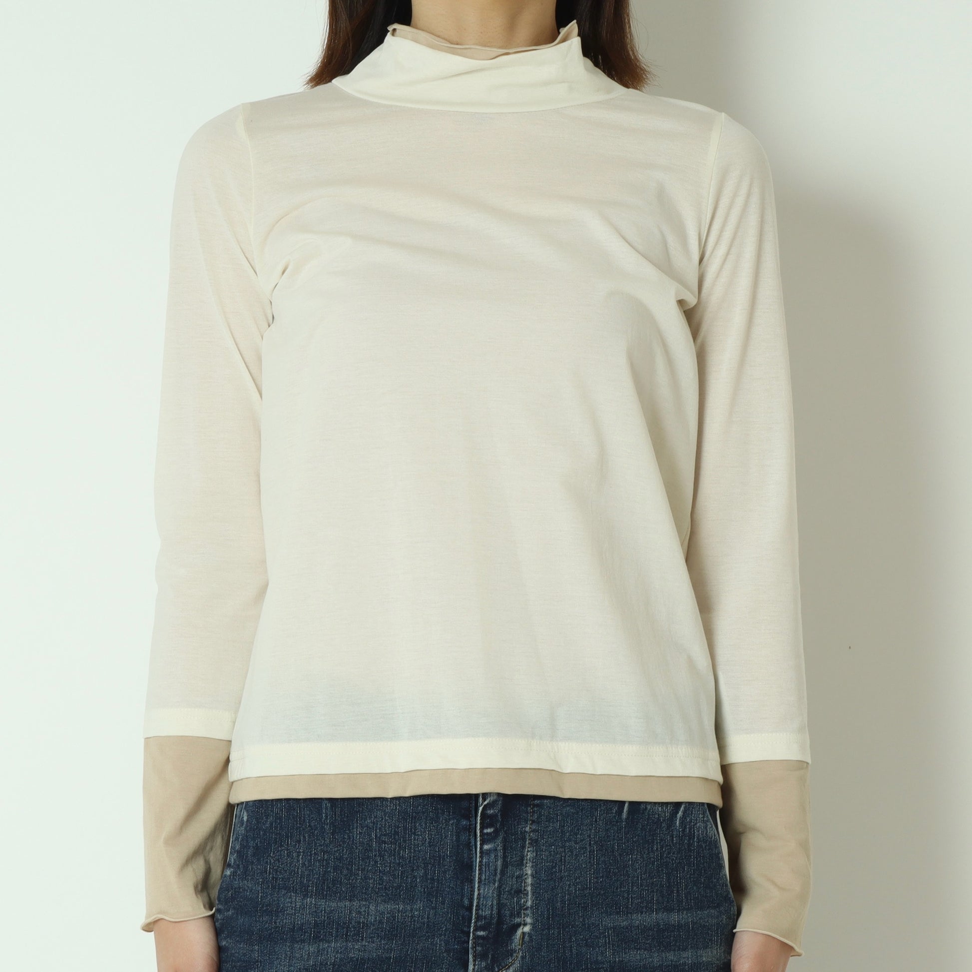 薄手のシースルー素材で、首元・袖・裾を配色で切り替えたメロウカットソー。