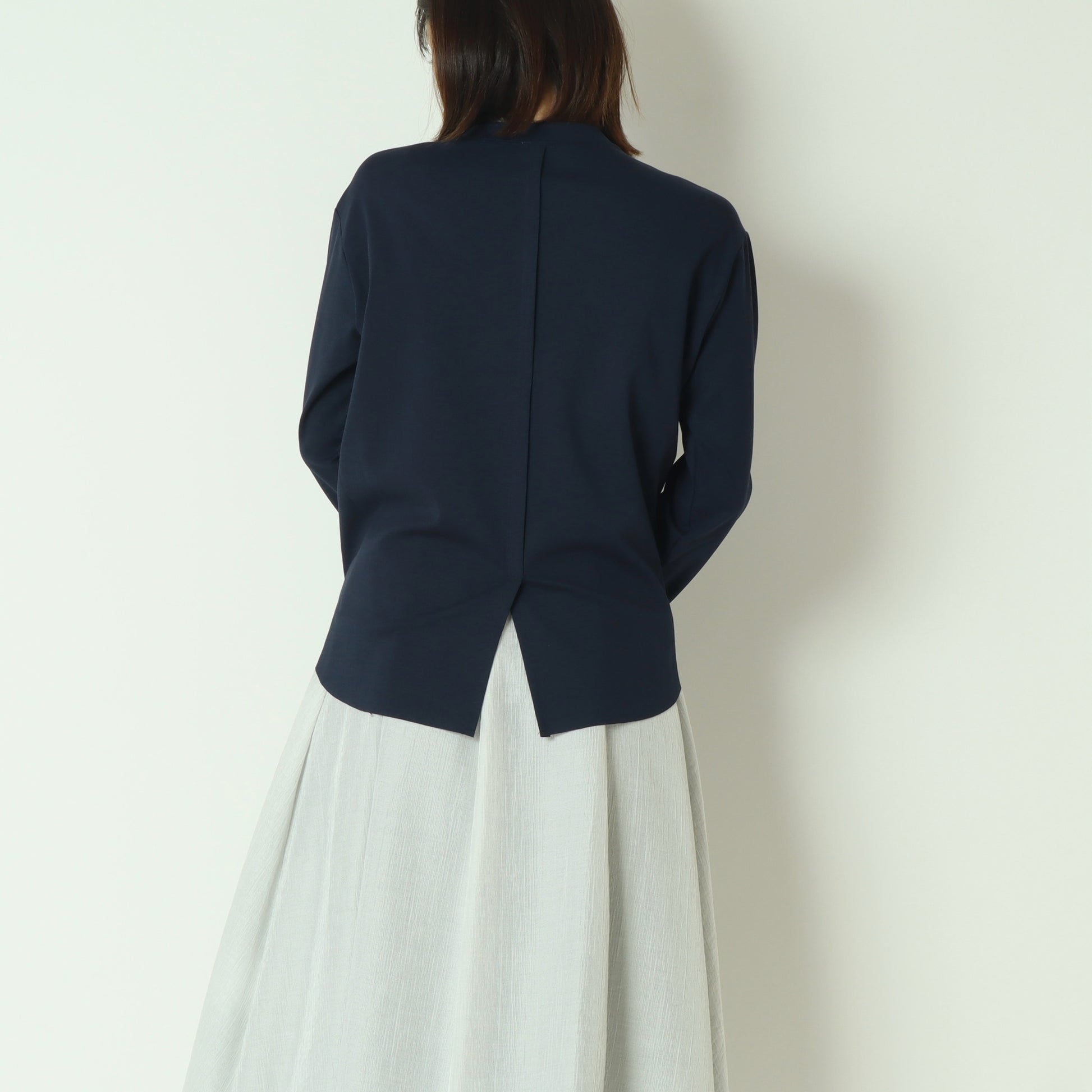 サイドから裾にかけての切替デザインや、バックスタイルの浅めスリット仕様がこなれ感を演出し、一枚で着てもサマになります。