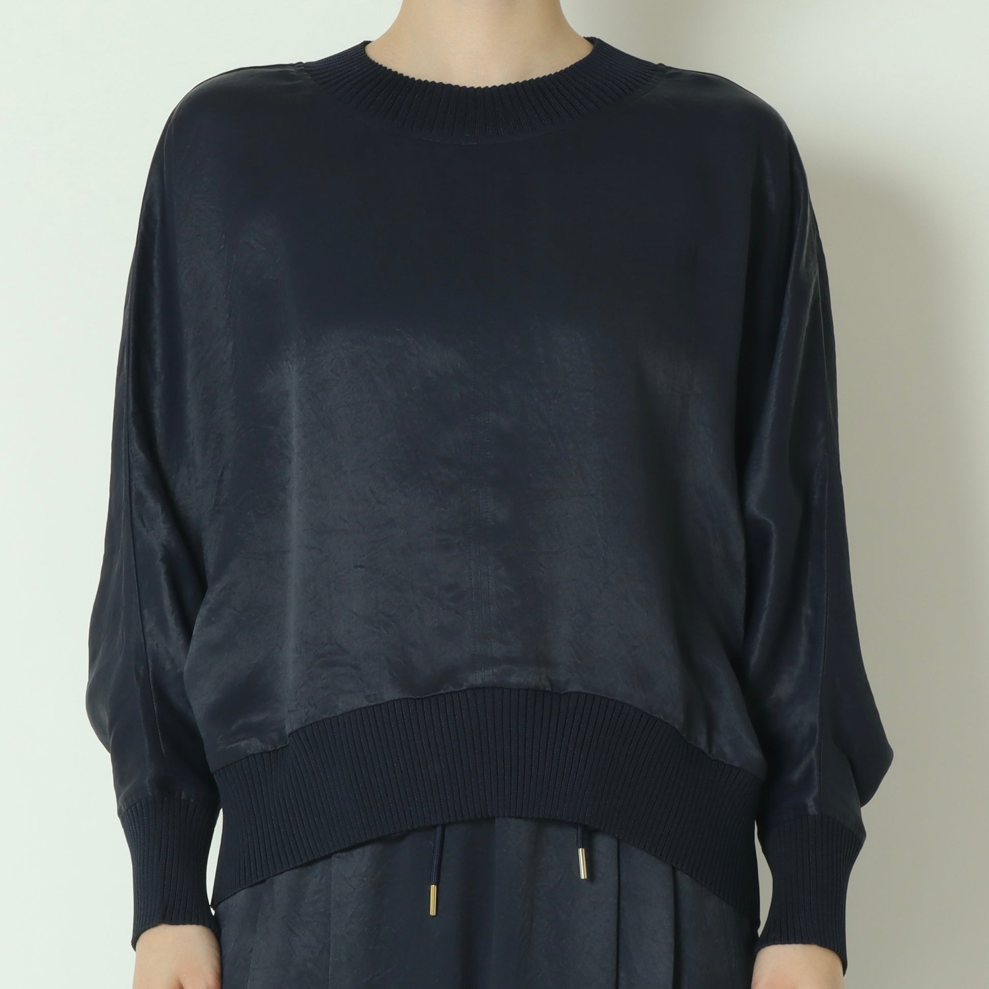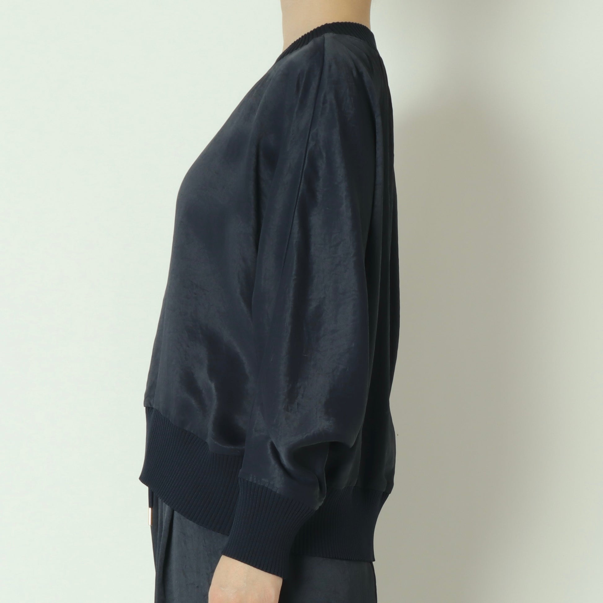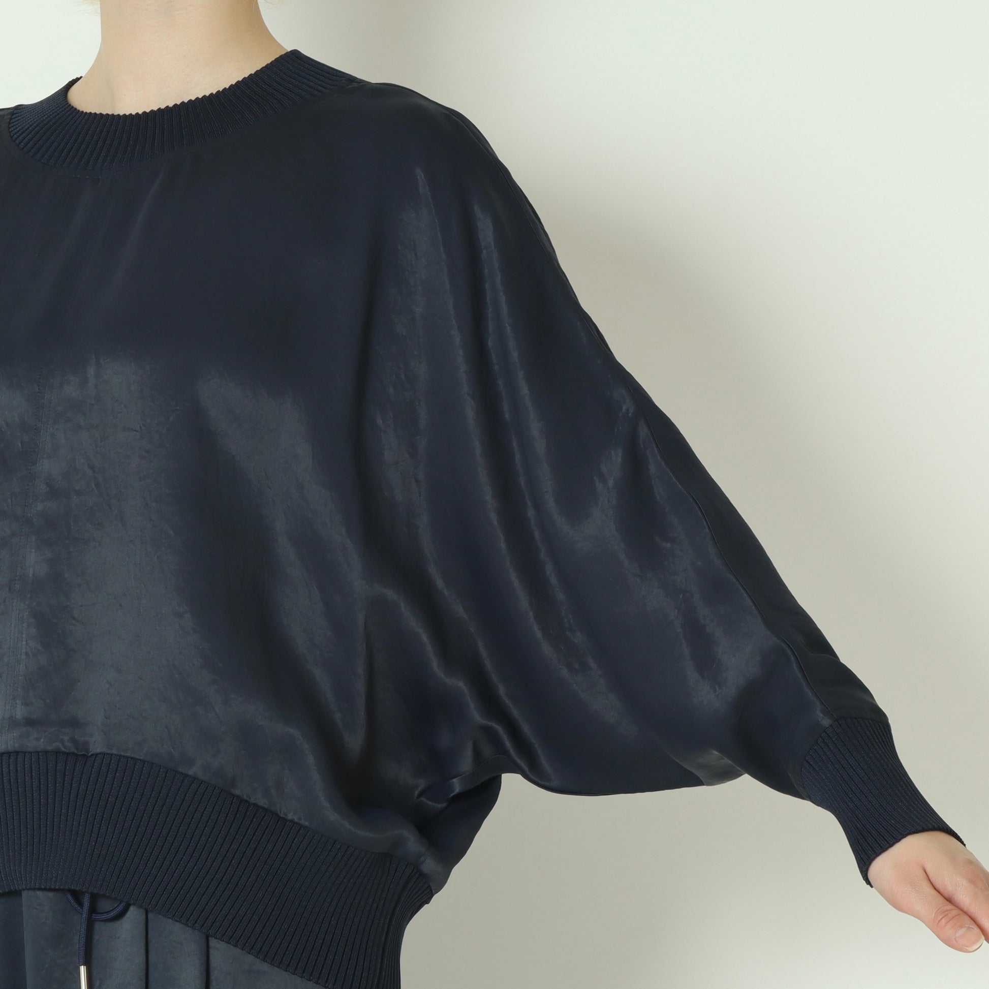 光沢のある上品な素材を使用した、大人っぽさのあるドルマンスリーブカットソー。