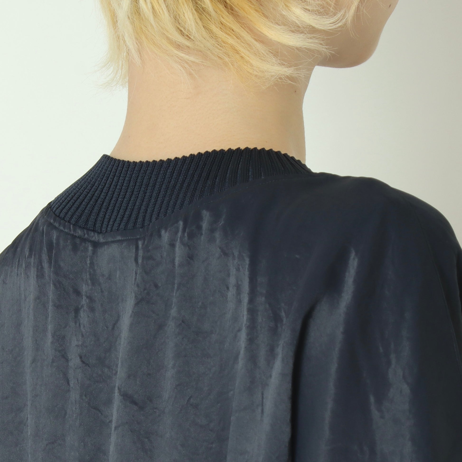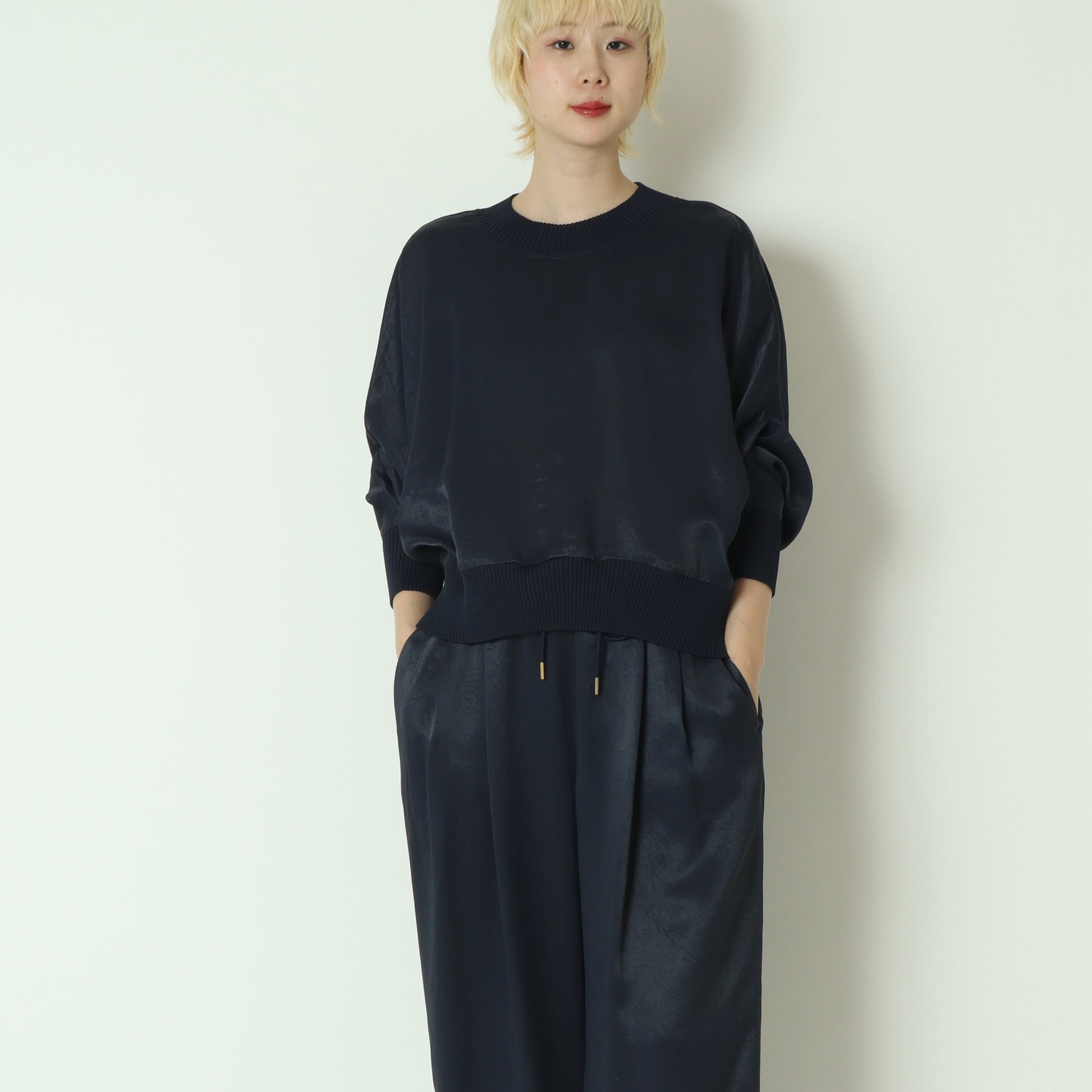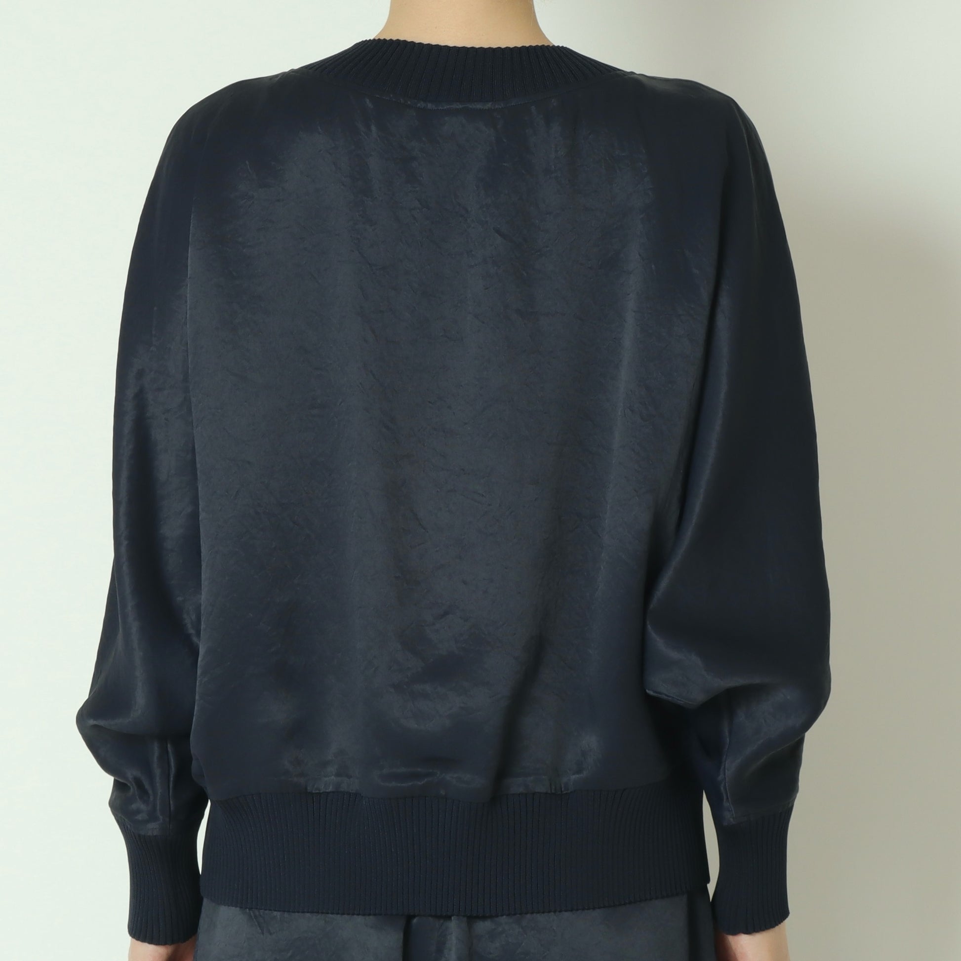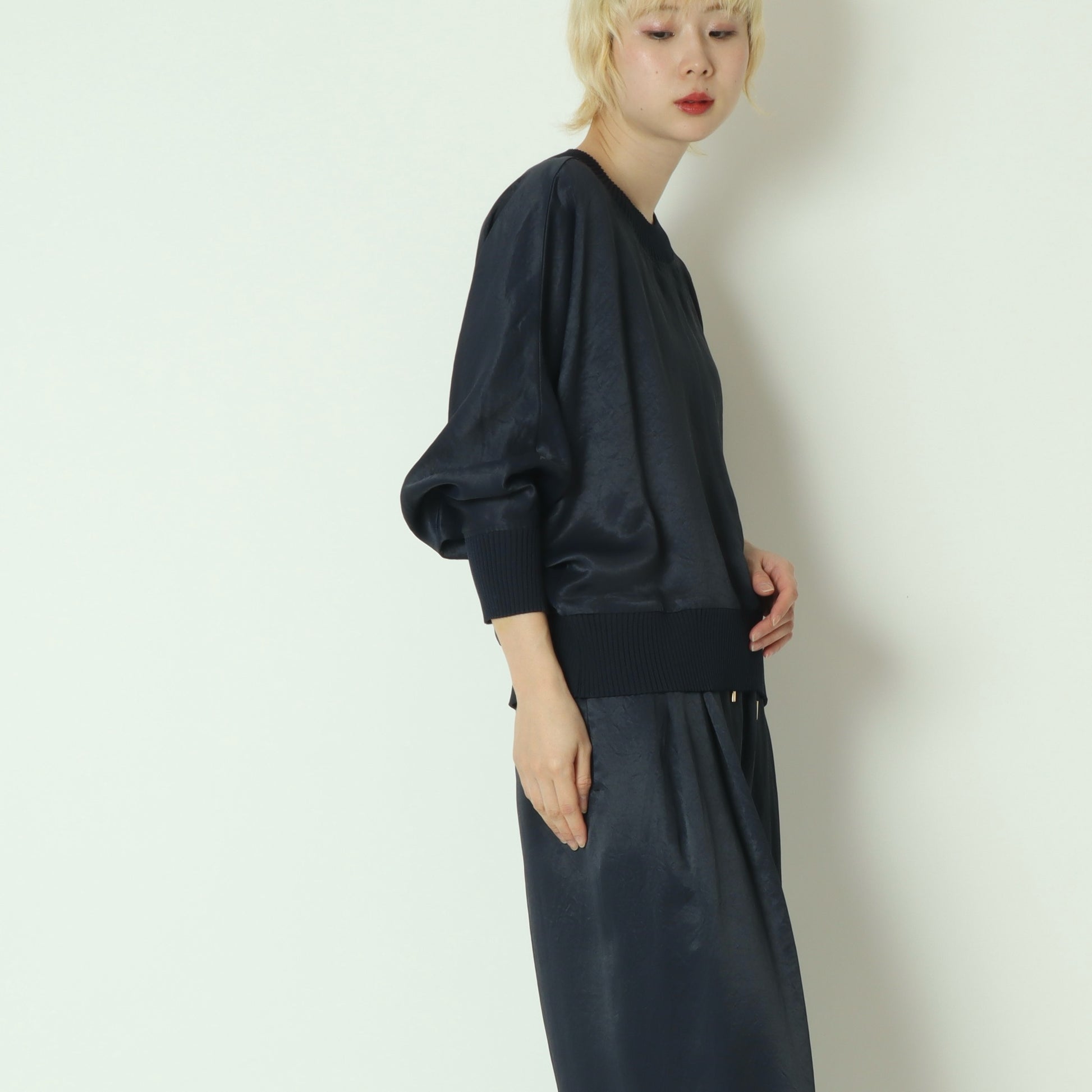 光沢のある上品な素材を使用した、大人っぽさのあるドルマンスリーブカットソー。