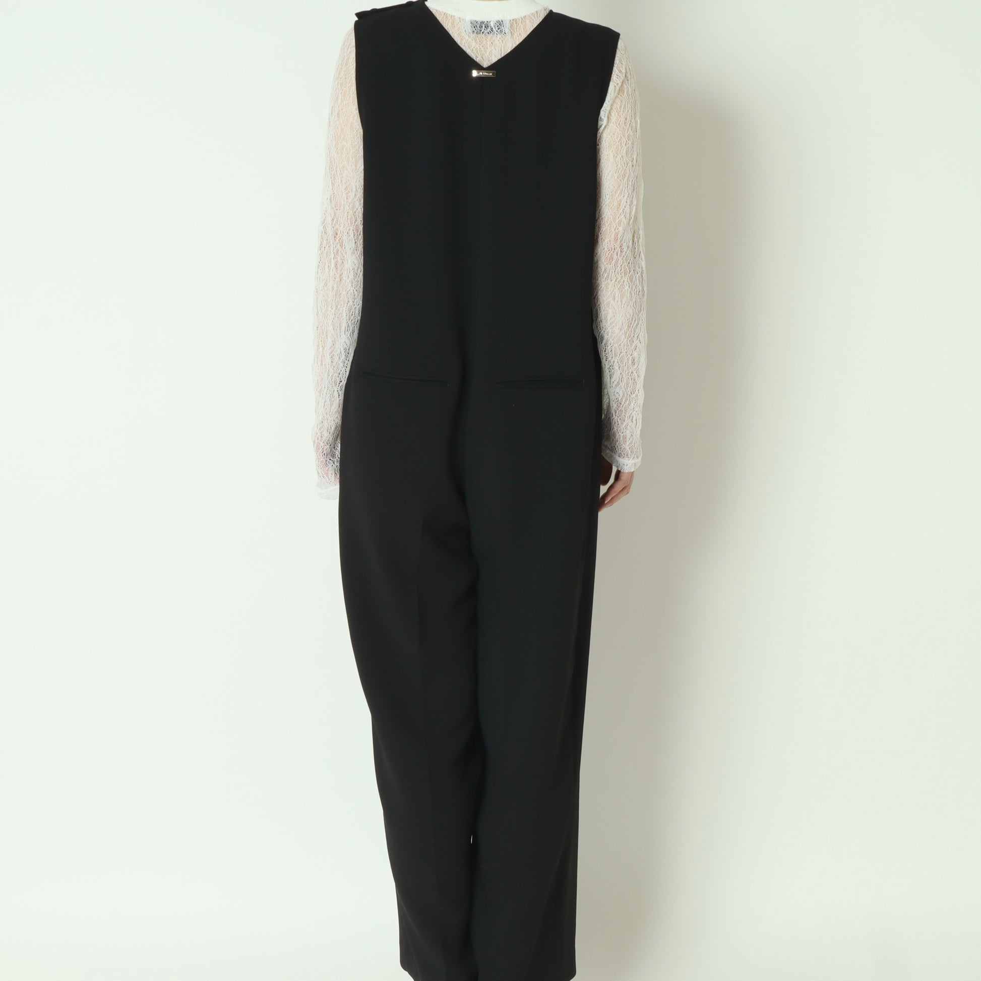 前後で表情の異なるネックデザインが魅力の、洗練された大人のオールインワン。