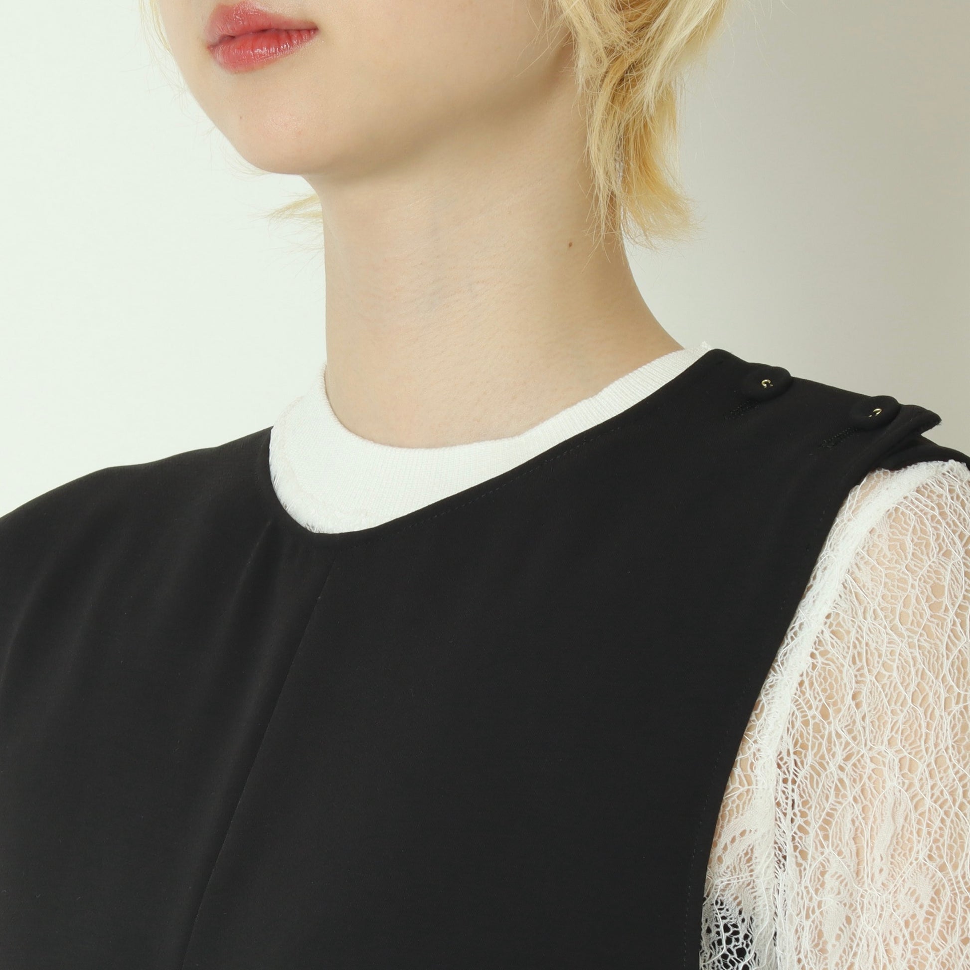左肩にはボタン開閉仕様を採用し、着脱のしやすさとデザイン性を両立◎