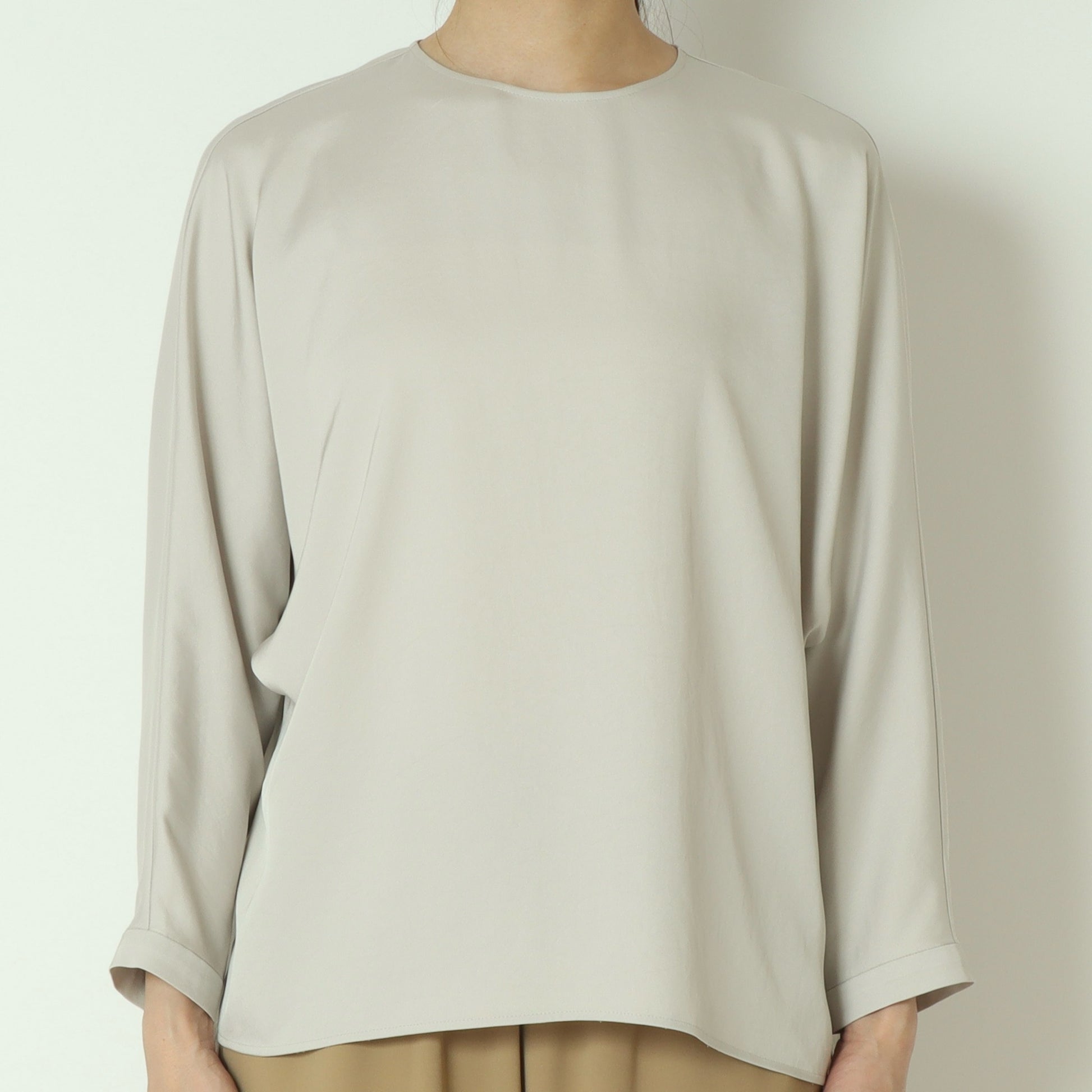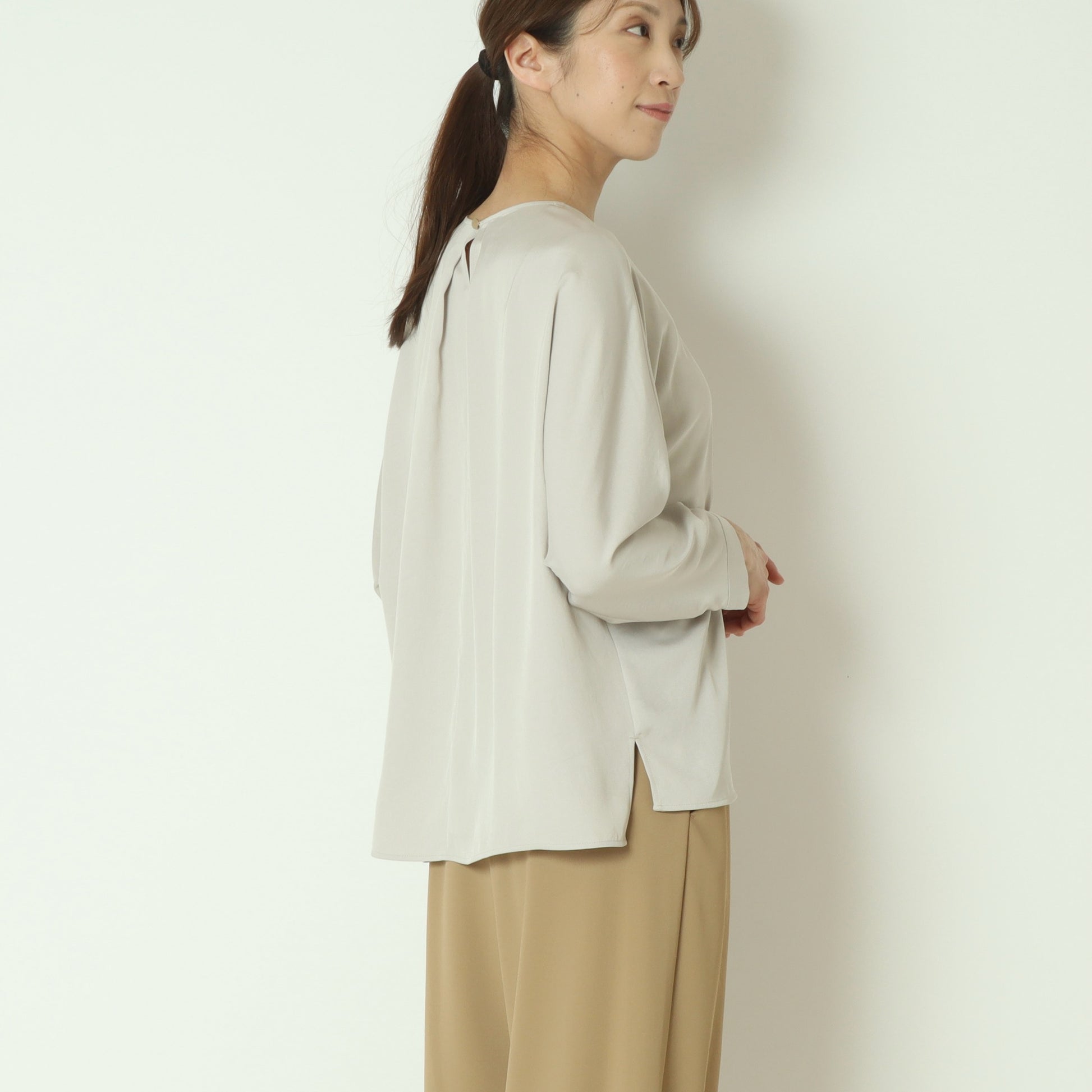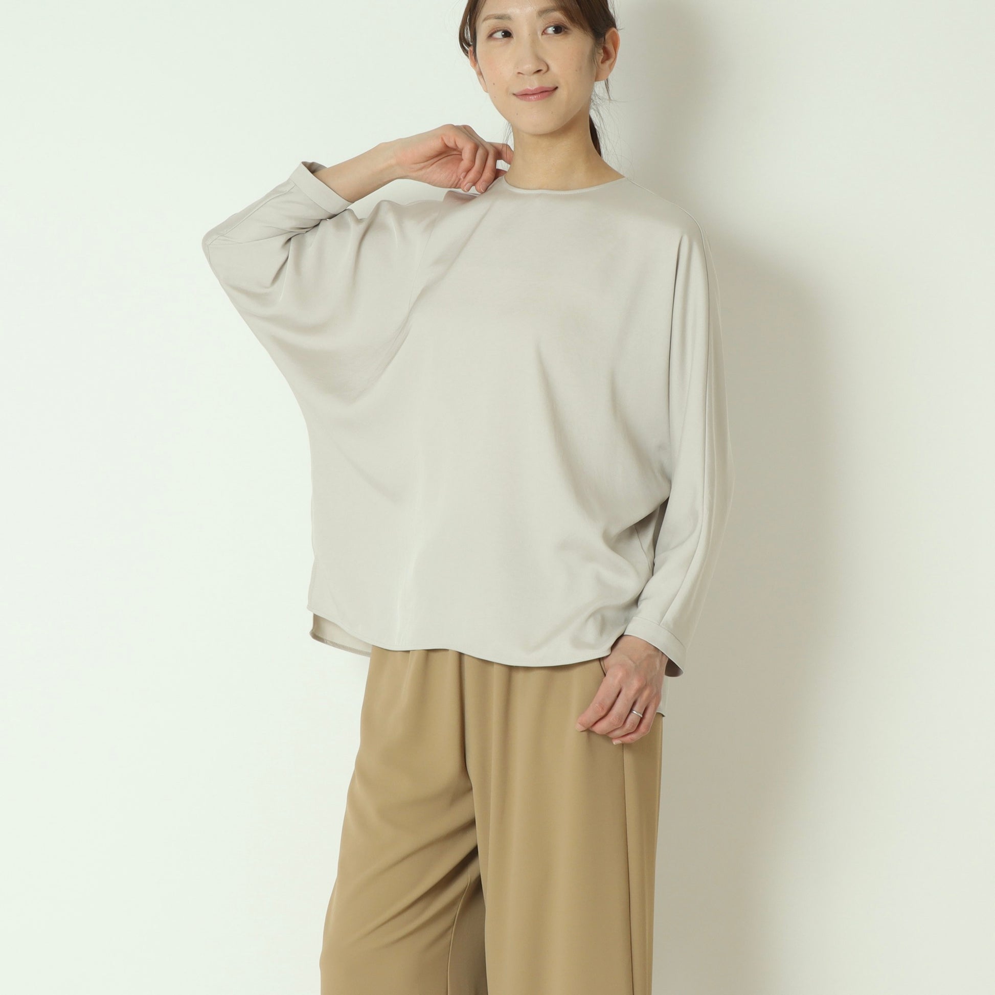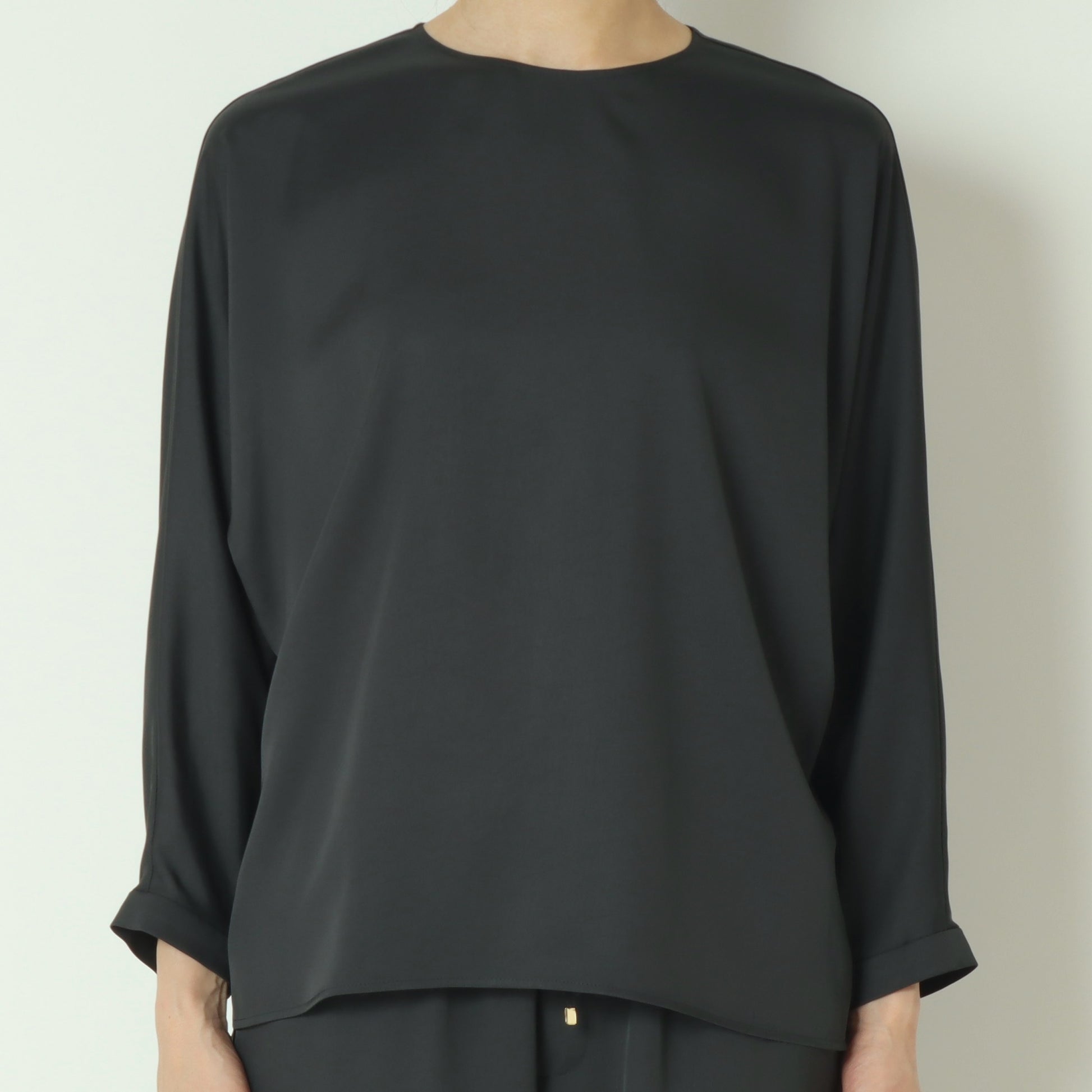 上品な光沢感が魅力のサテンツイル素材を使用したプルオーバーブラウス。