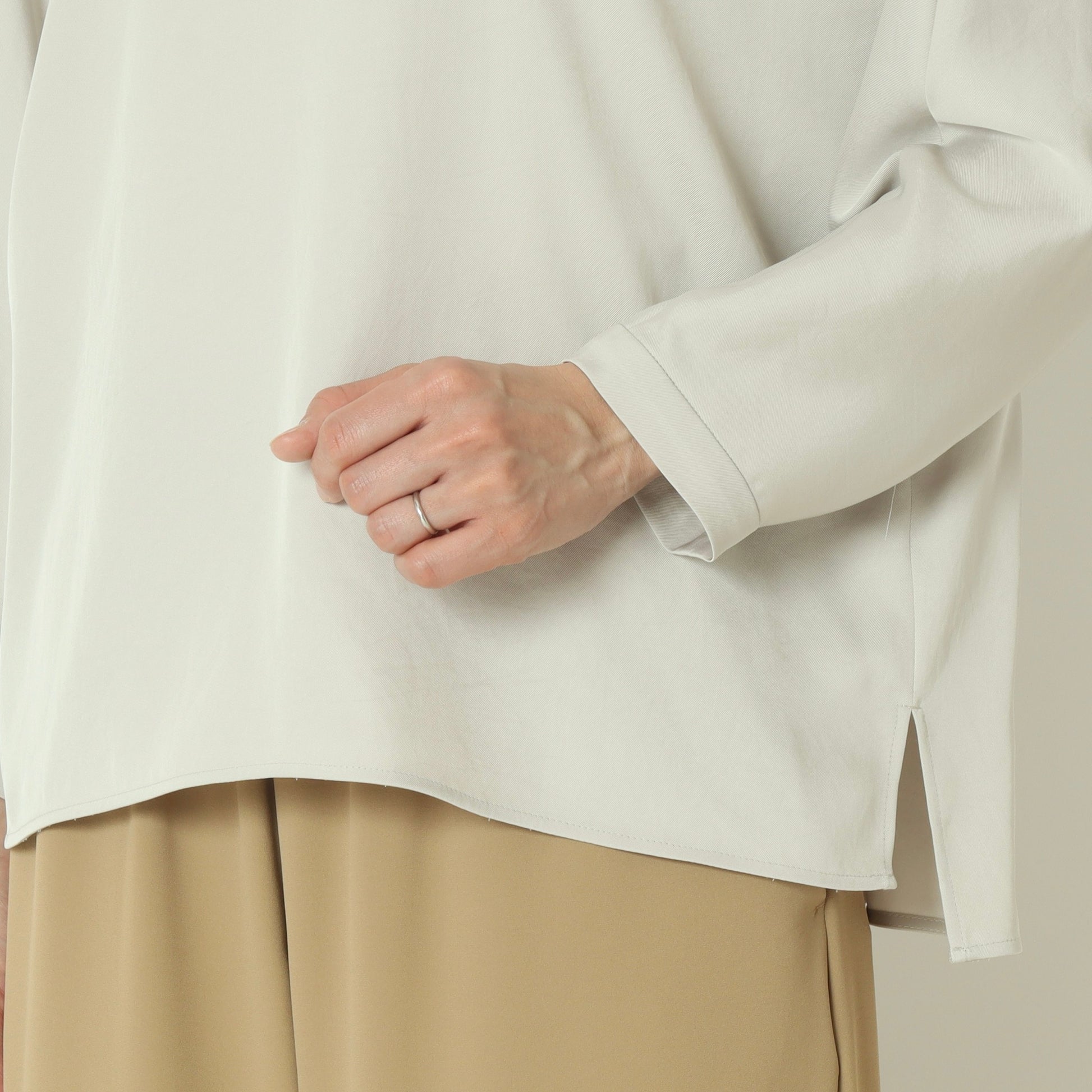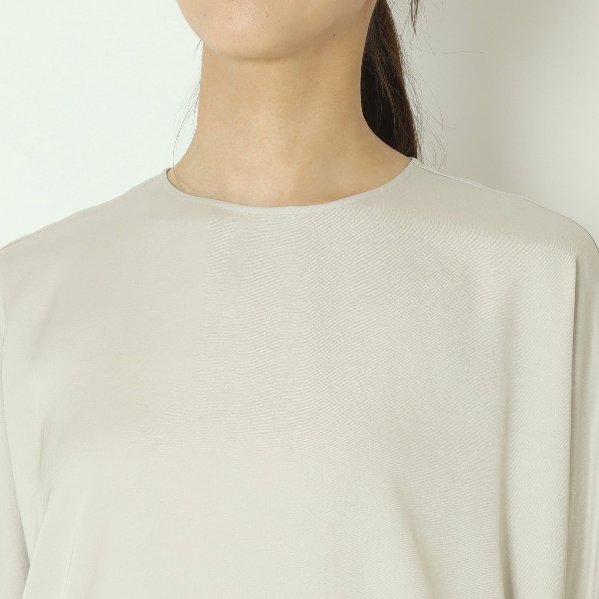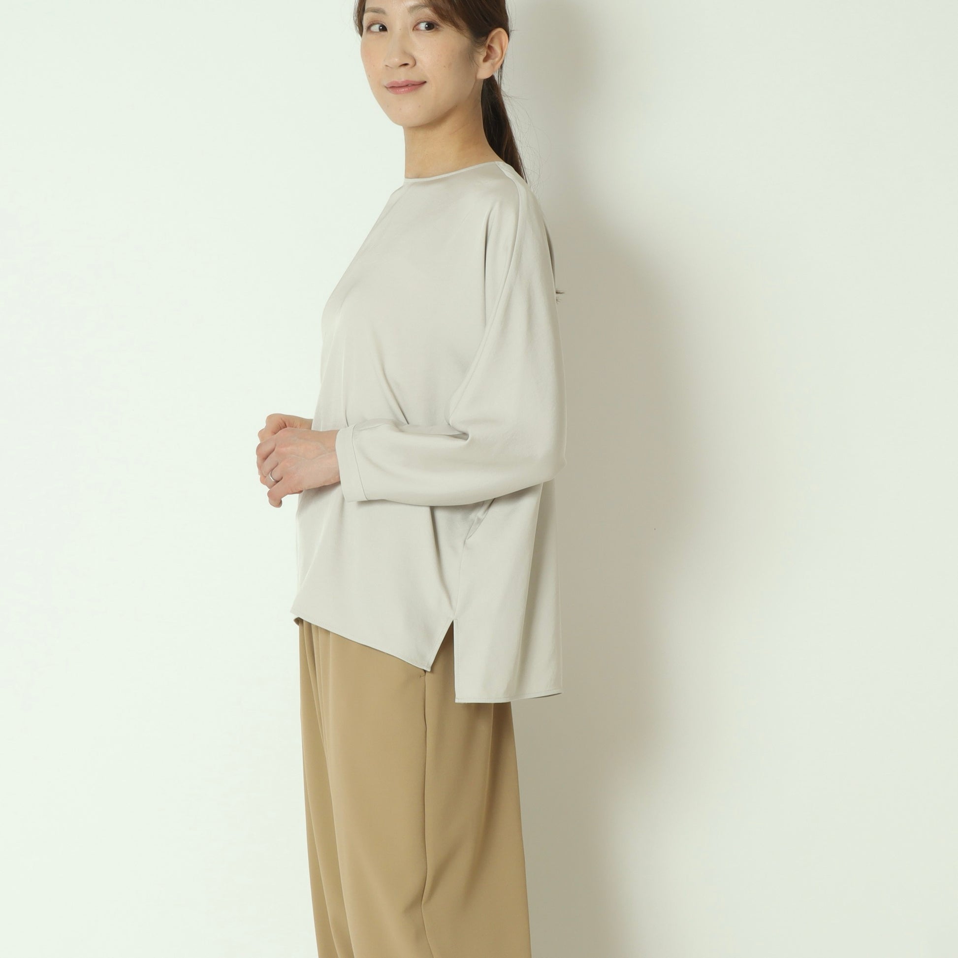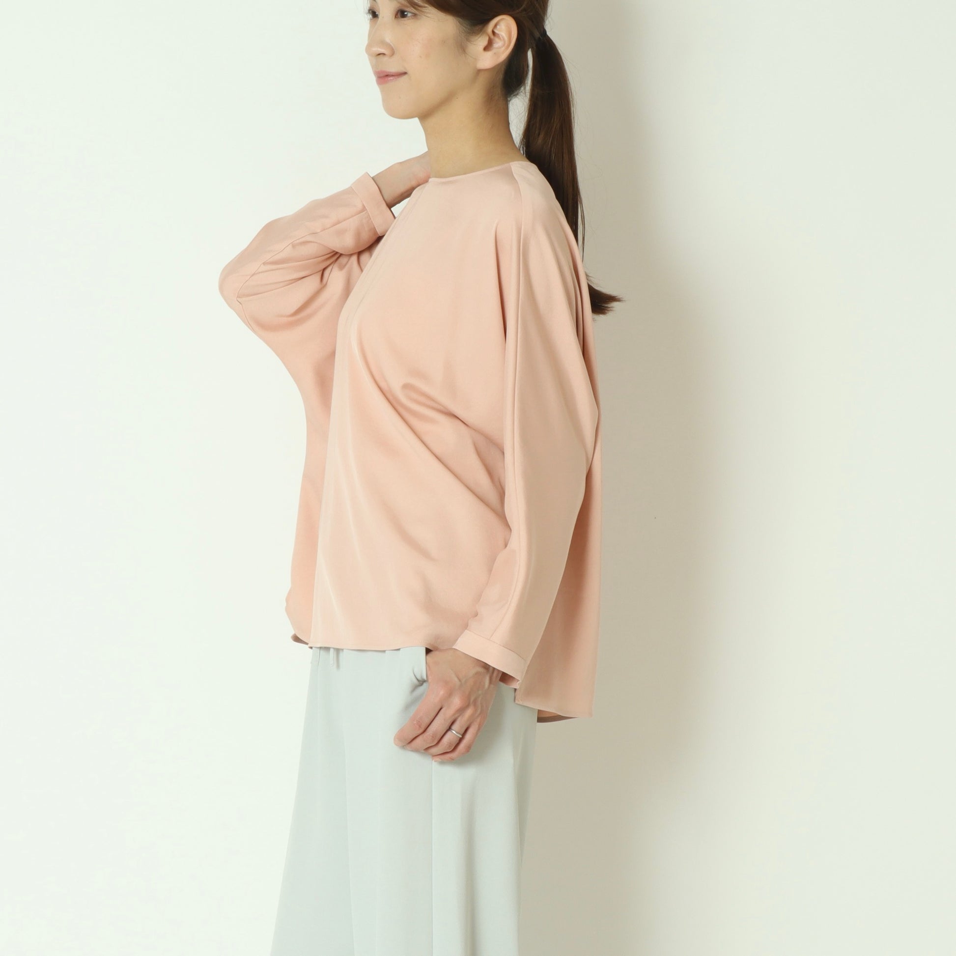 上品な光沢感が魅力のサテンツイル素材を使用したプルオーバーブラウス。