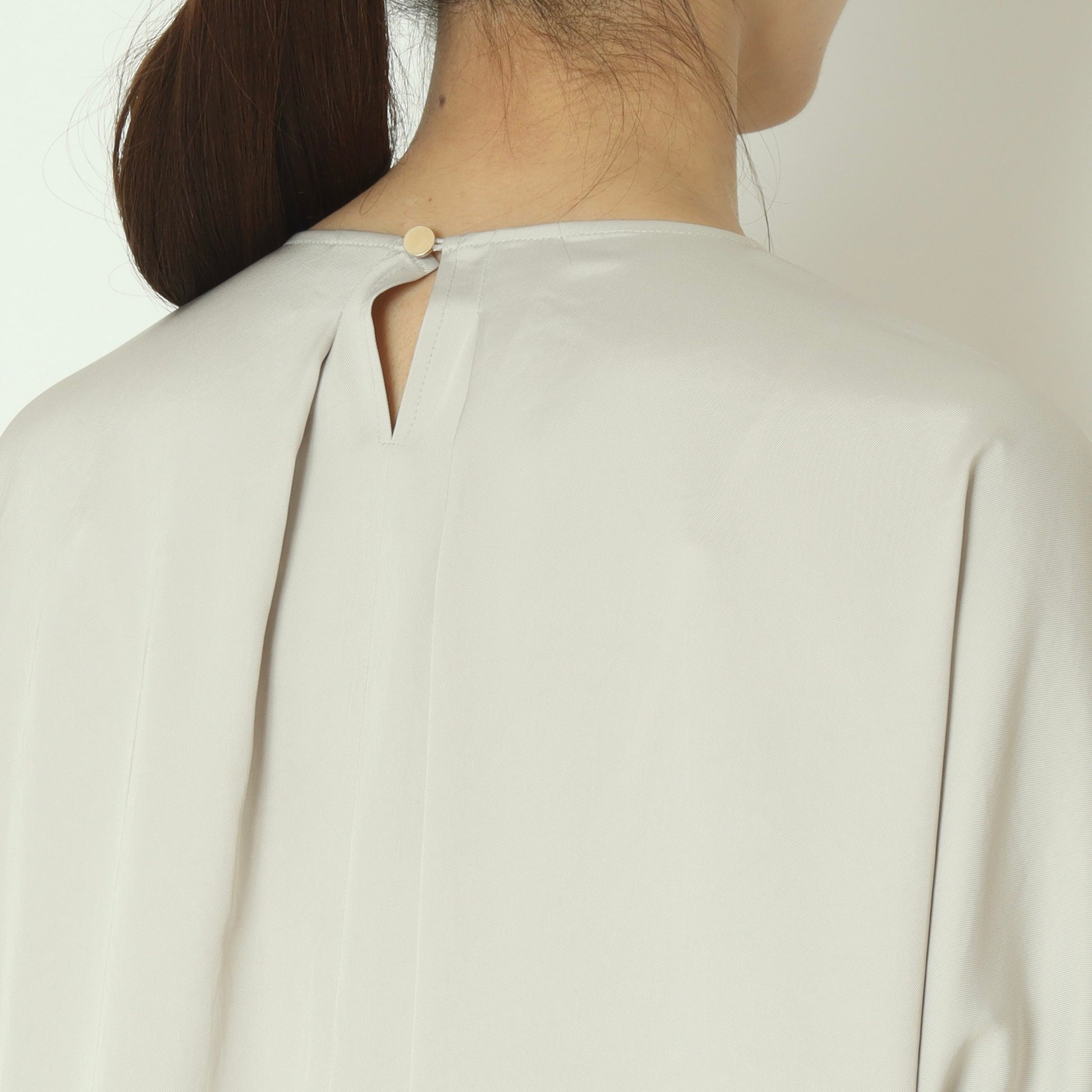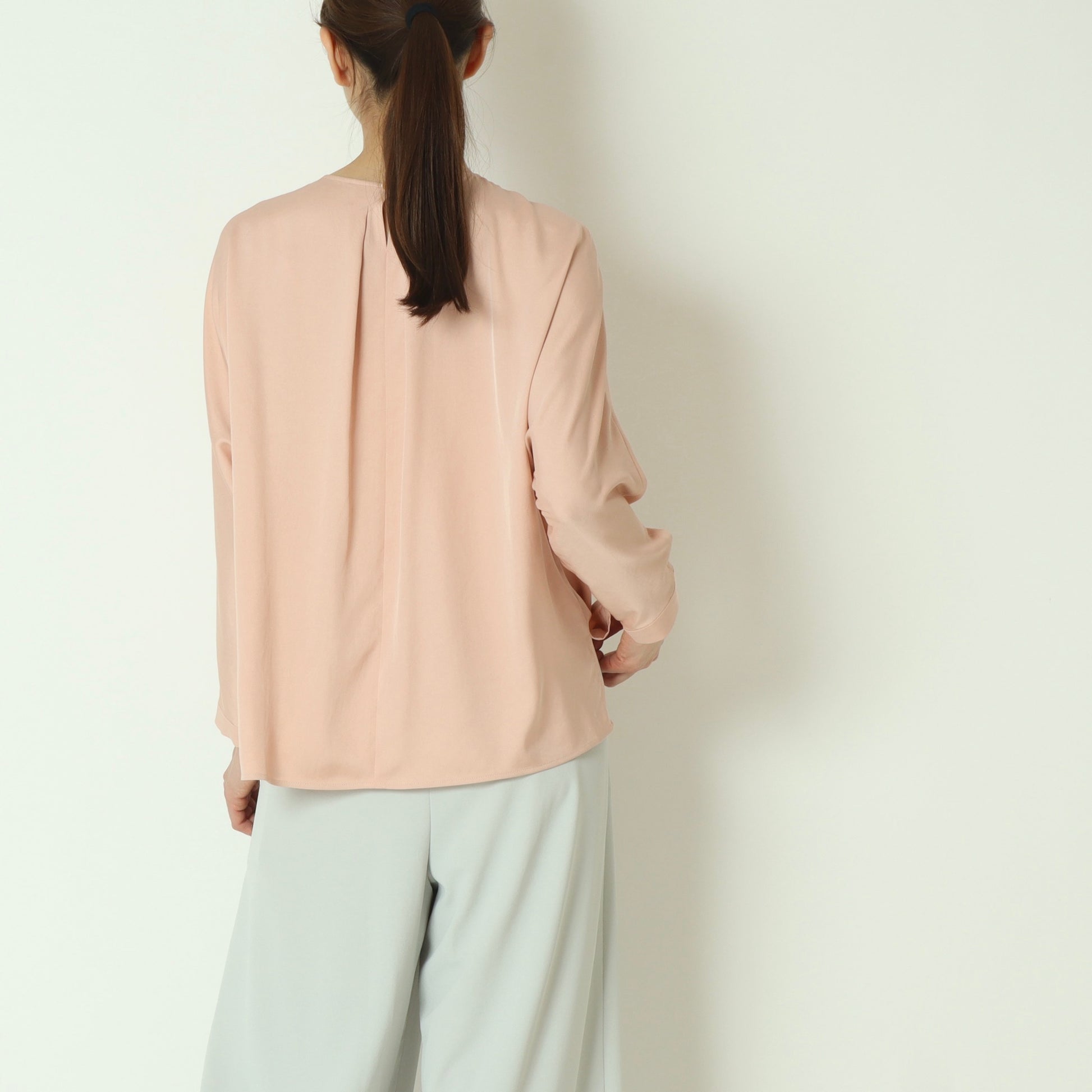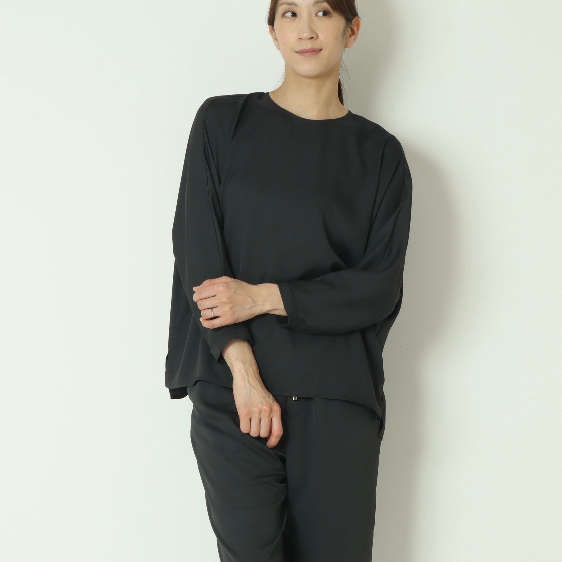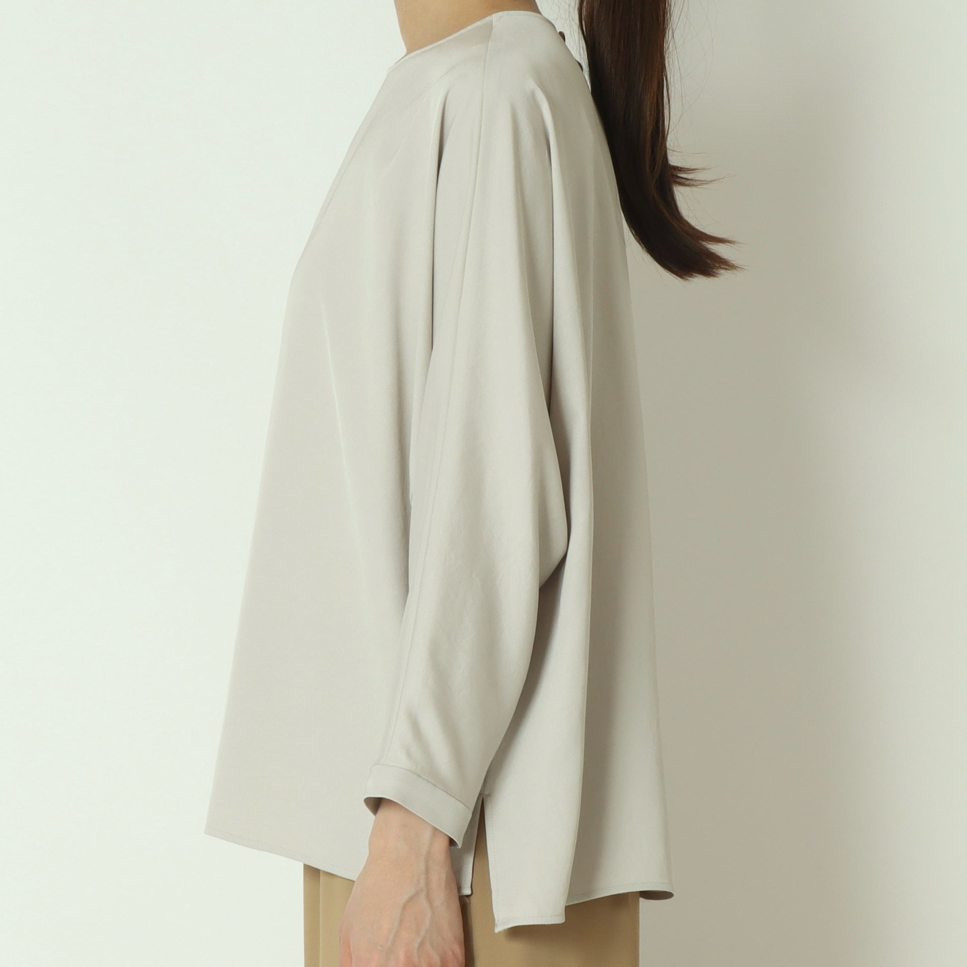 上品な光沢感が魅力のサテンツイル素材を使用したプルオーバーブラウス。