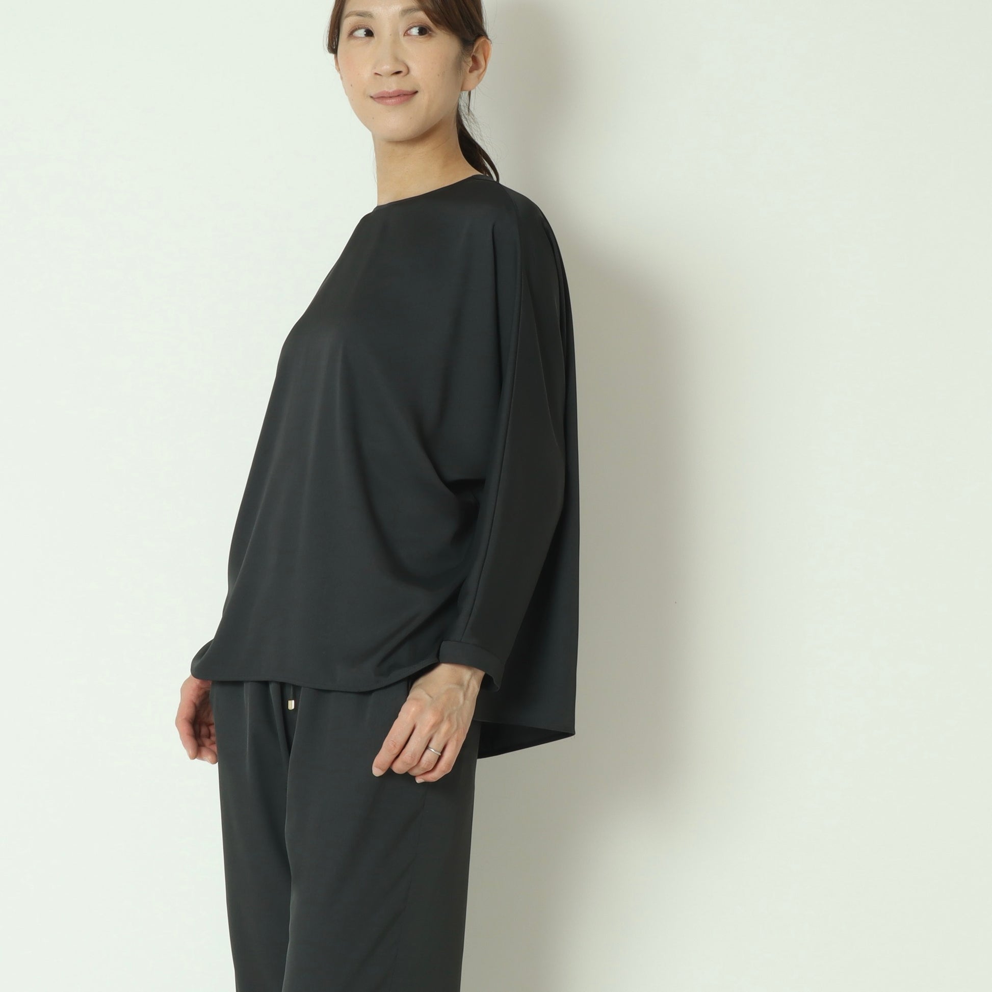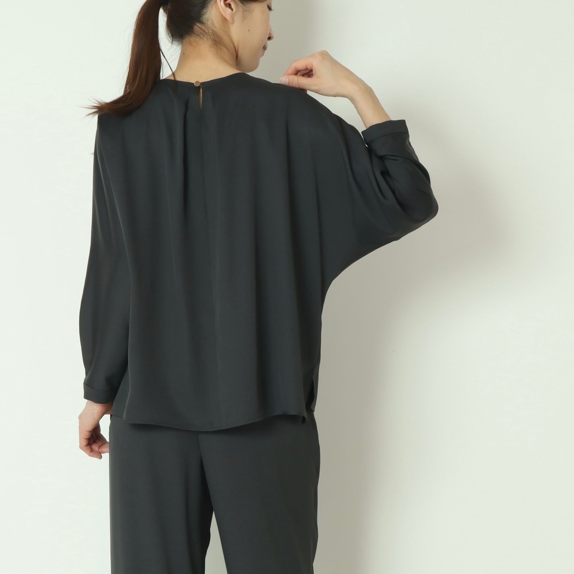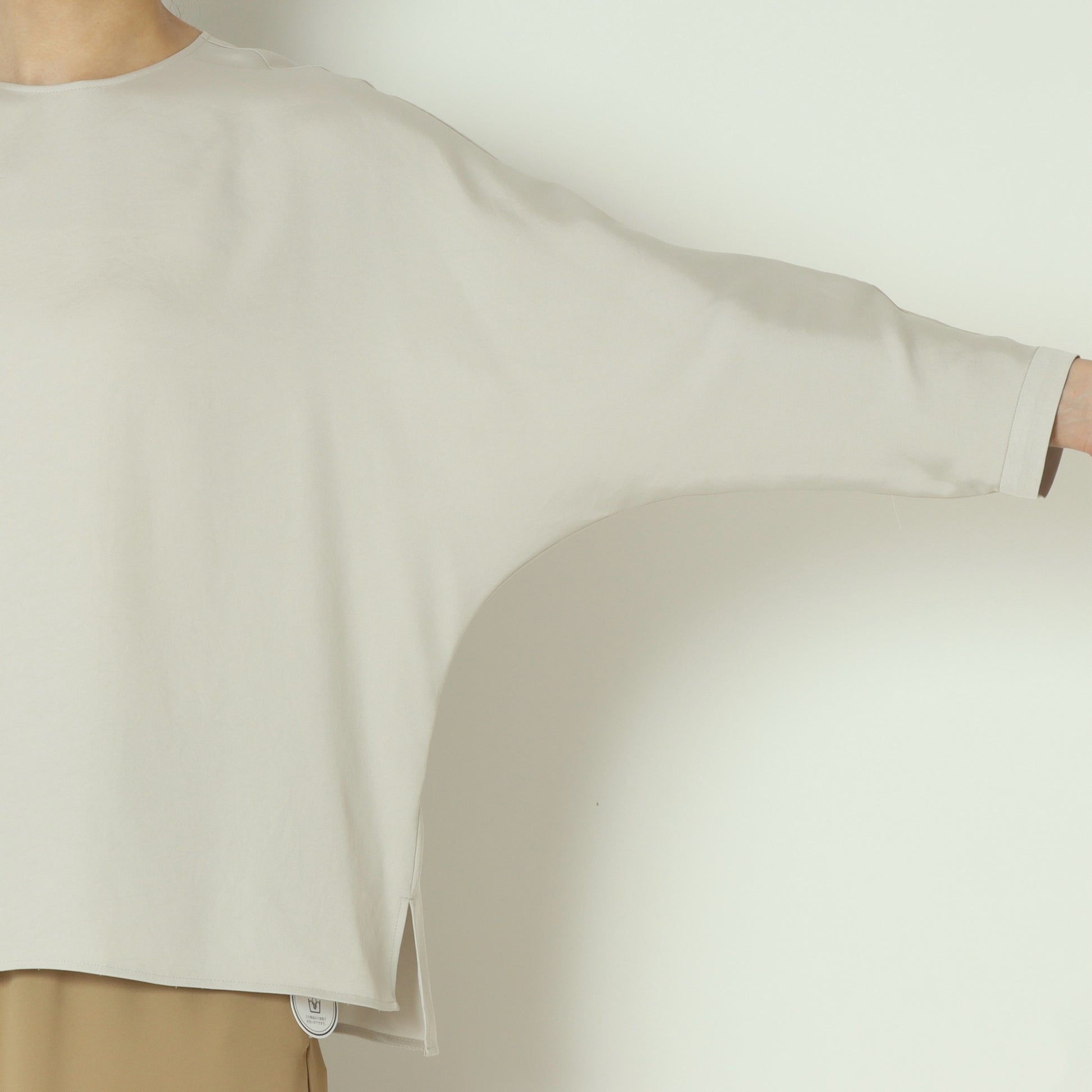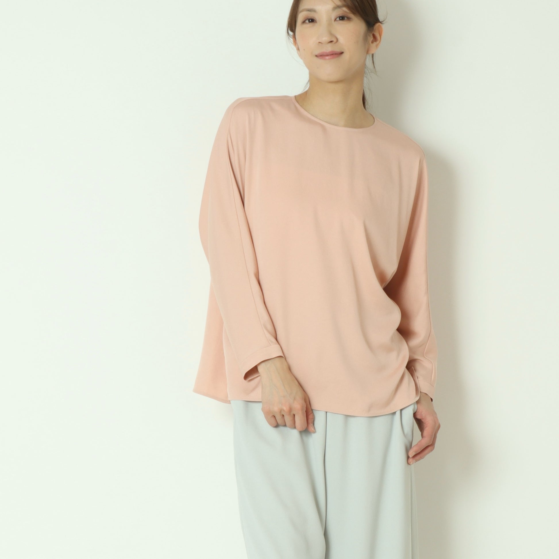 上品な光沢感が魅力のサテンツイル素材を使用したプルオーバーブラウス。