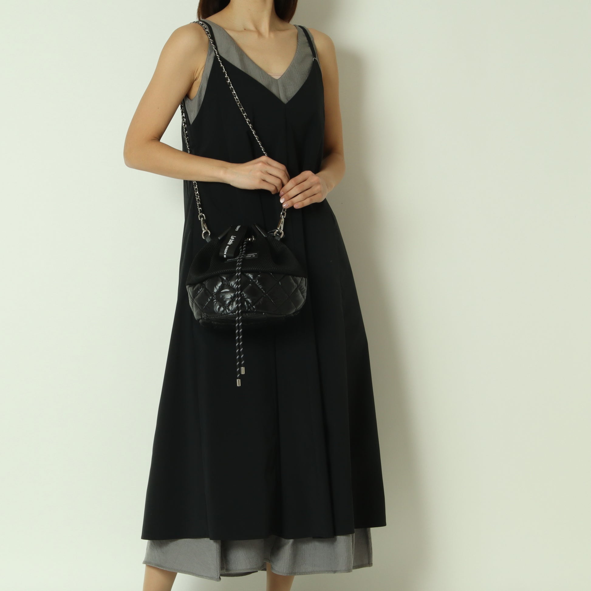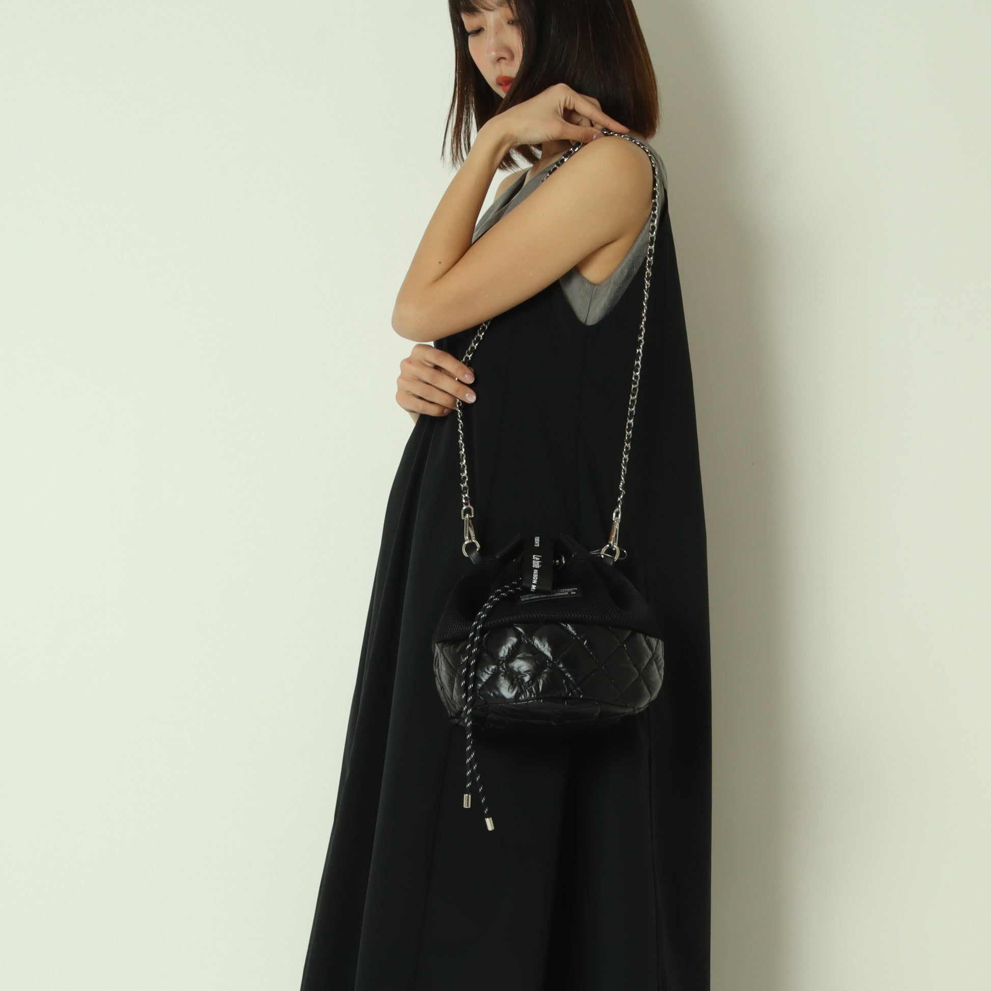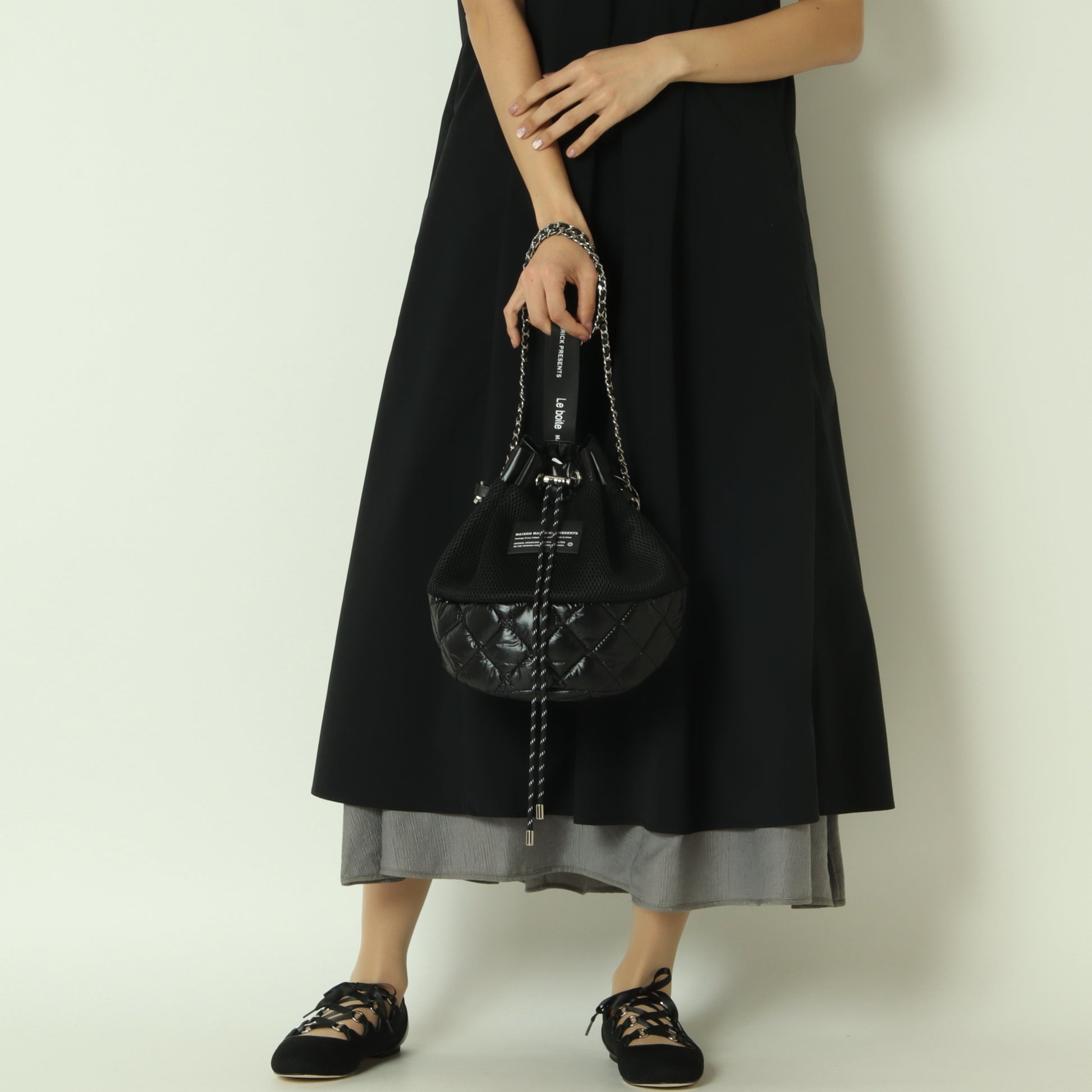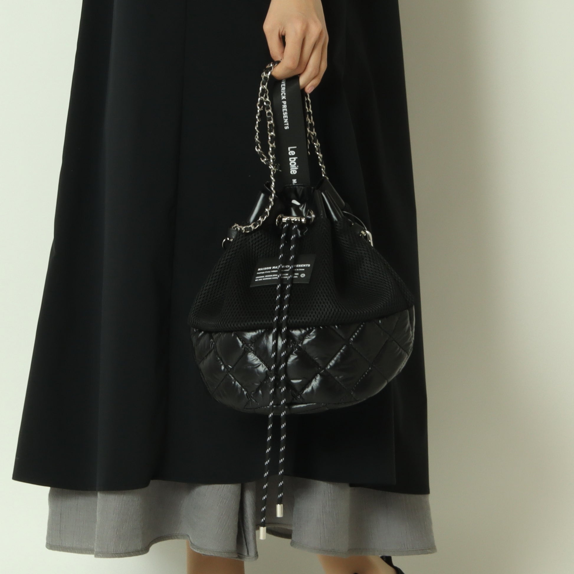 メッシュ素材とキルティング素材がドッキングされた巾着型ポーチバッグ。