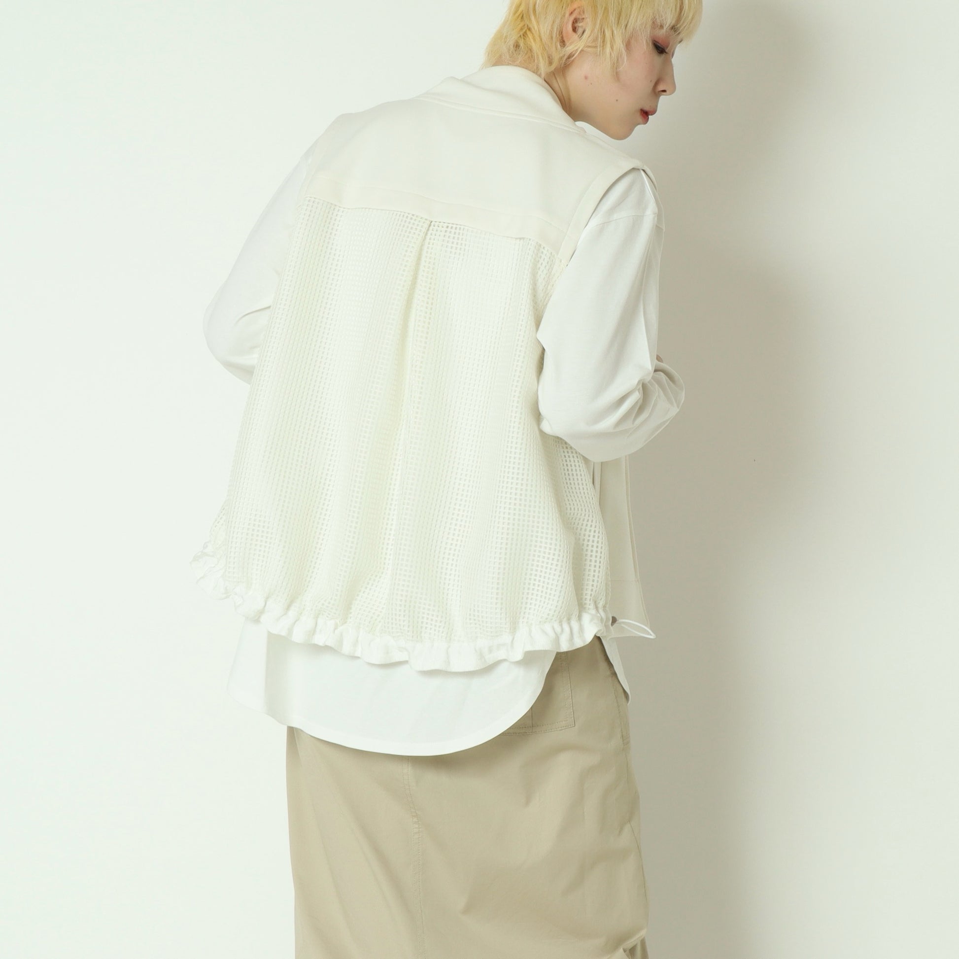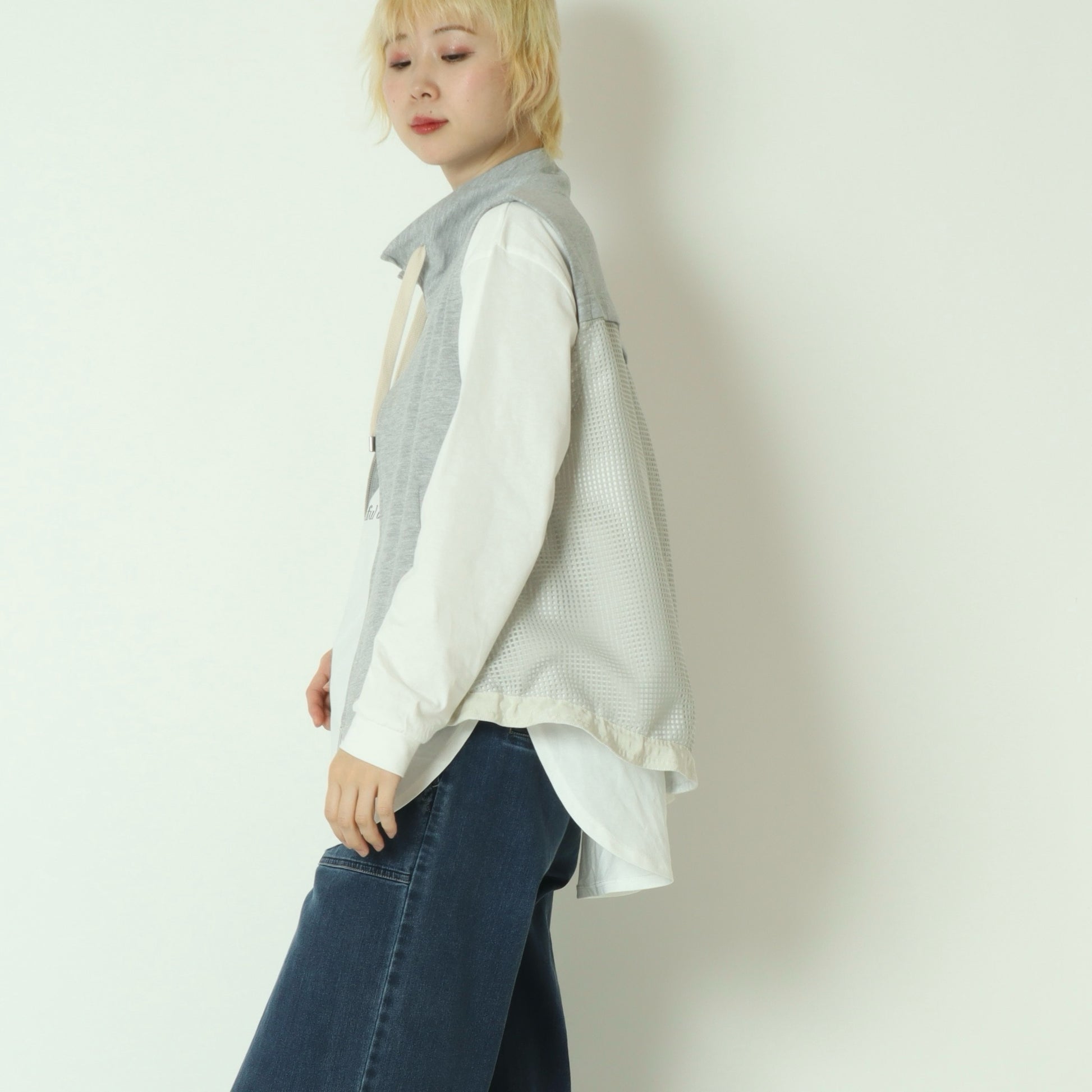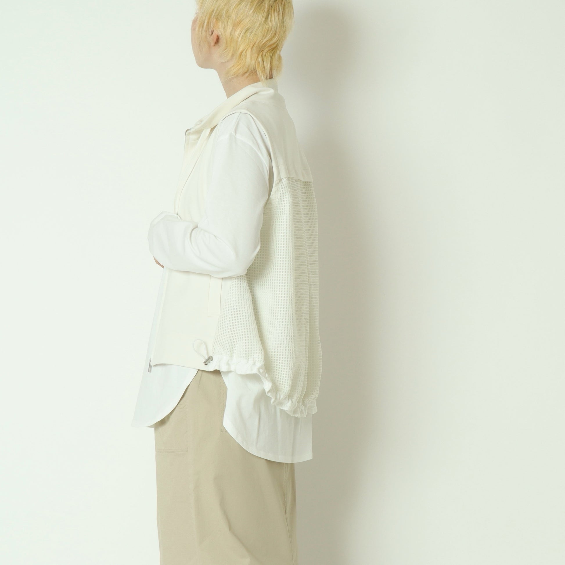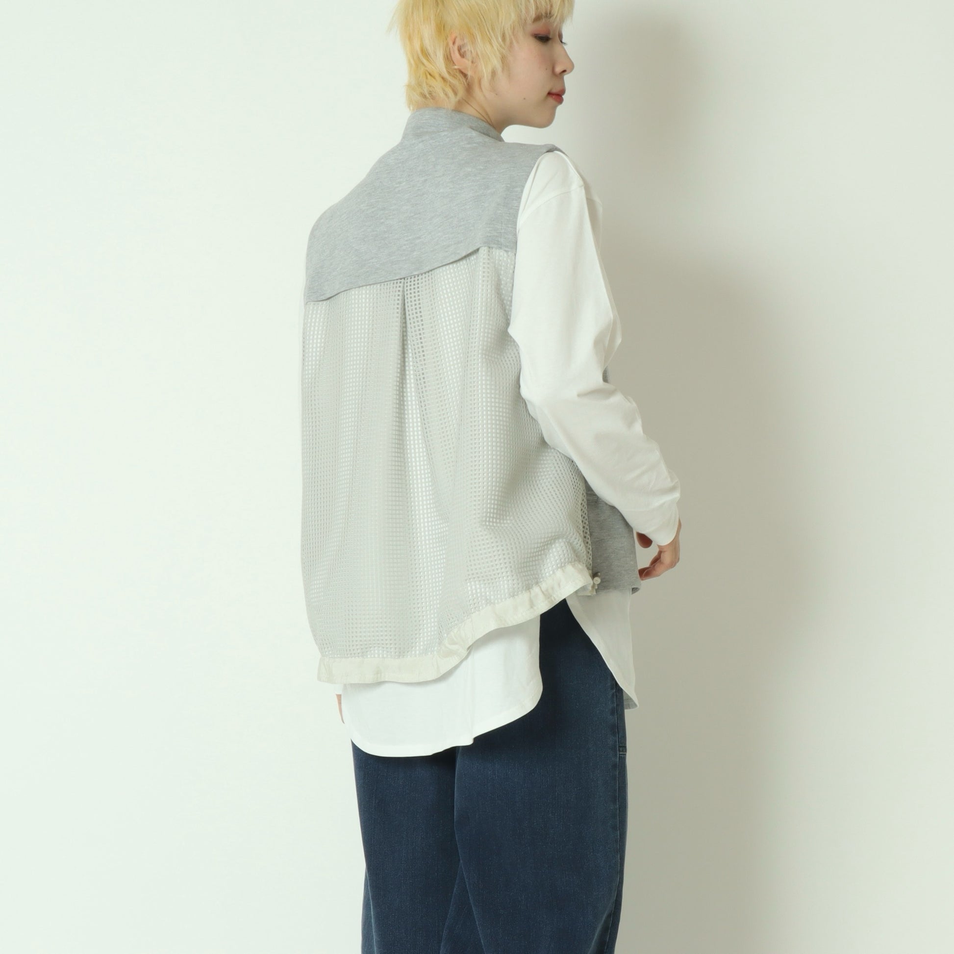 杢調のカットソー素材をフロントに使用し、サイドからバックにかけてメッシュ素材に切り替えており、異素材のコントラストが軽やかさと立体感を生み出しています。