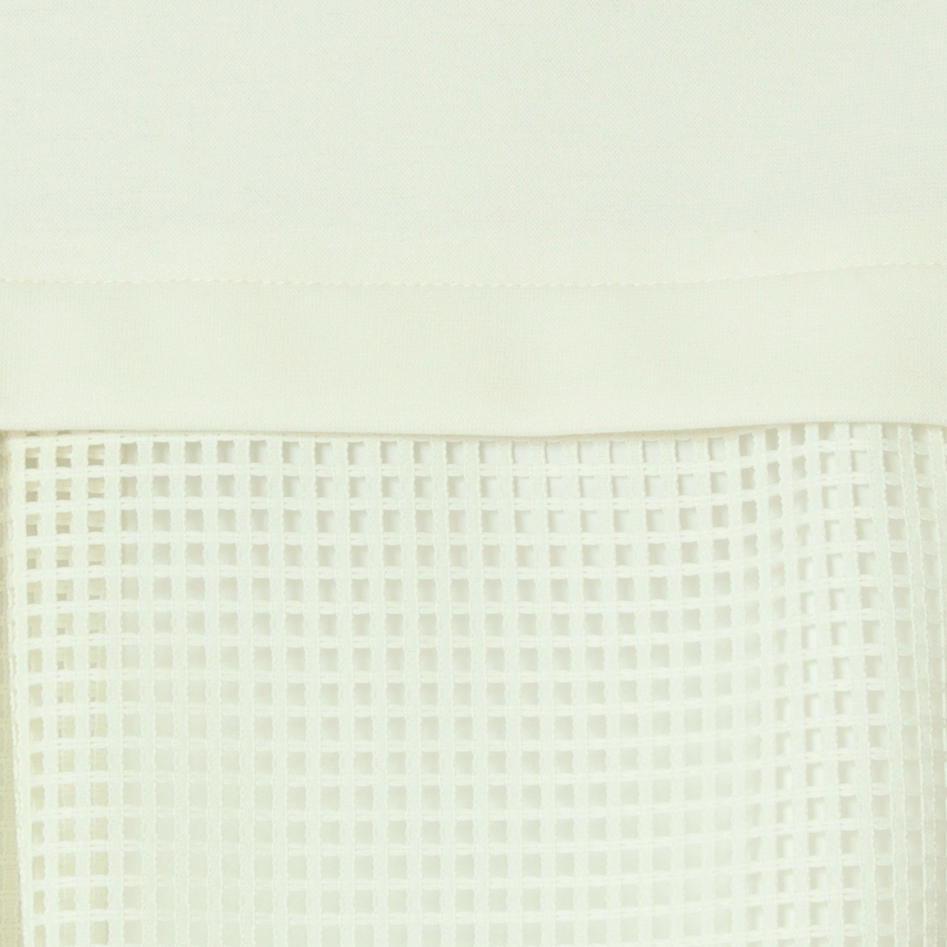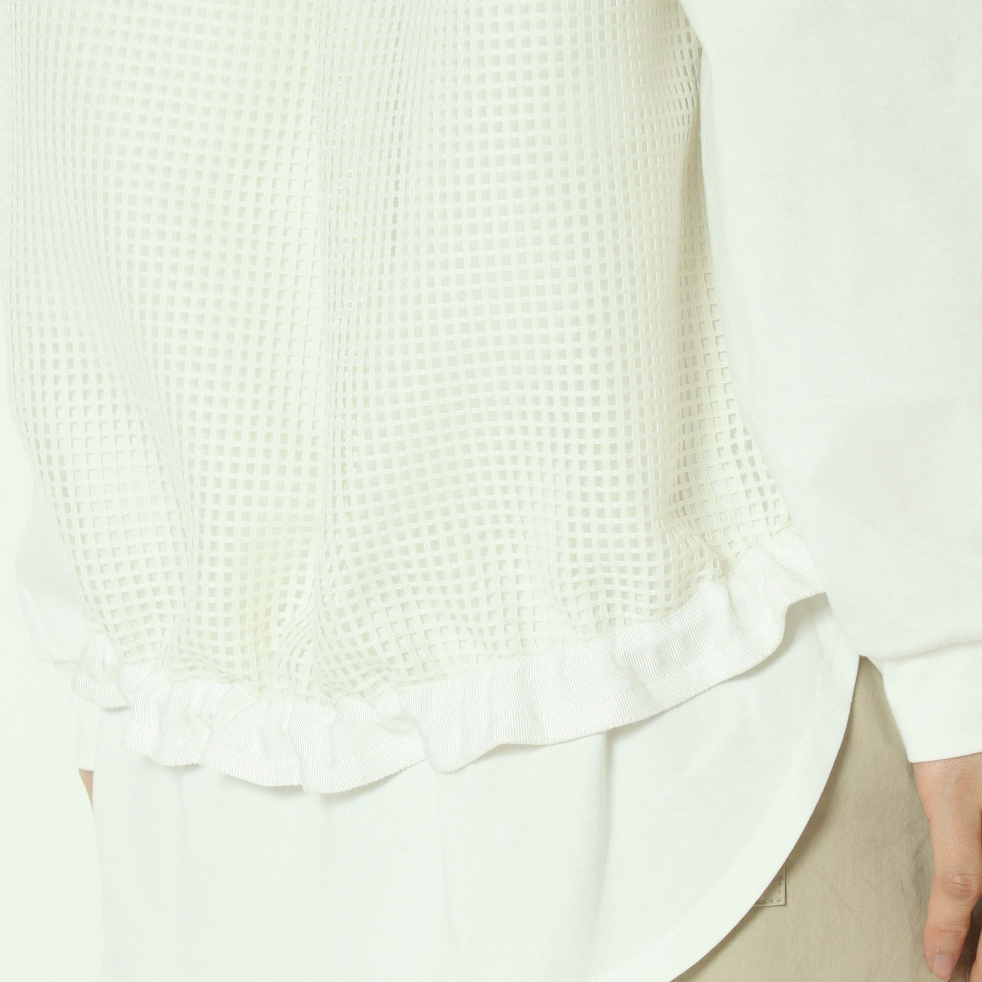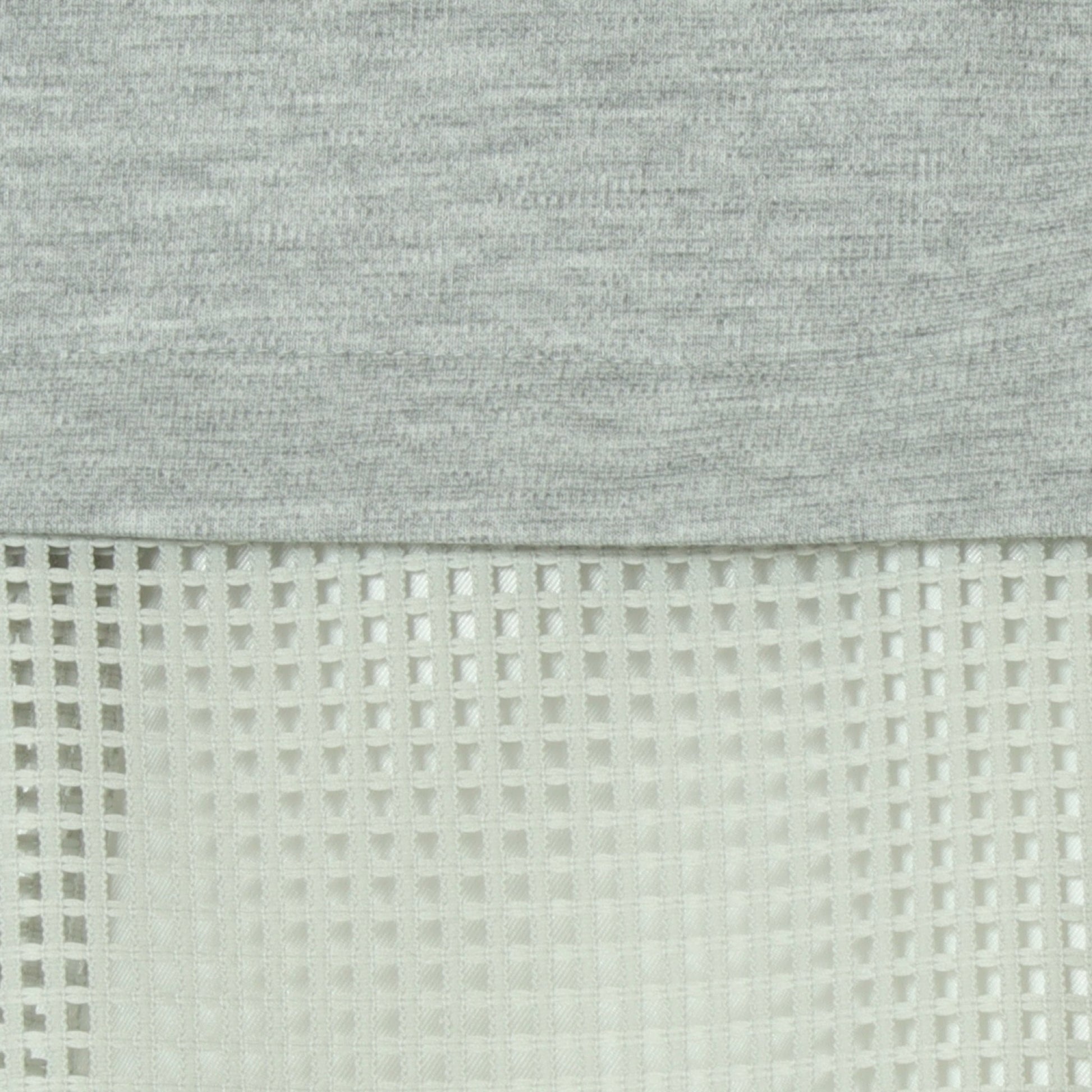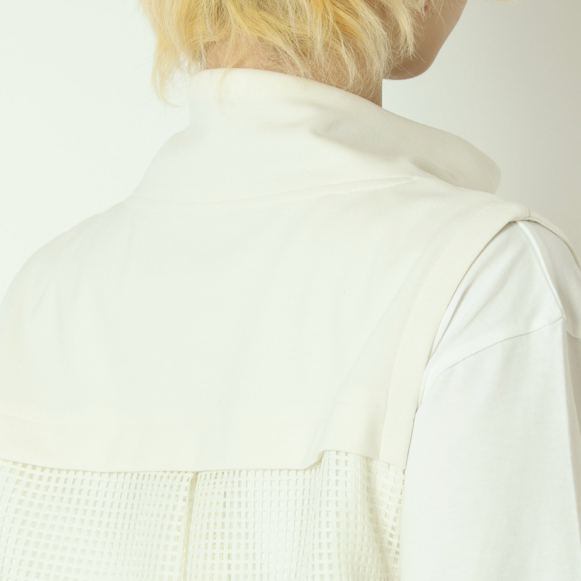 杢調のカットソー素材をフロントに使用し、サイドからバックにかけてメッシュ素材に切り替えており、異素材のコントラストが軽やかさと立体感を生み出しています。