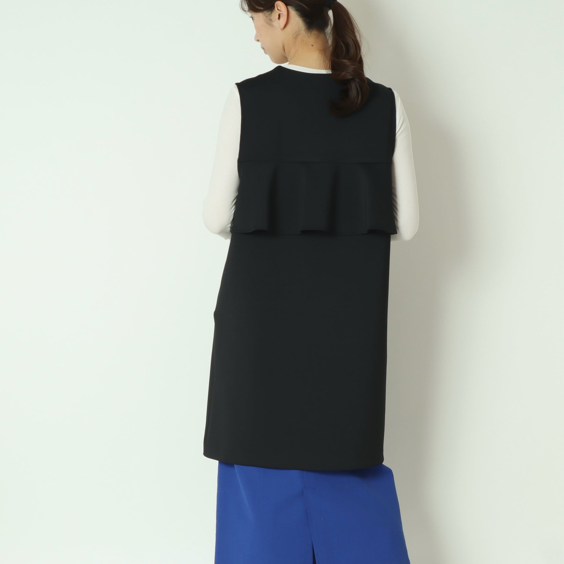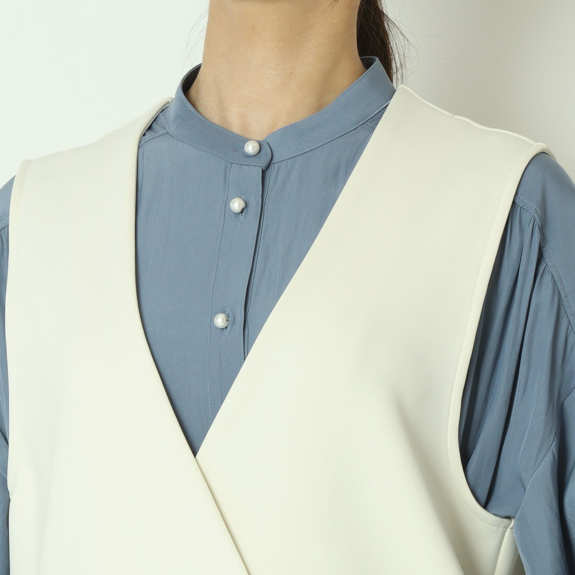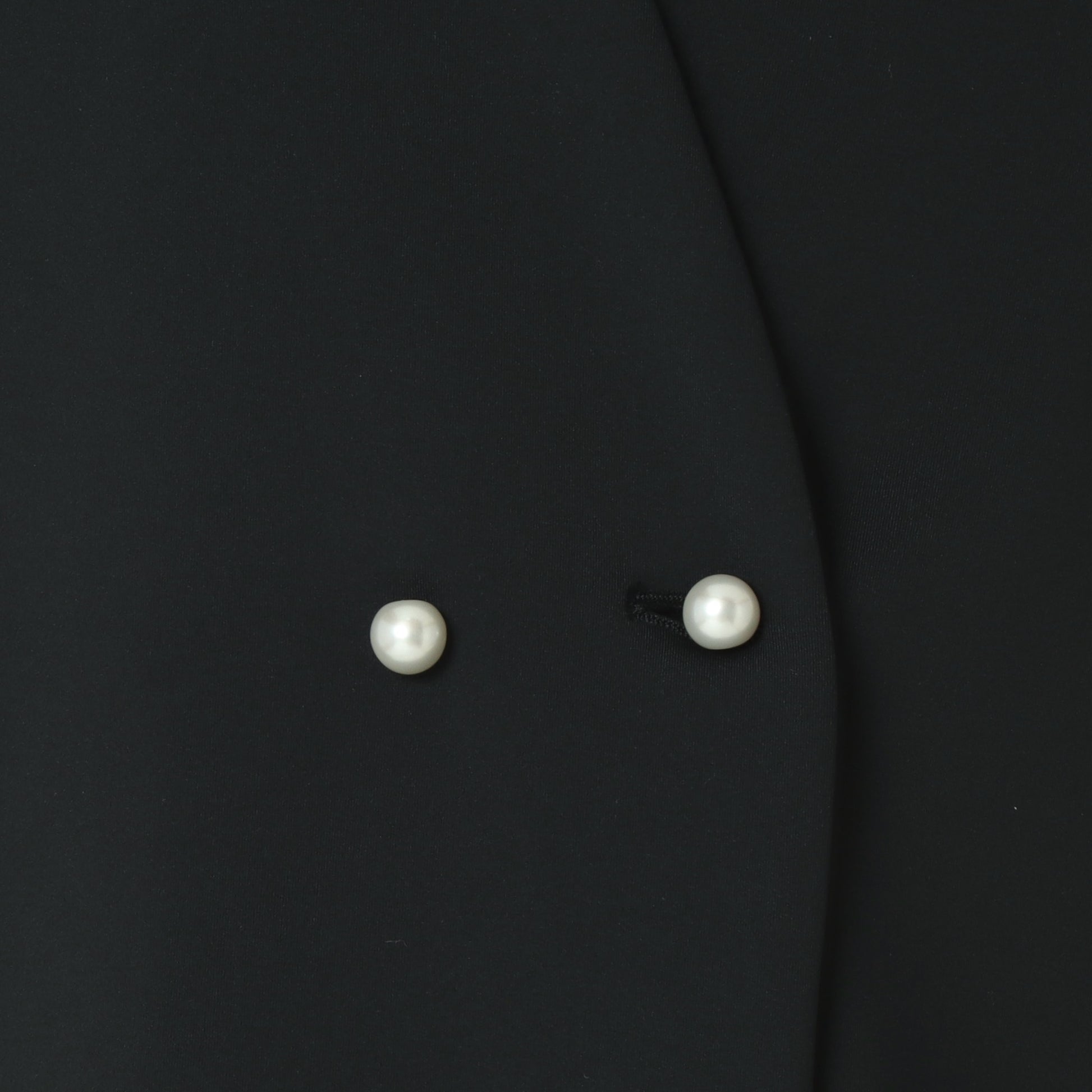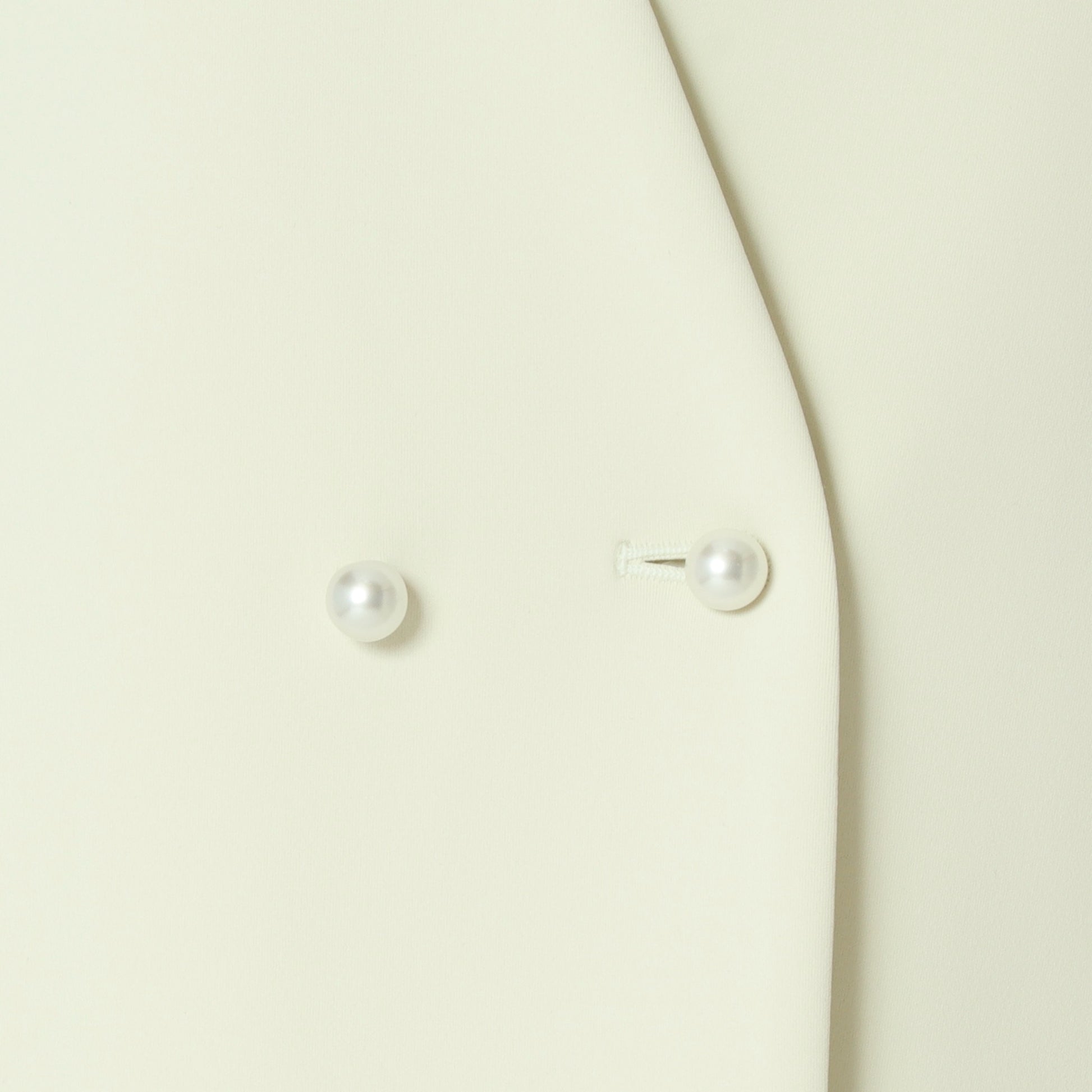 シンプルなノーカラーで、パール釦とバックラッフルがアクセントに◎