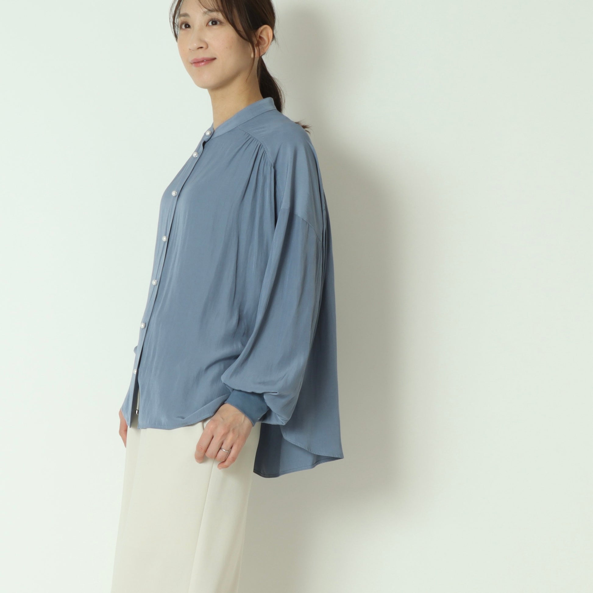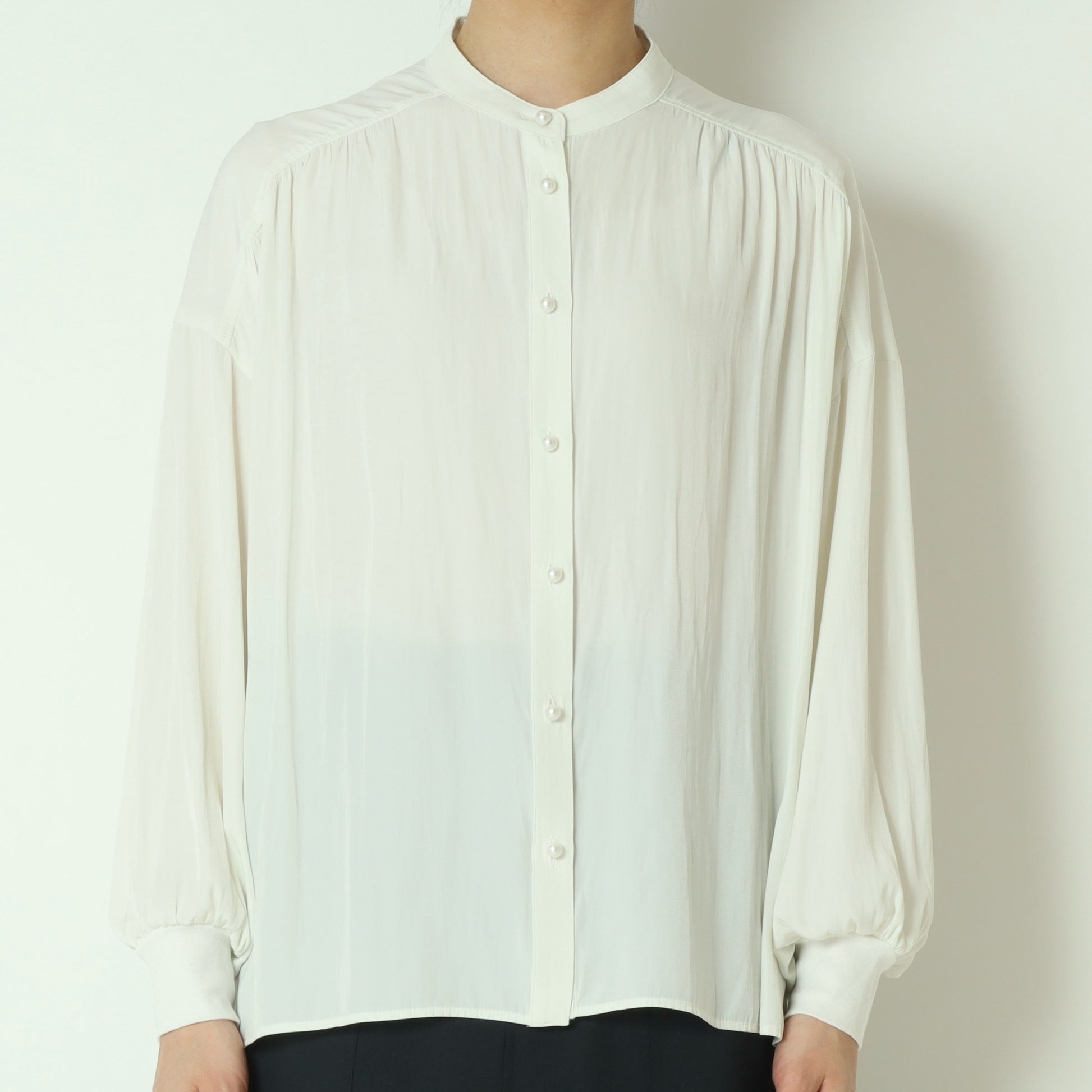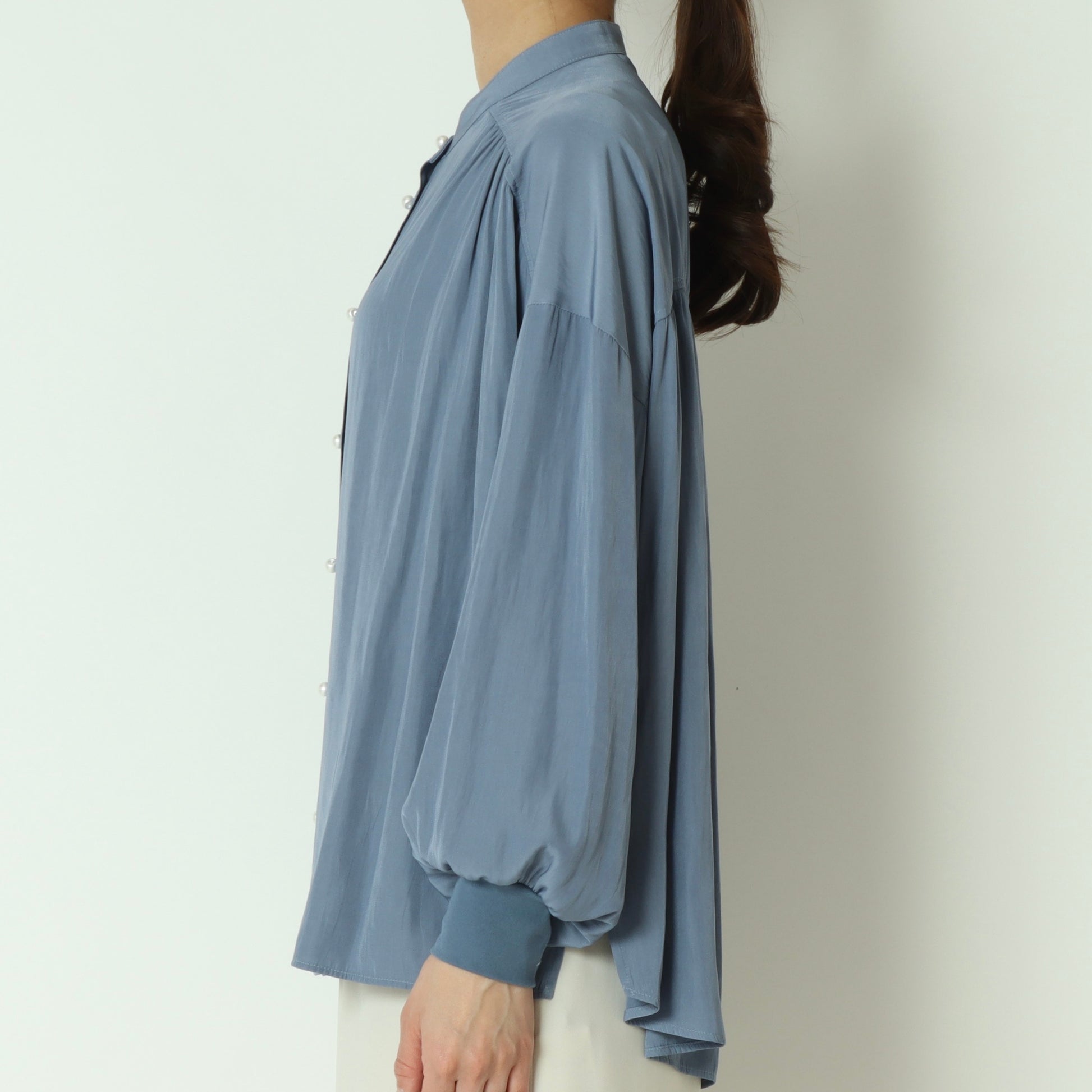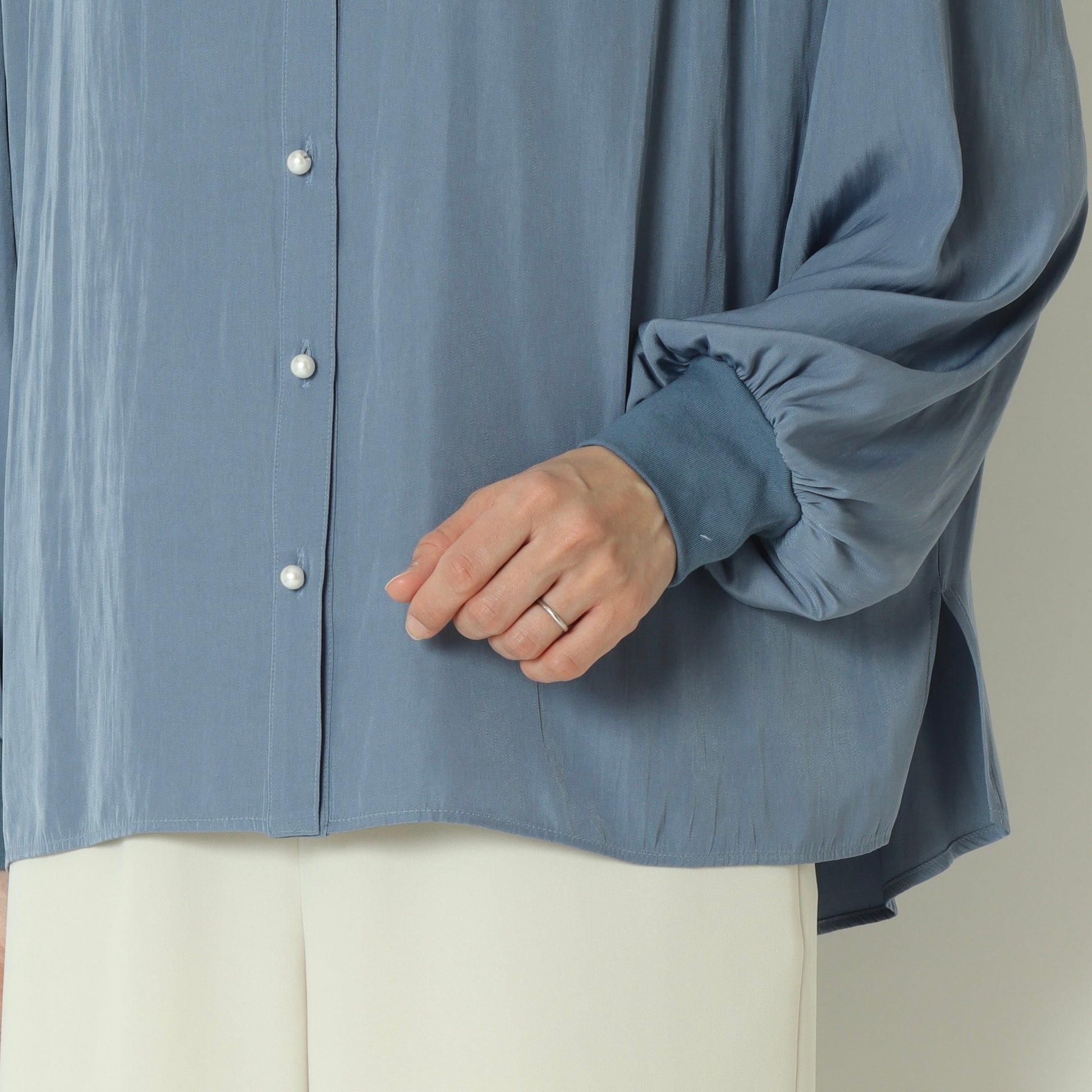 パールボタンがエレガントなドルマンスリーブシャツ。