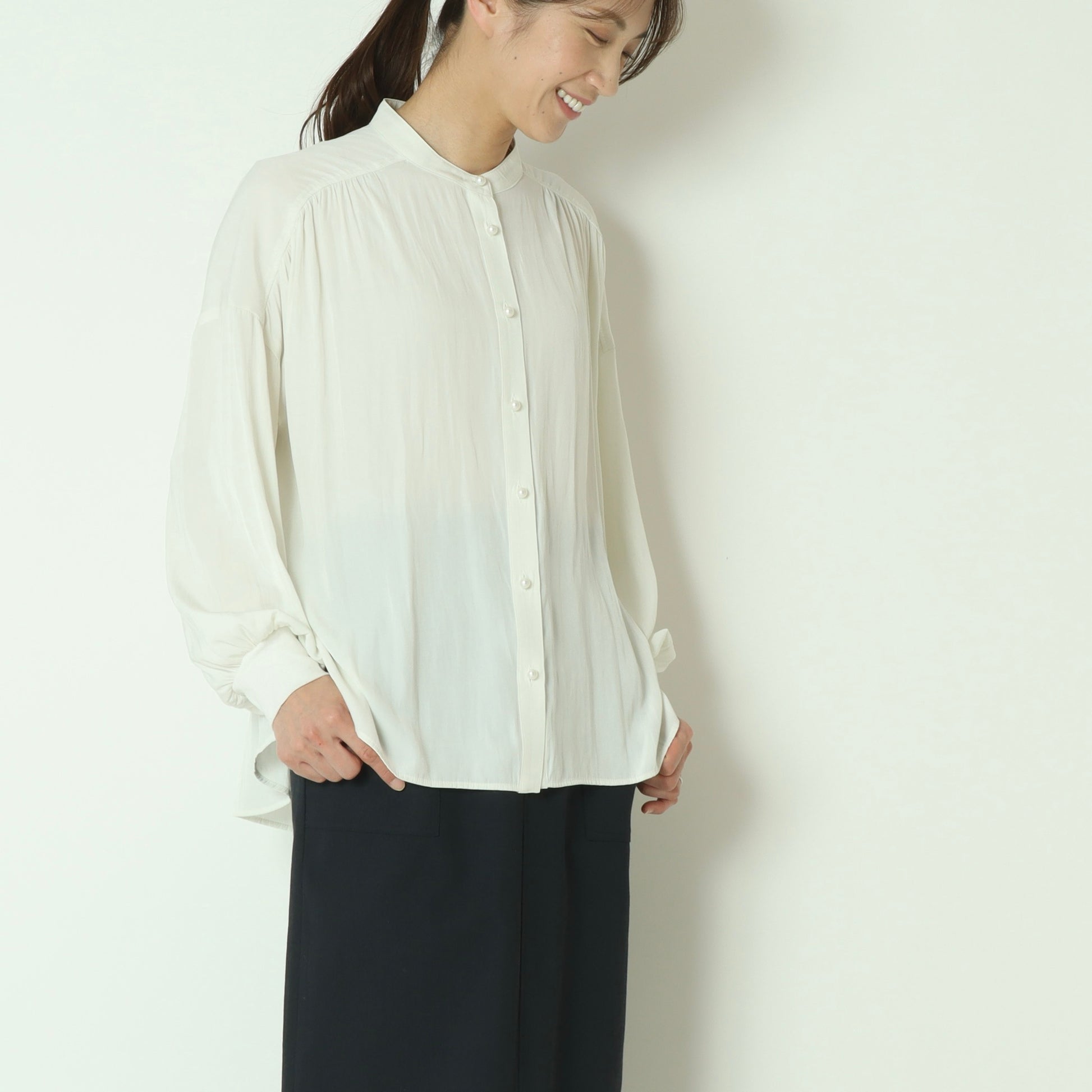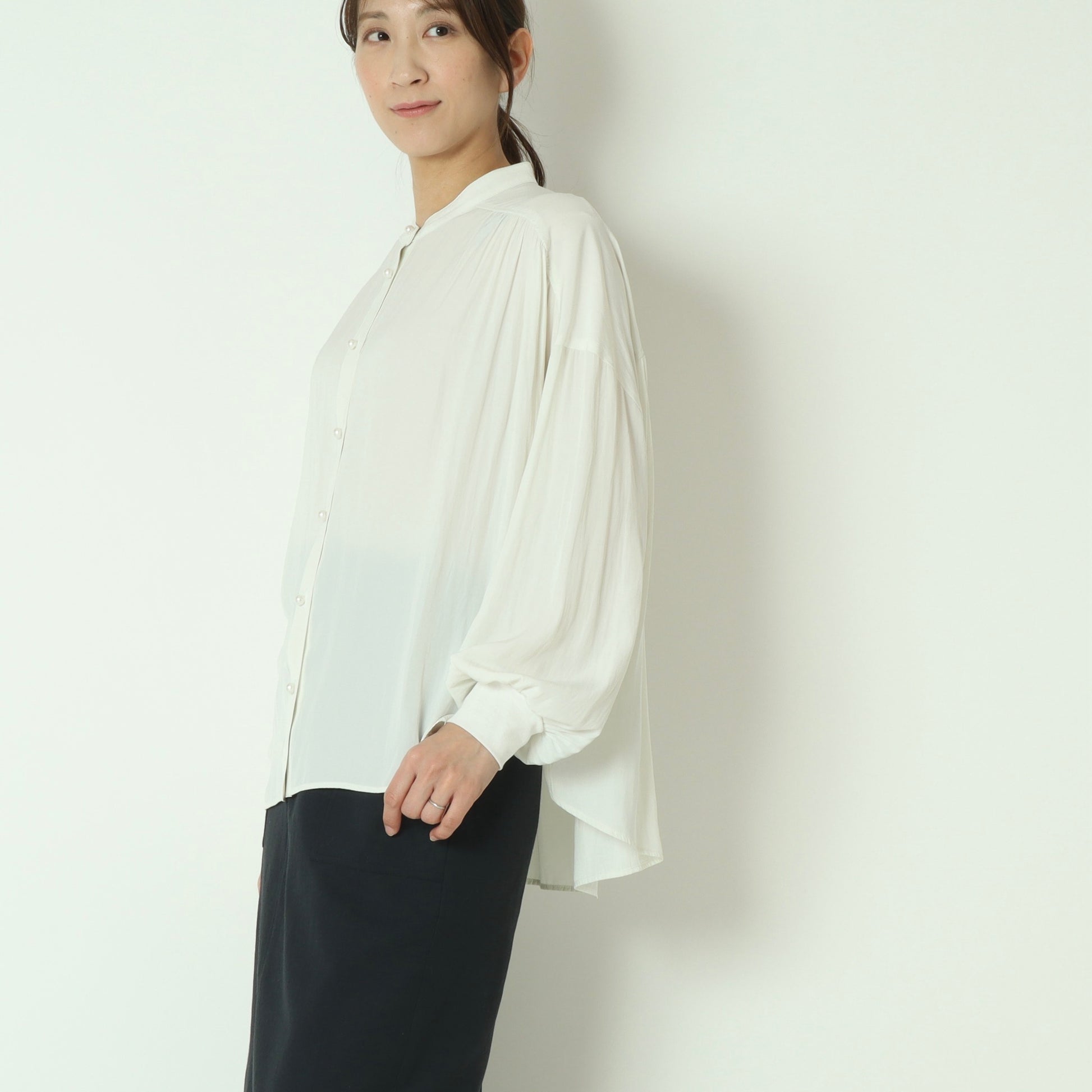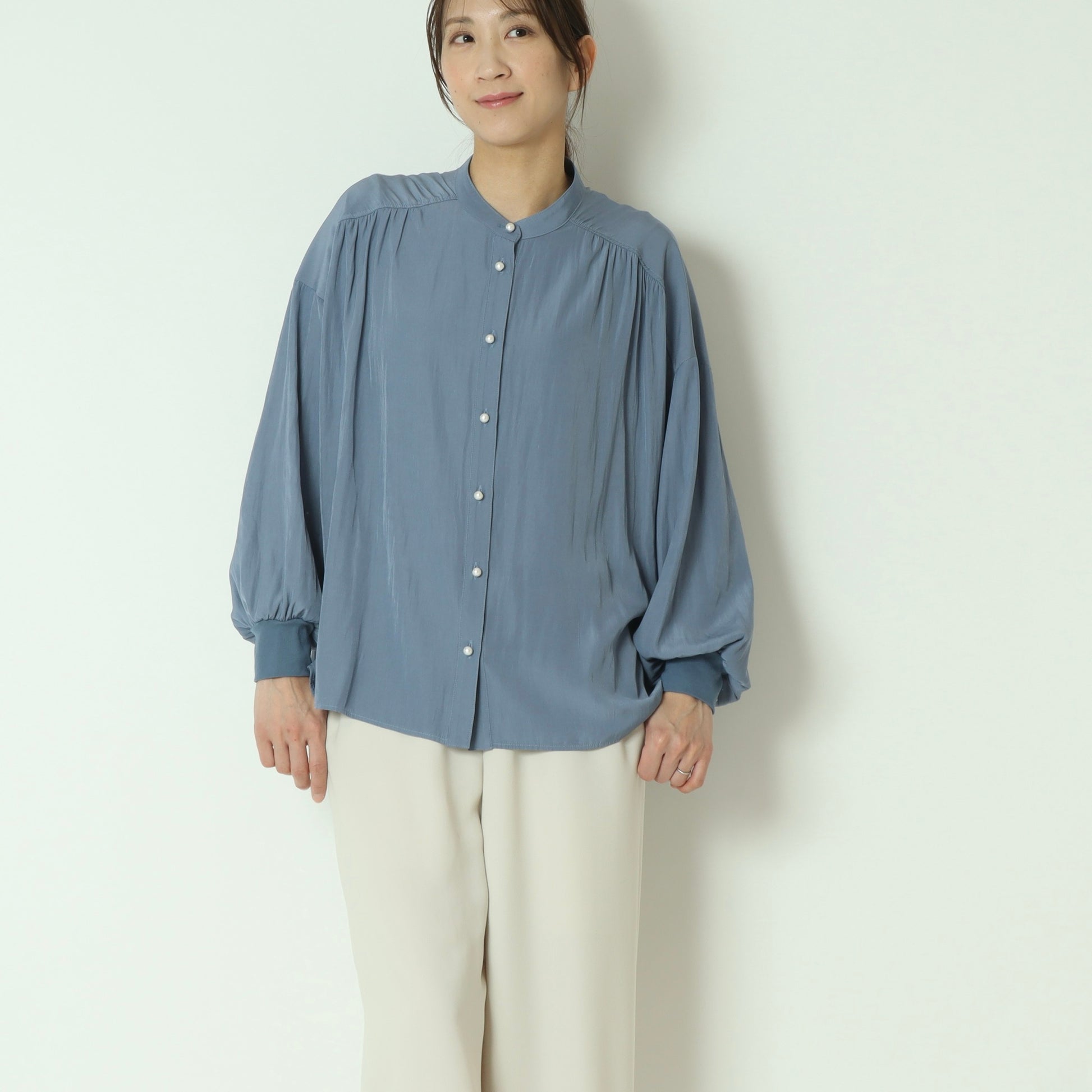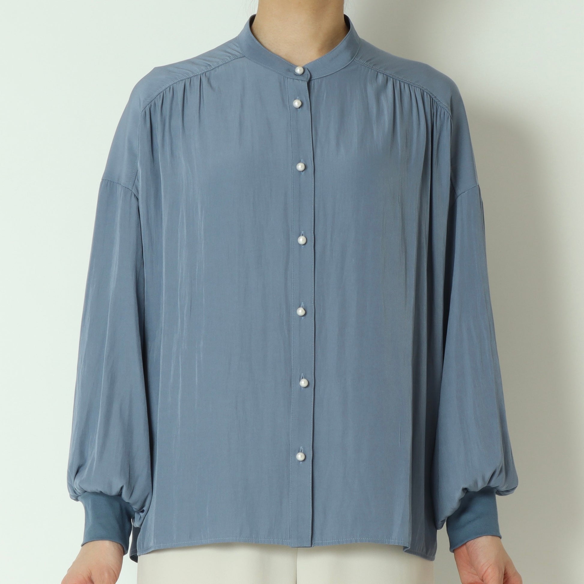 パールボタンがエレガントなドルマンスリーブシャツ。