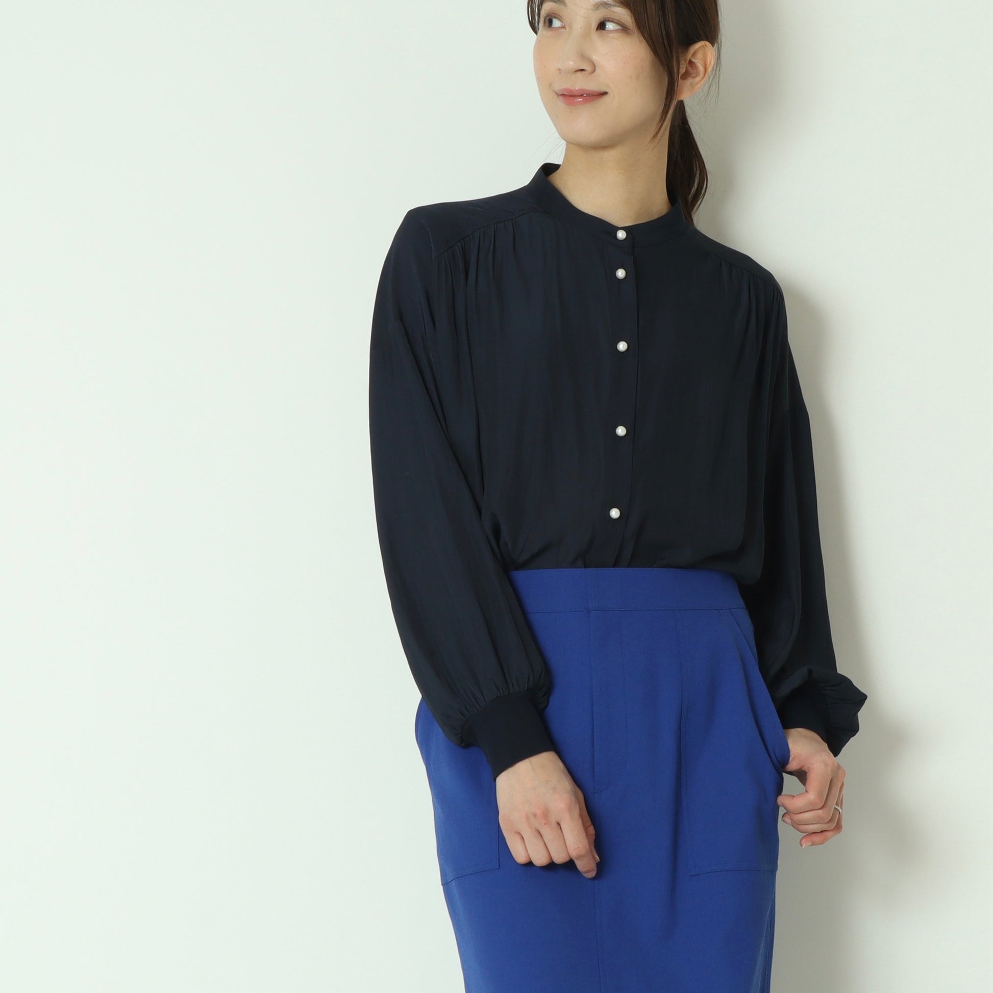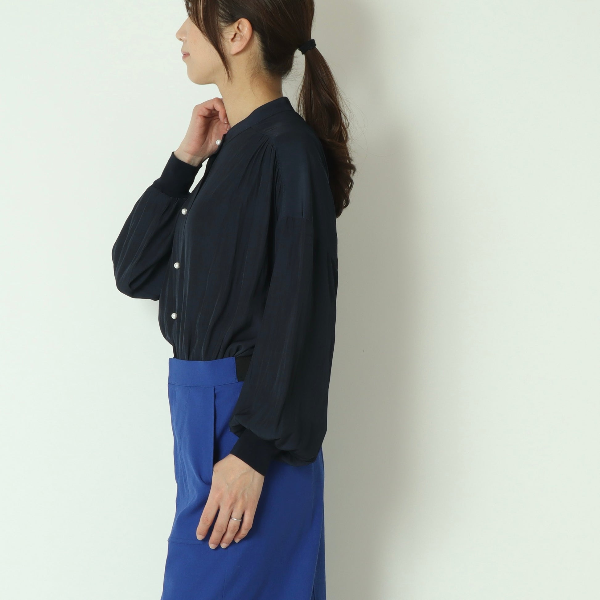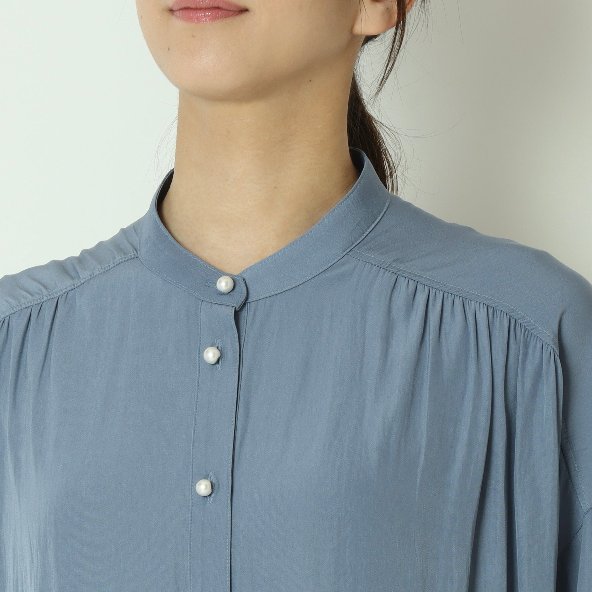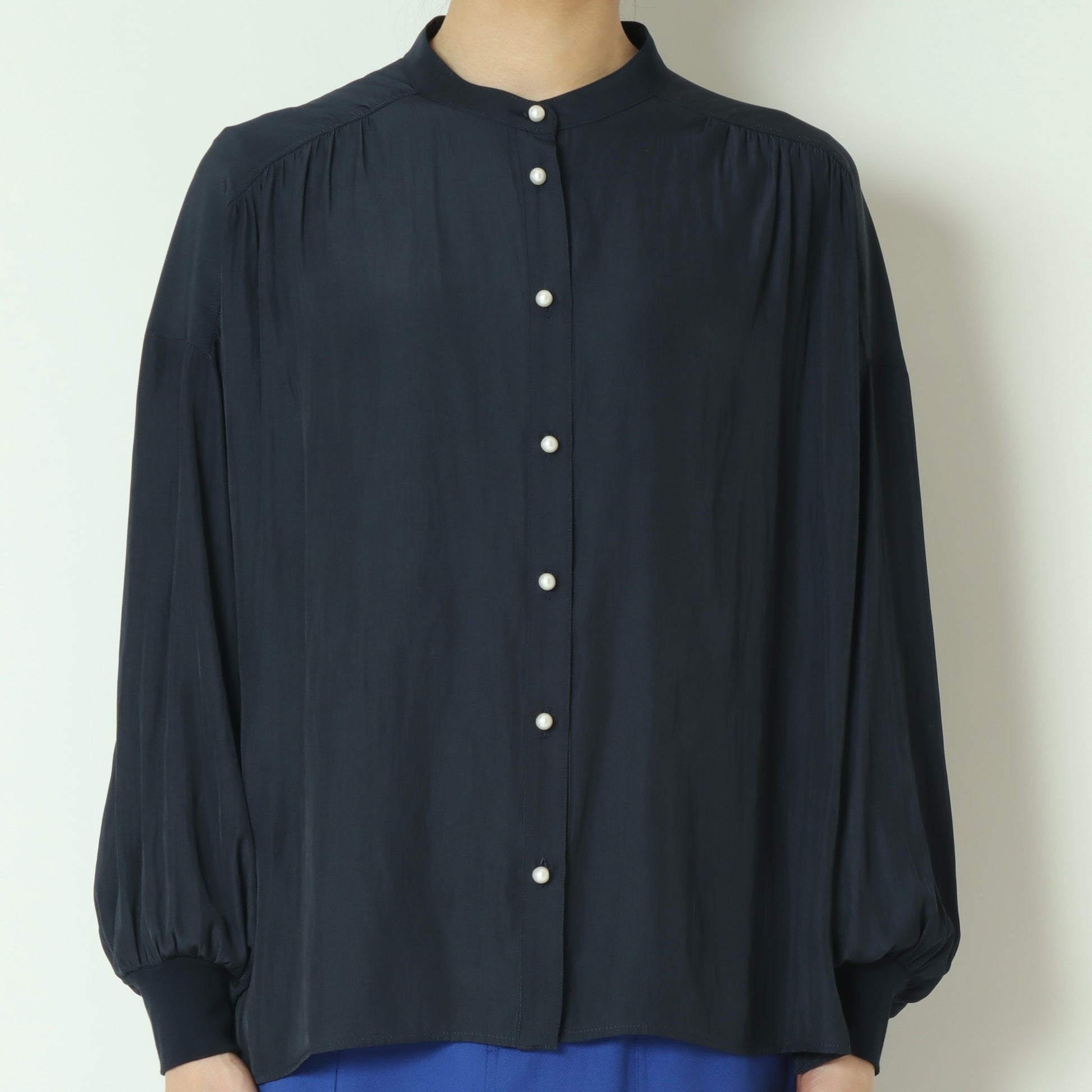 パールボタンがエレガントなドルマンスリーブシャツ。