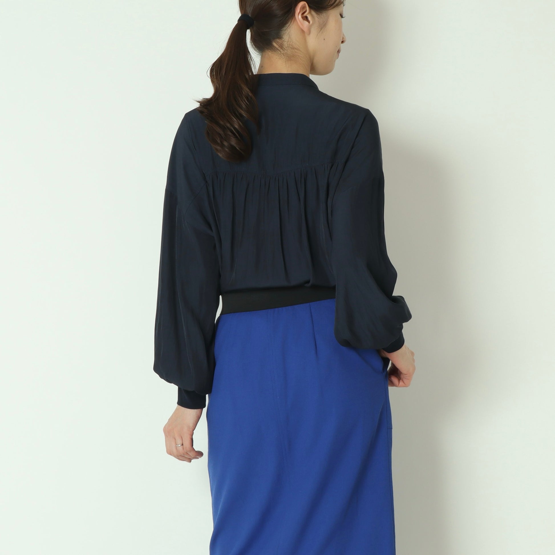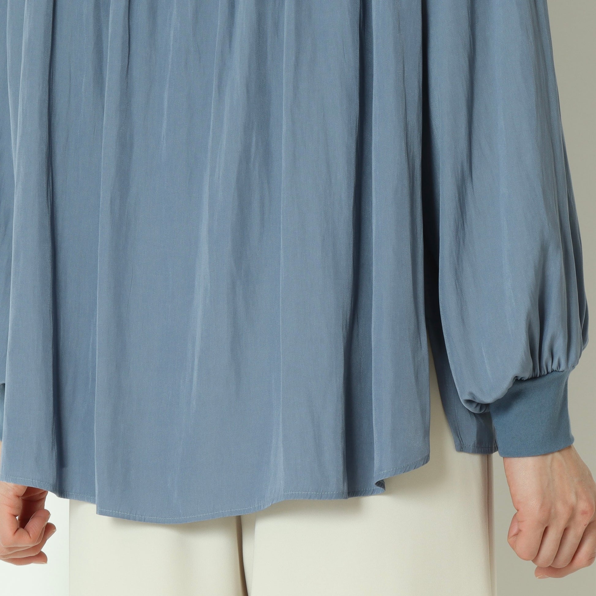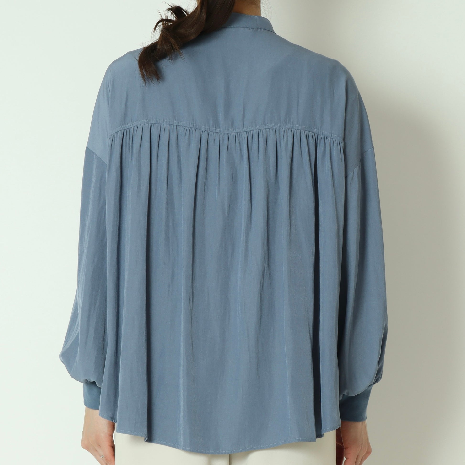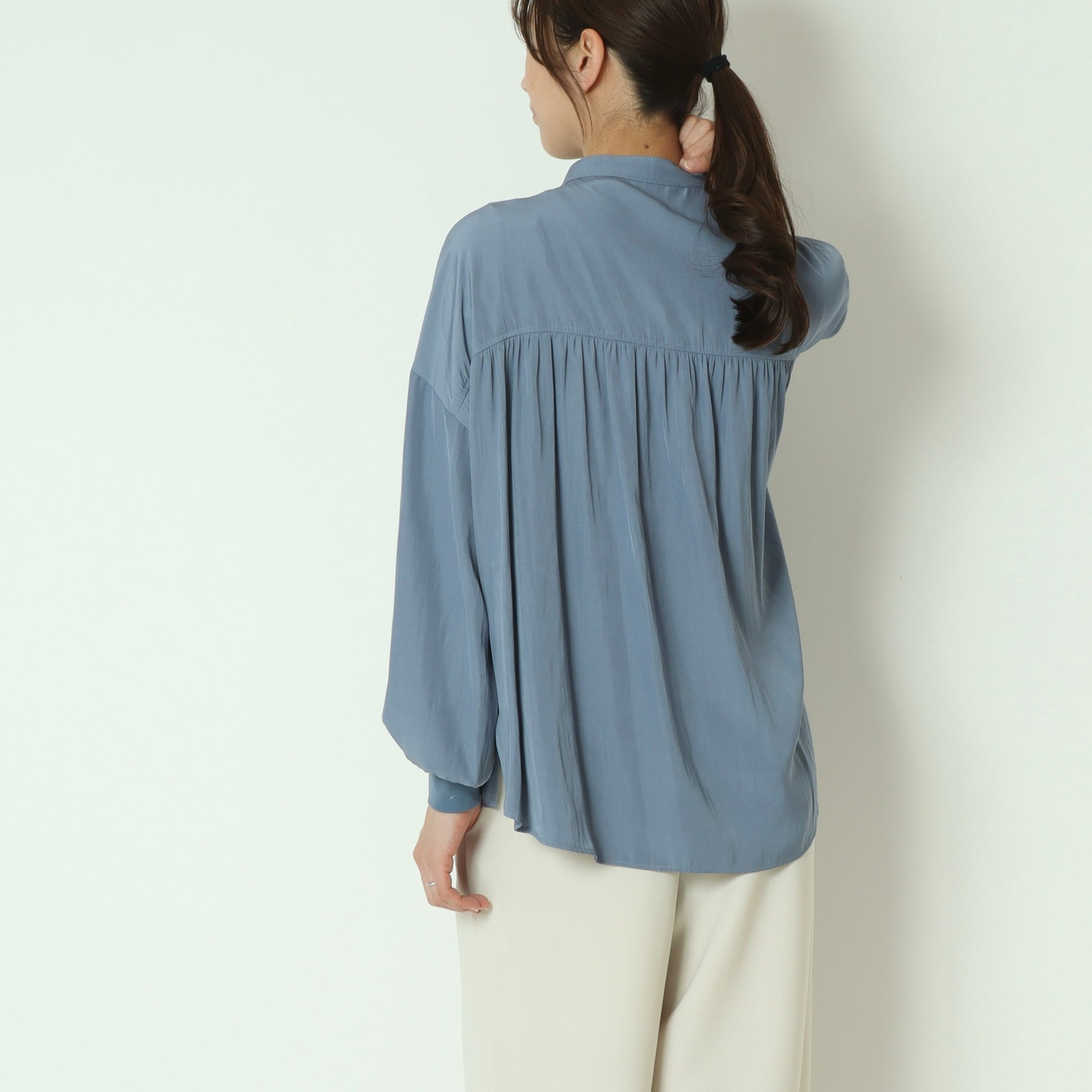 パールボタンがエレガントなドルマンスリーブシャツ。