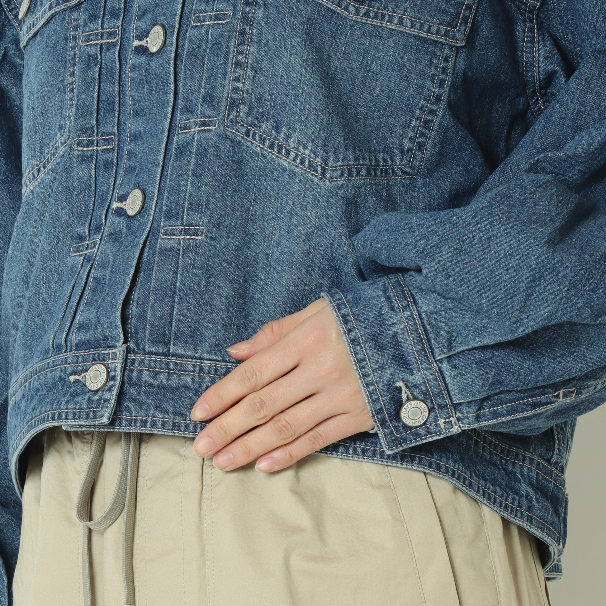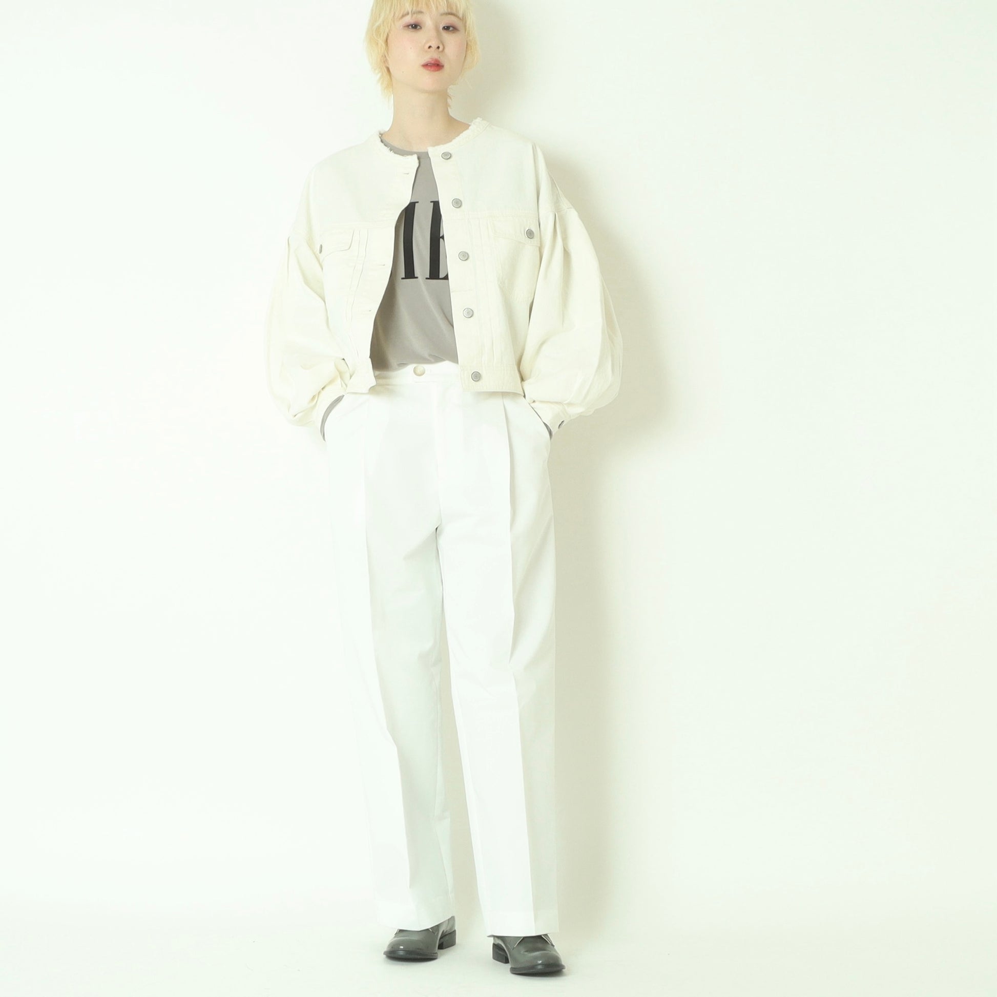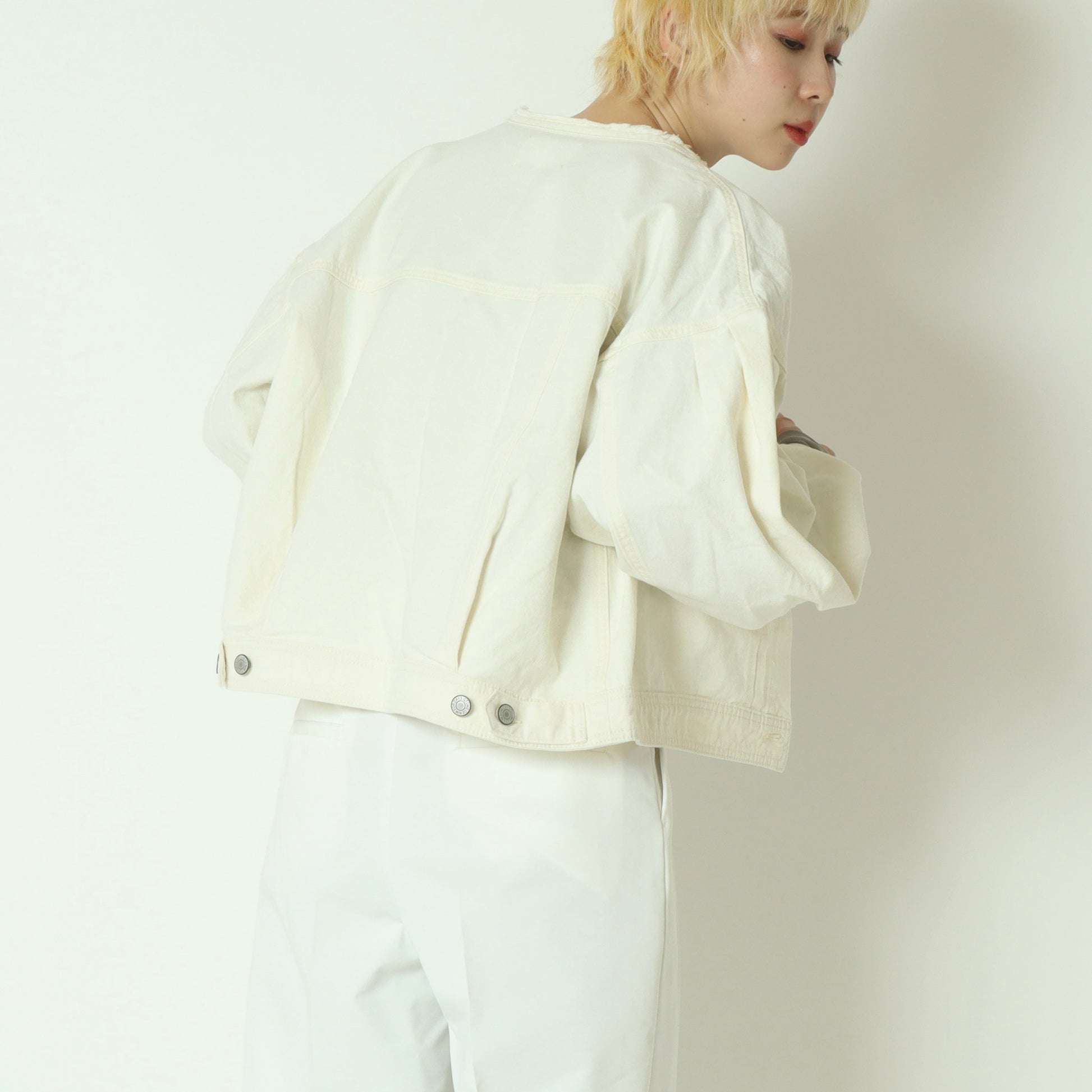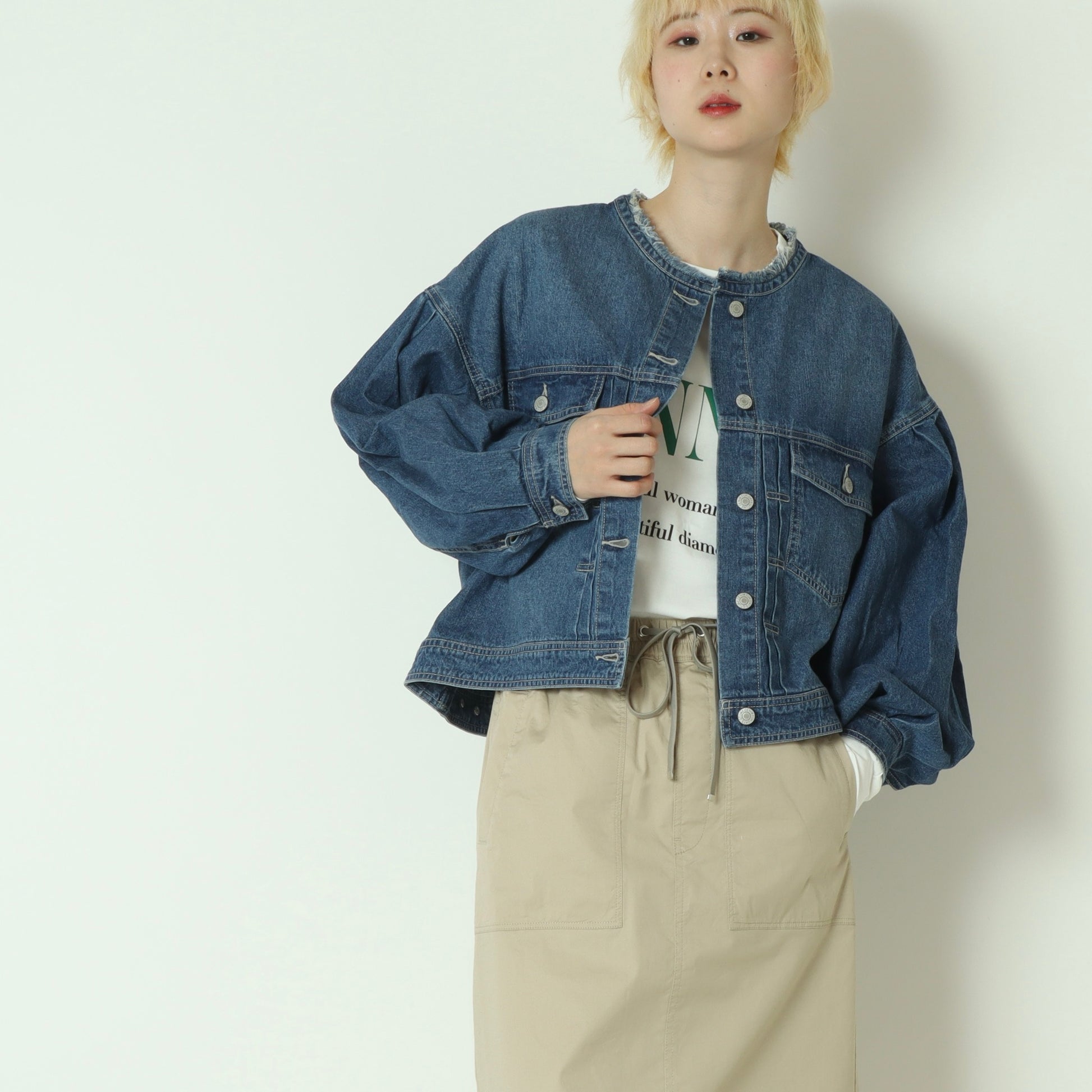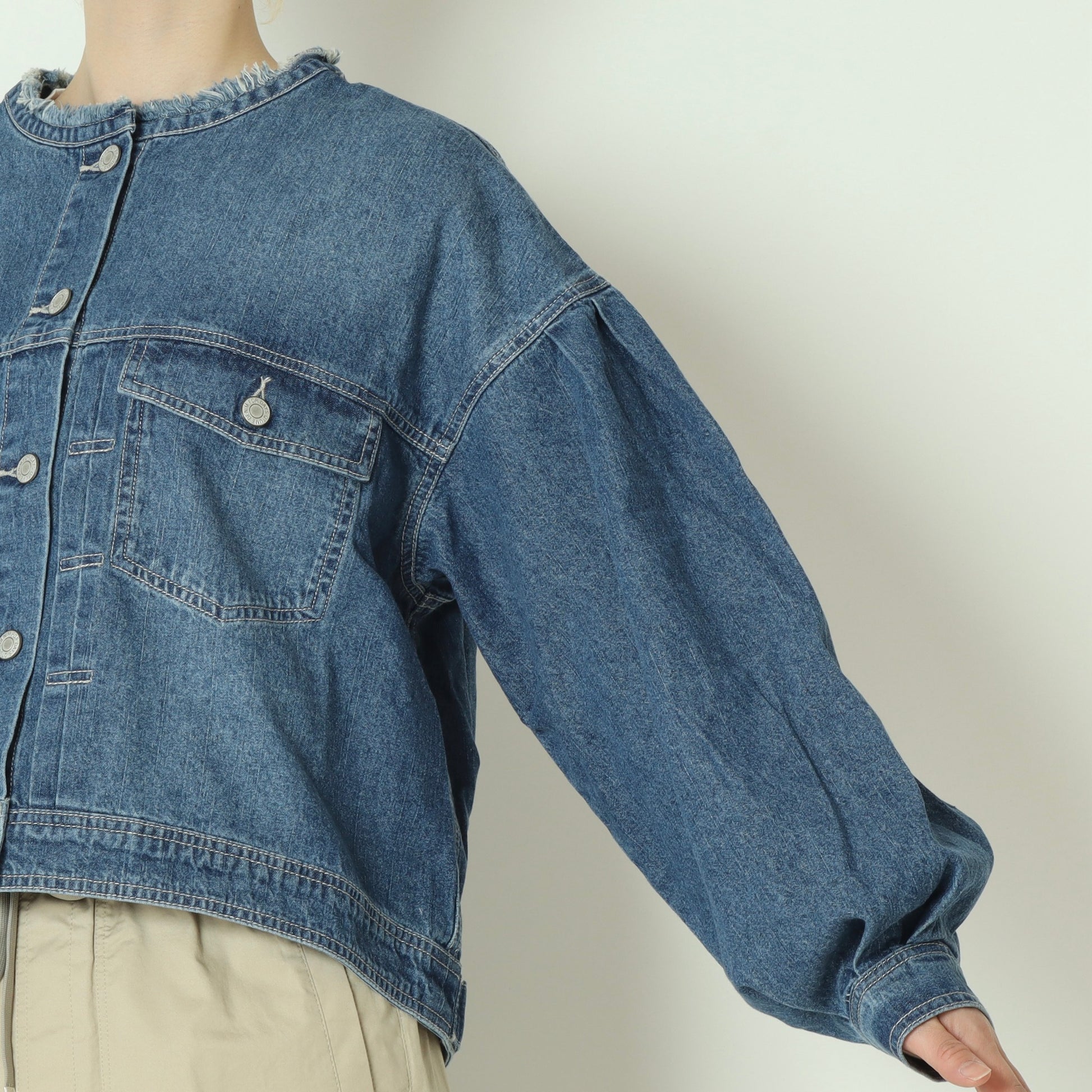 コンパクトなバランスが大人可愛いノーカラーデニムジャケット。