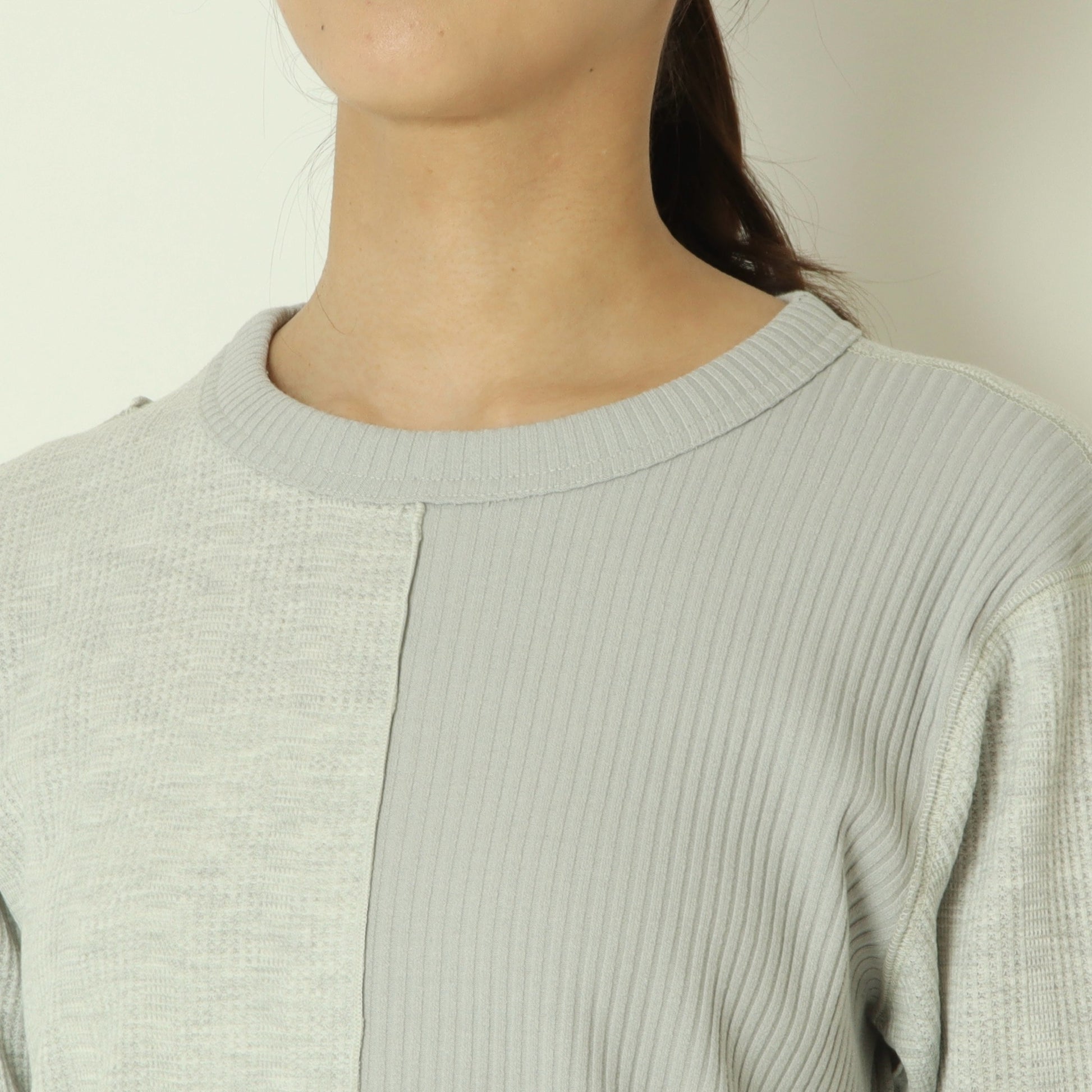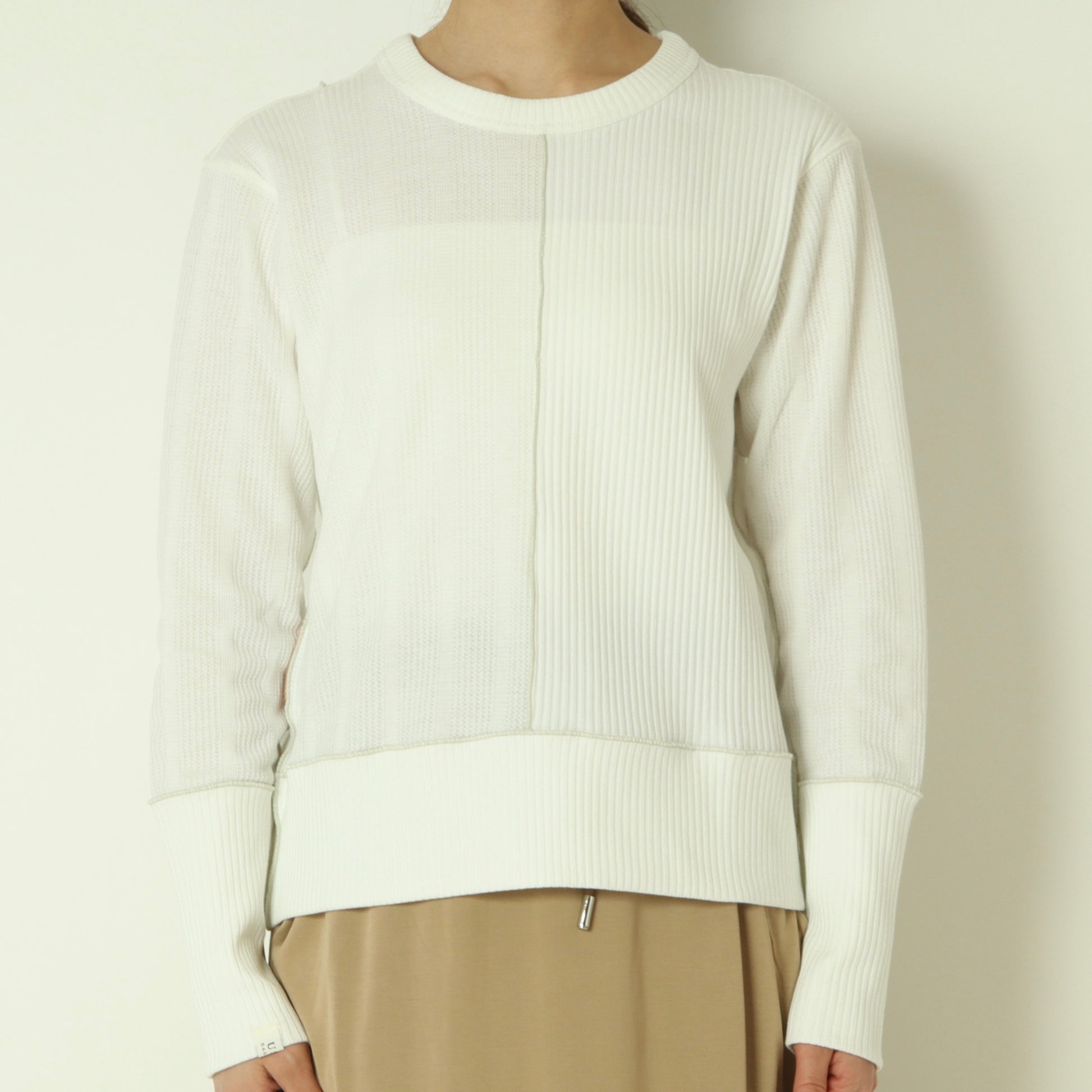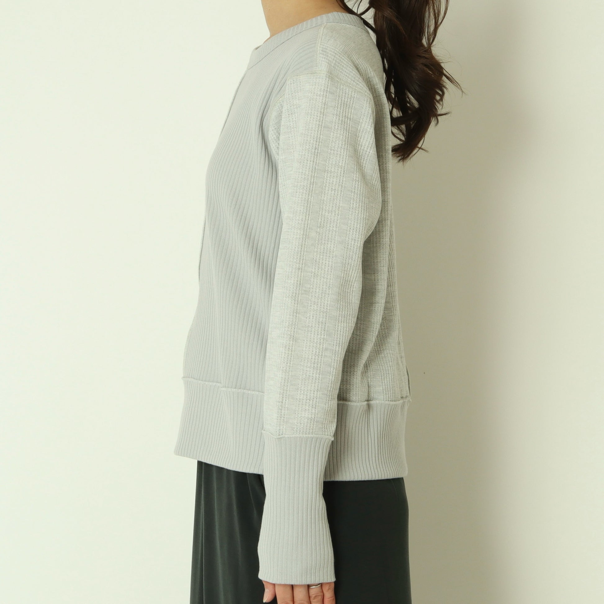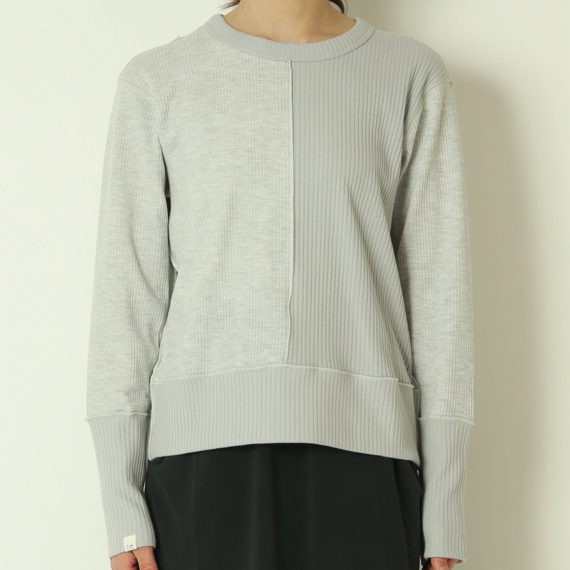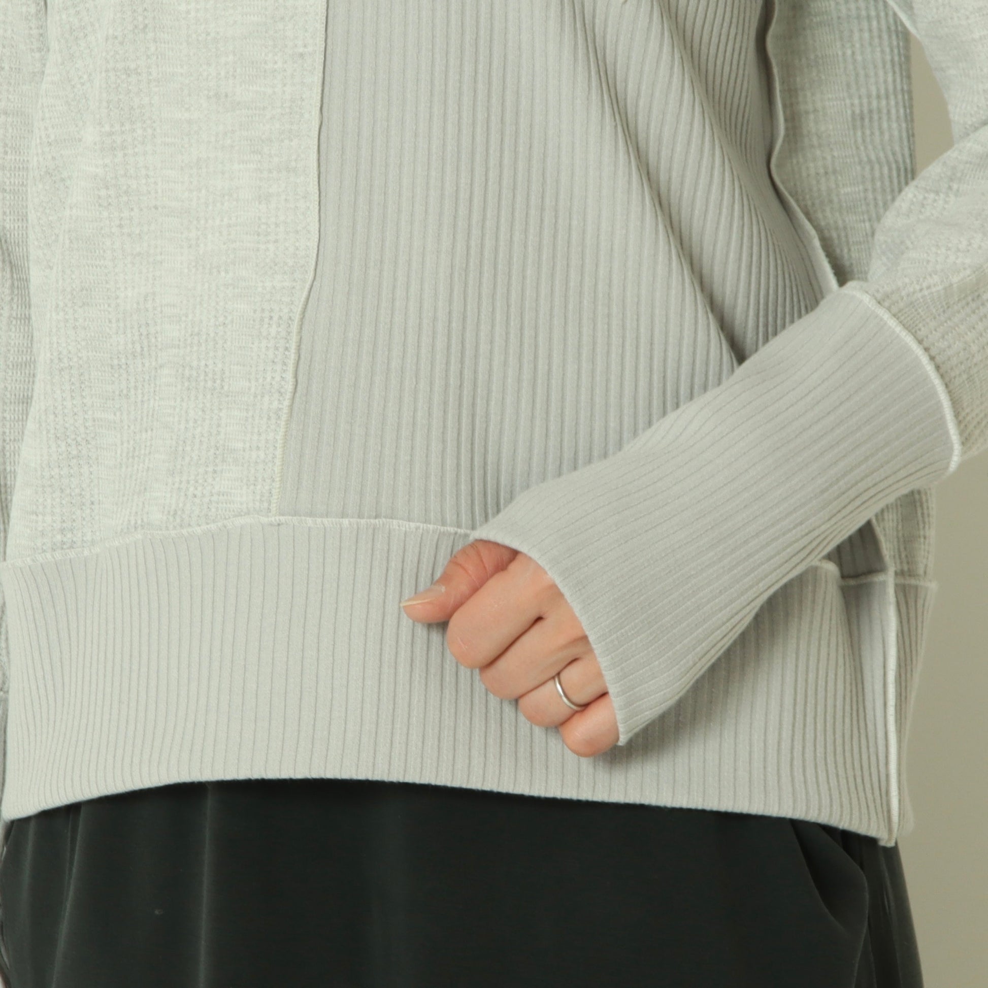 右側はストライプのサーマル素材、左側は伸縮性のあるテレコ素材と異なる表情の素材をドッキングさせ、シンプルながら存在感のある印象です。