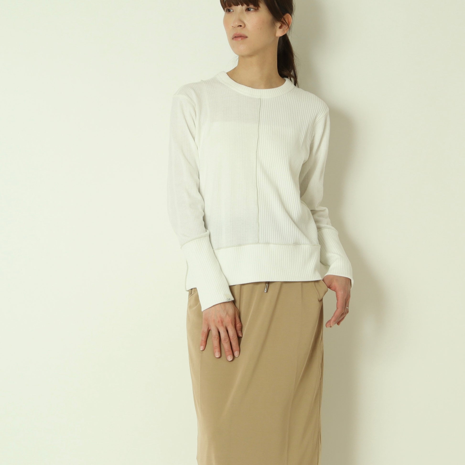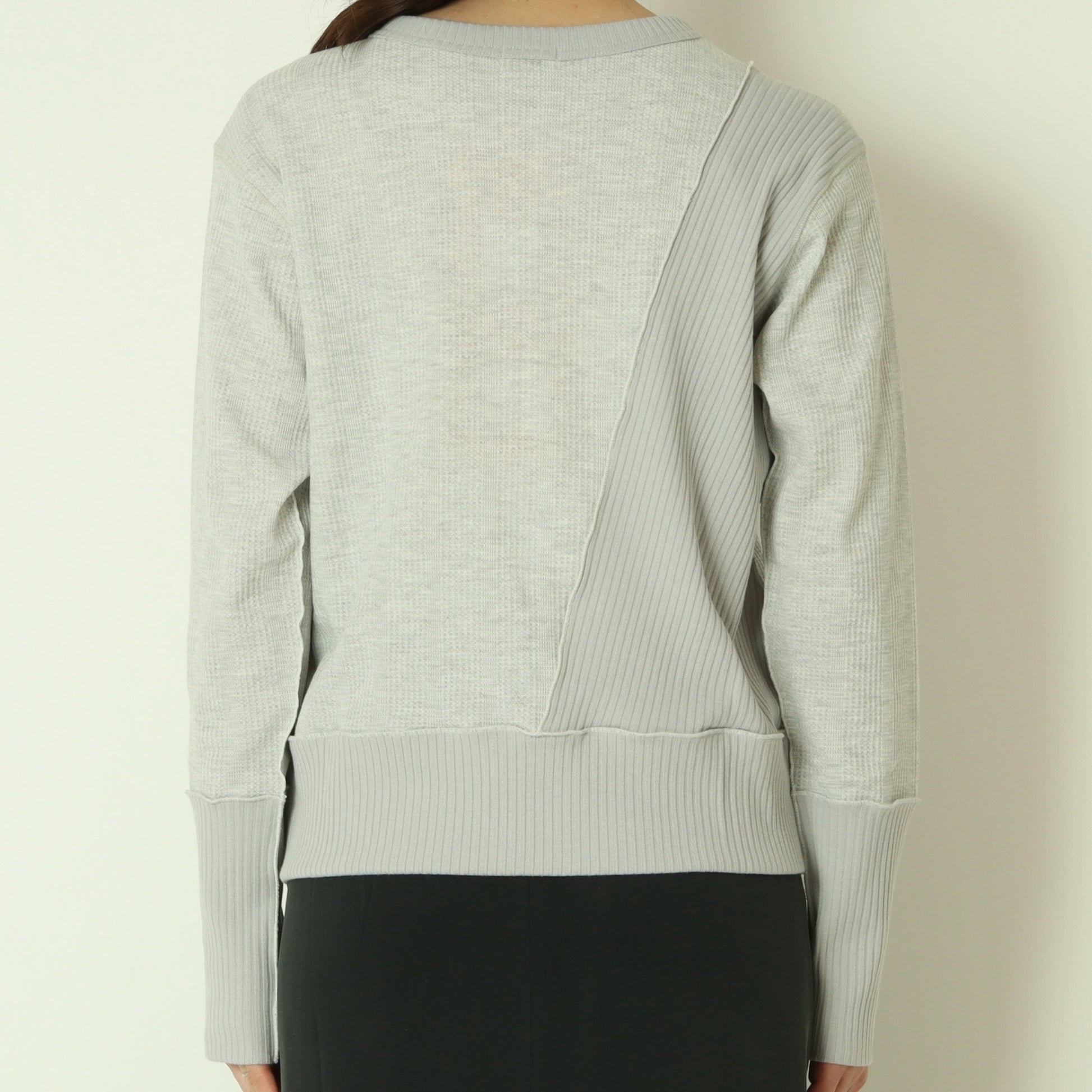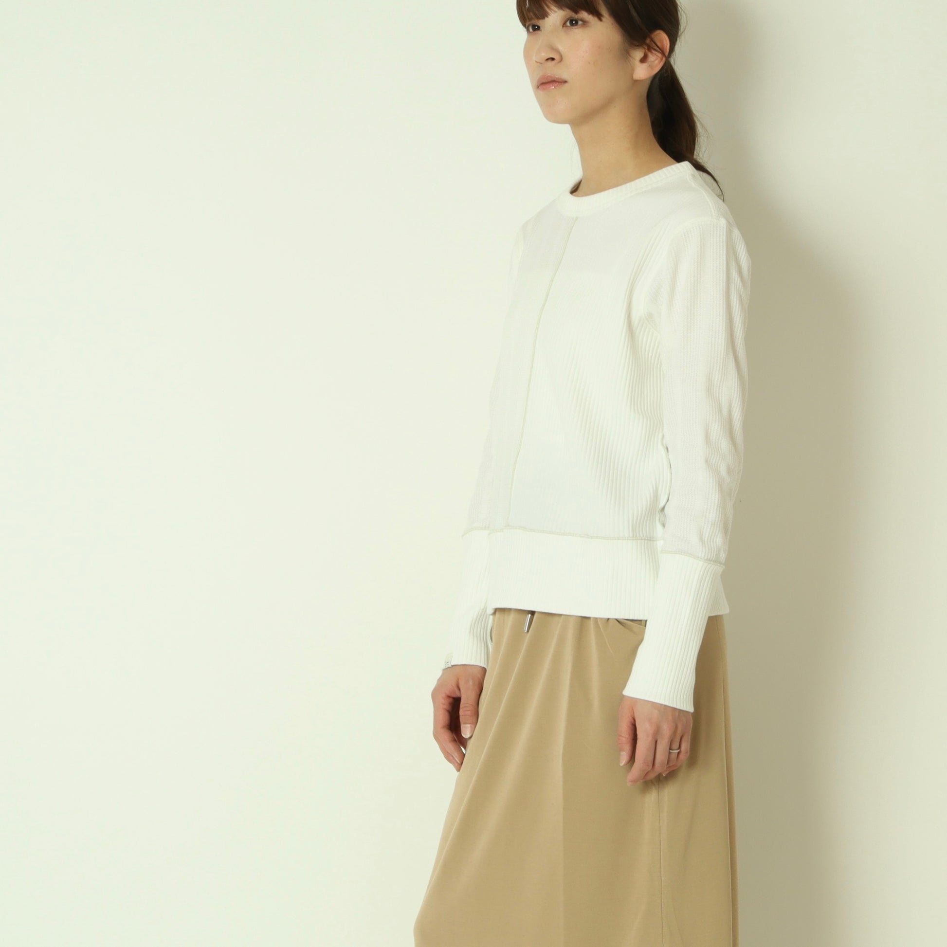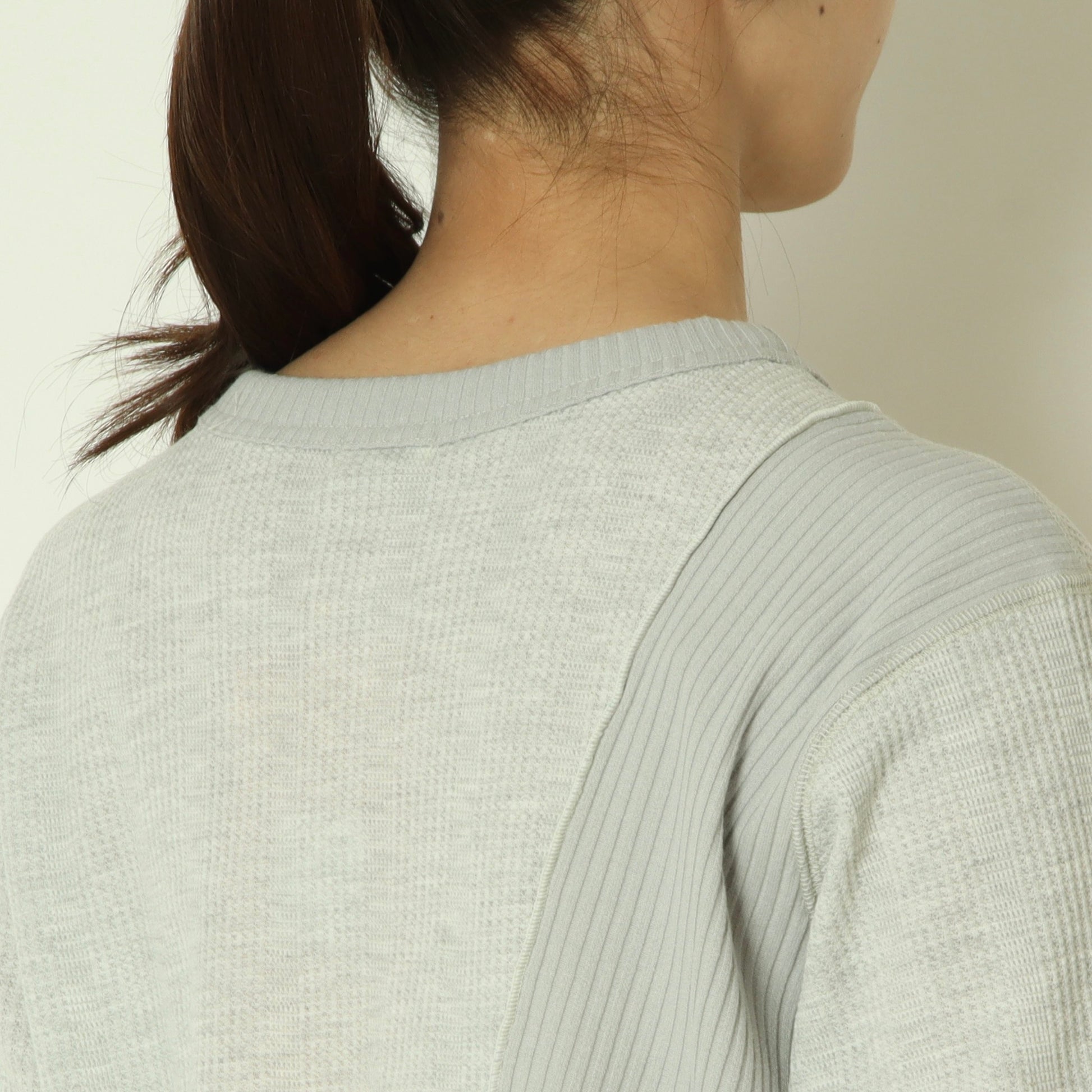 右側はストライプのサーマル素材、左側は伸縮性のあるテレコ素材と異なる表情の素材をドッキングさせ、シンプルながら存在感のある印象です。