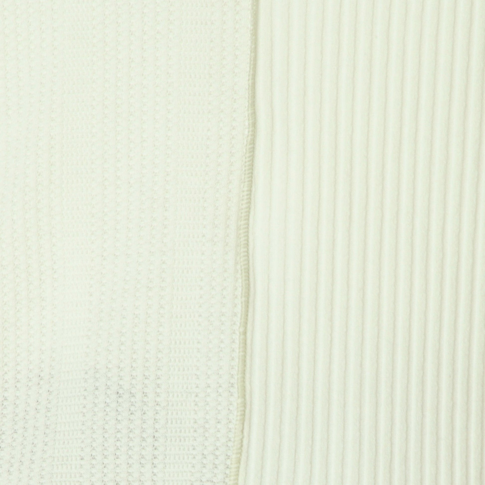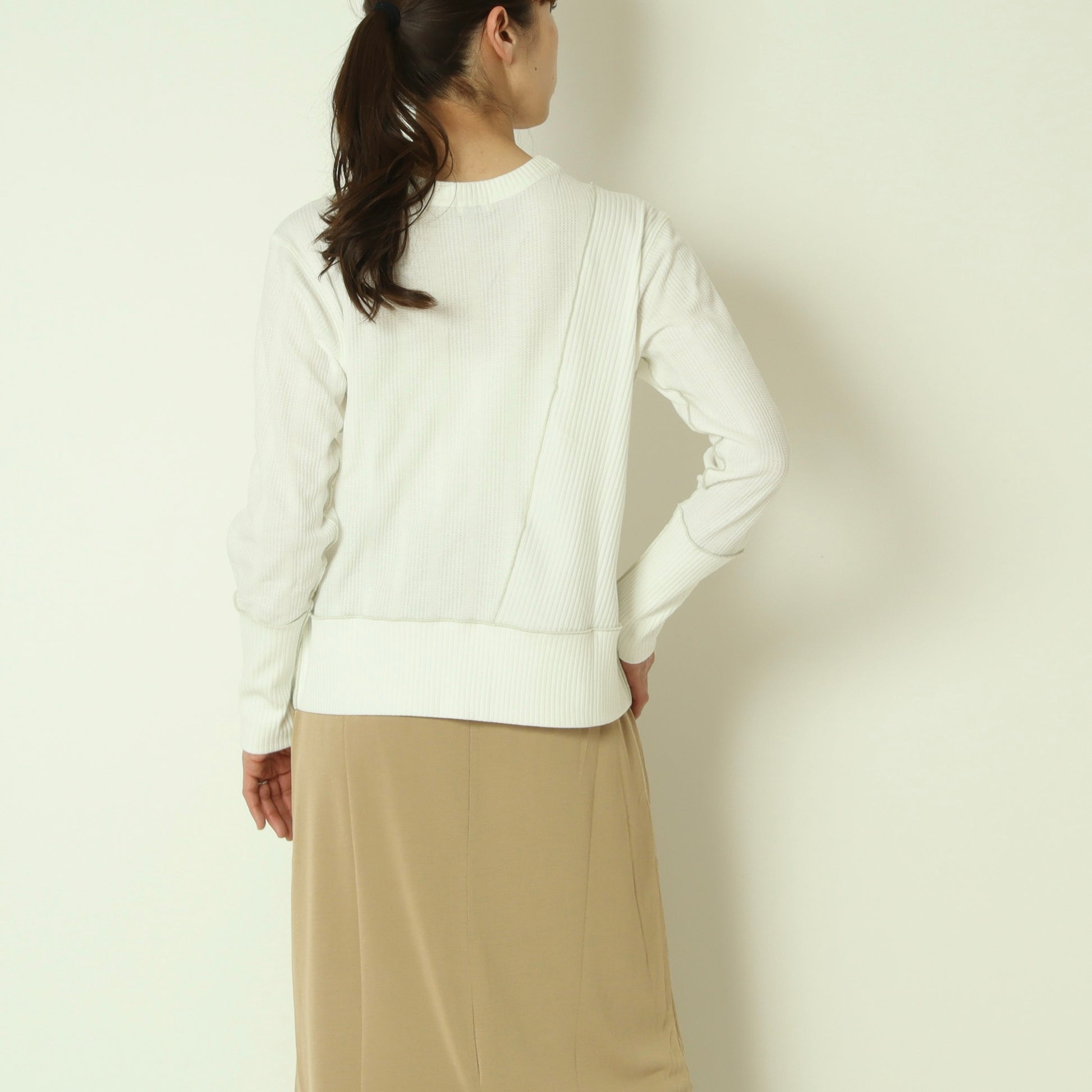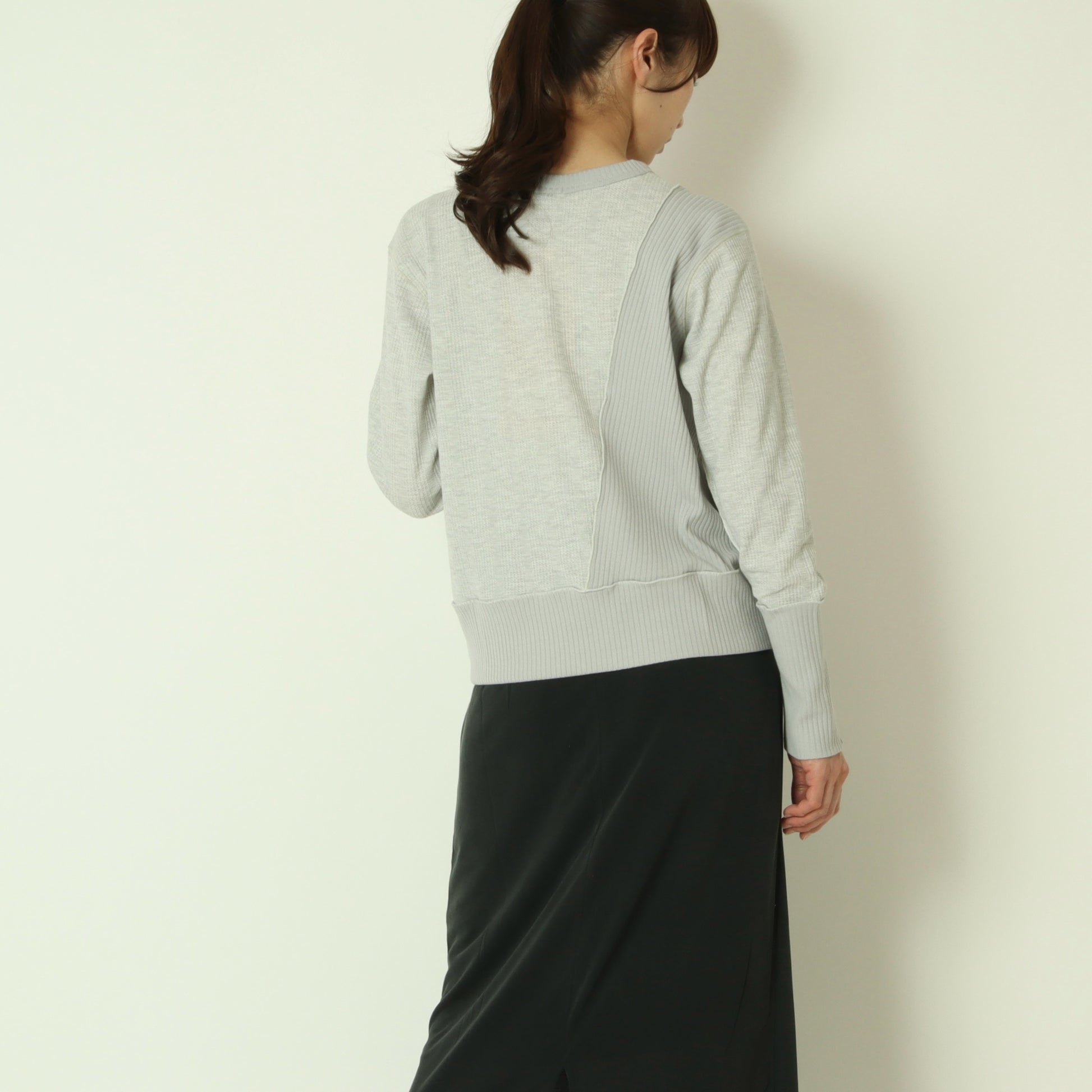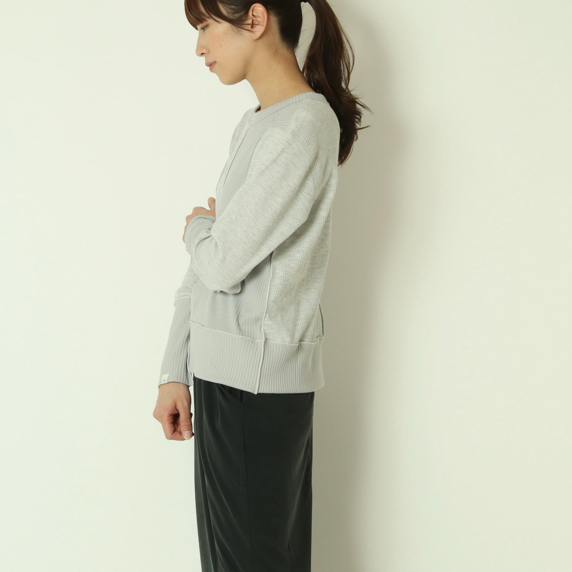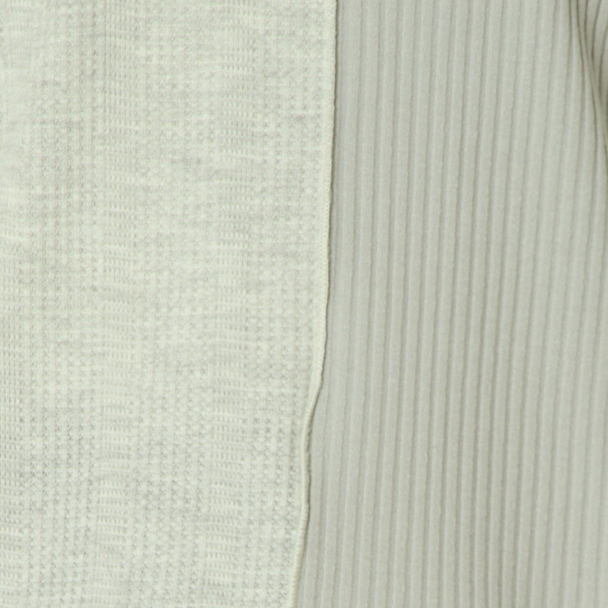 右側はストライプのサーマル素材、左側は伸縮性のあるテレコ素材と異なる表情の素材をドッキングさせ、シンプルながら存在感のある印象です。