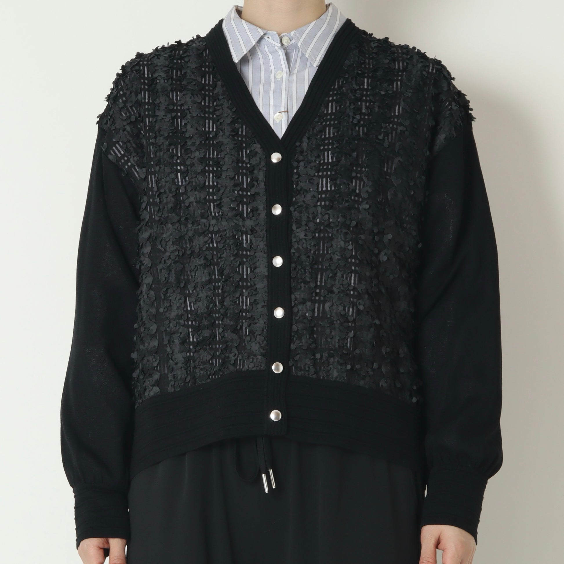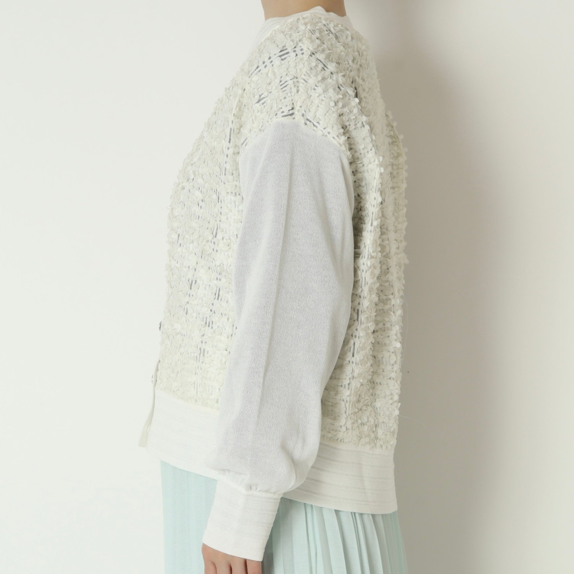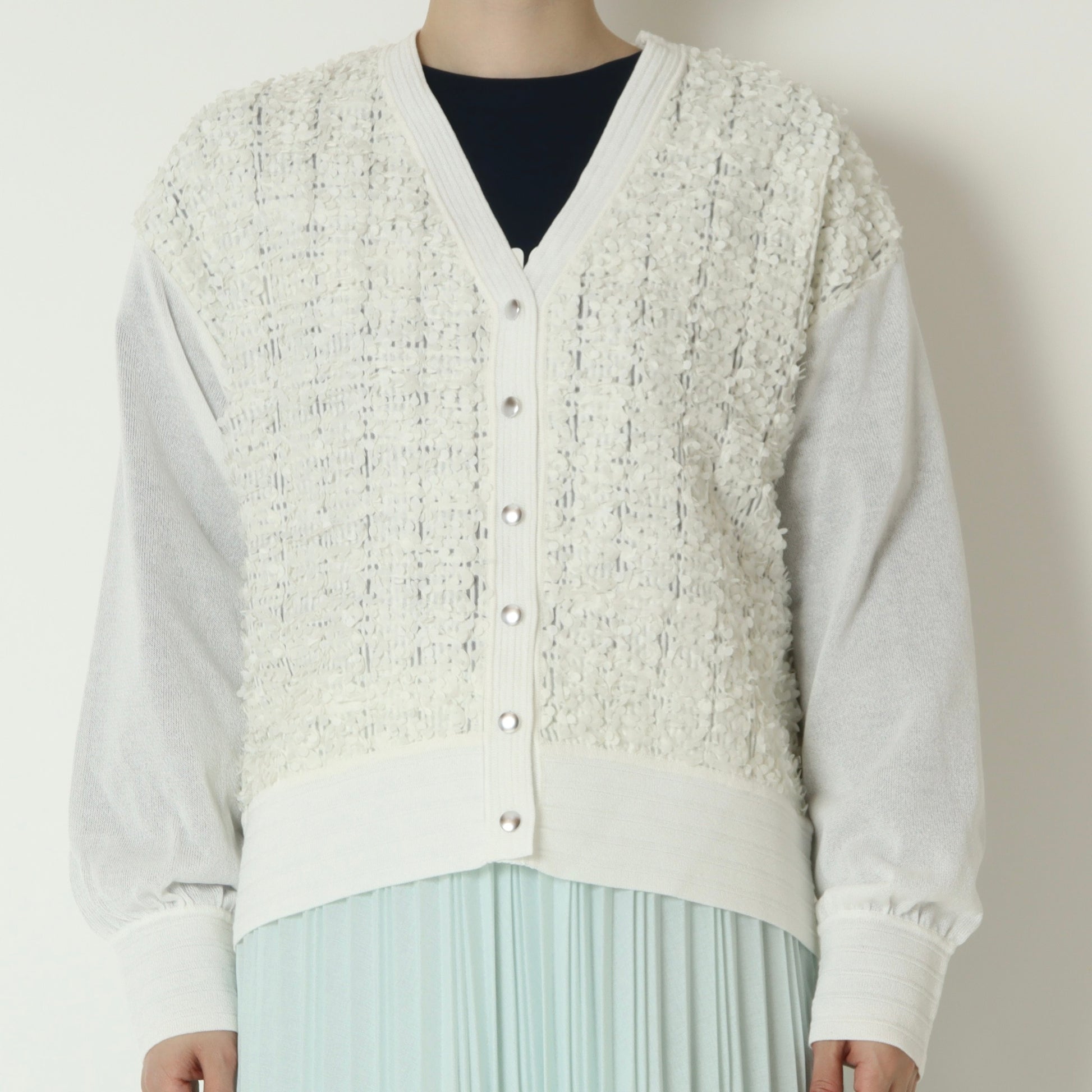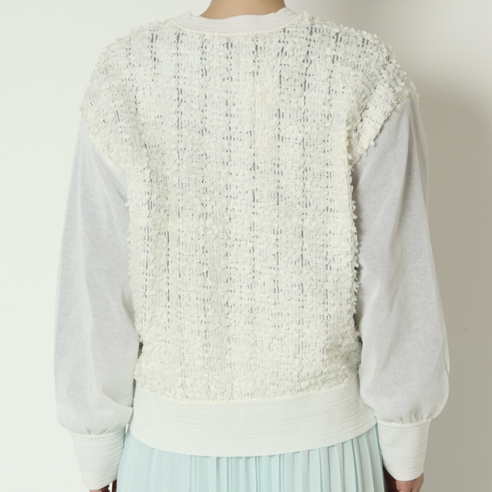 身頃はシアー素材に小さな花びらのような立体的なモチーフがあしらわれて華やかな印象◎