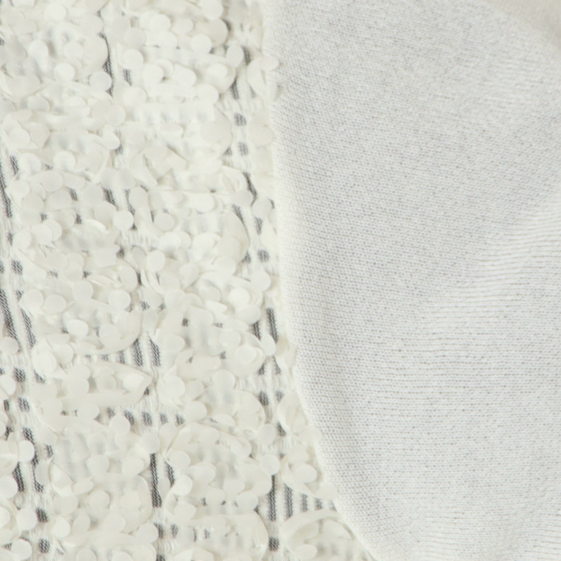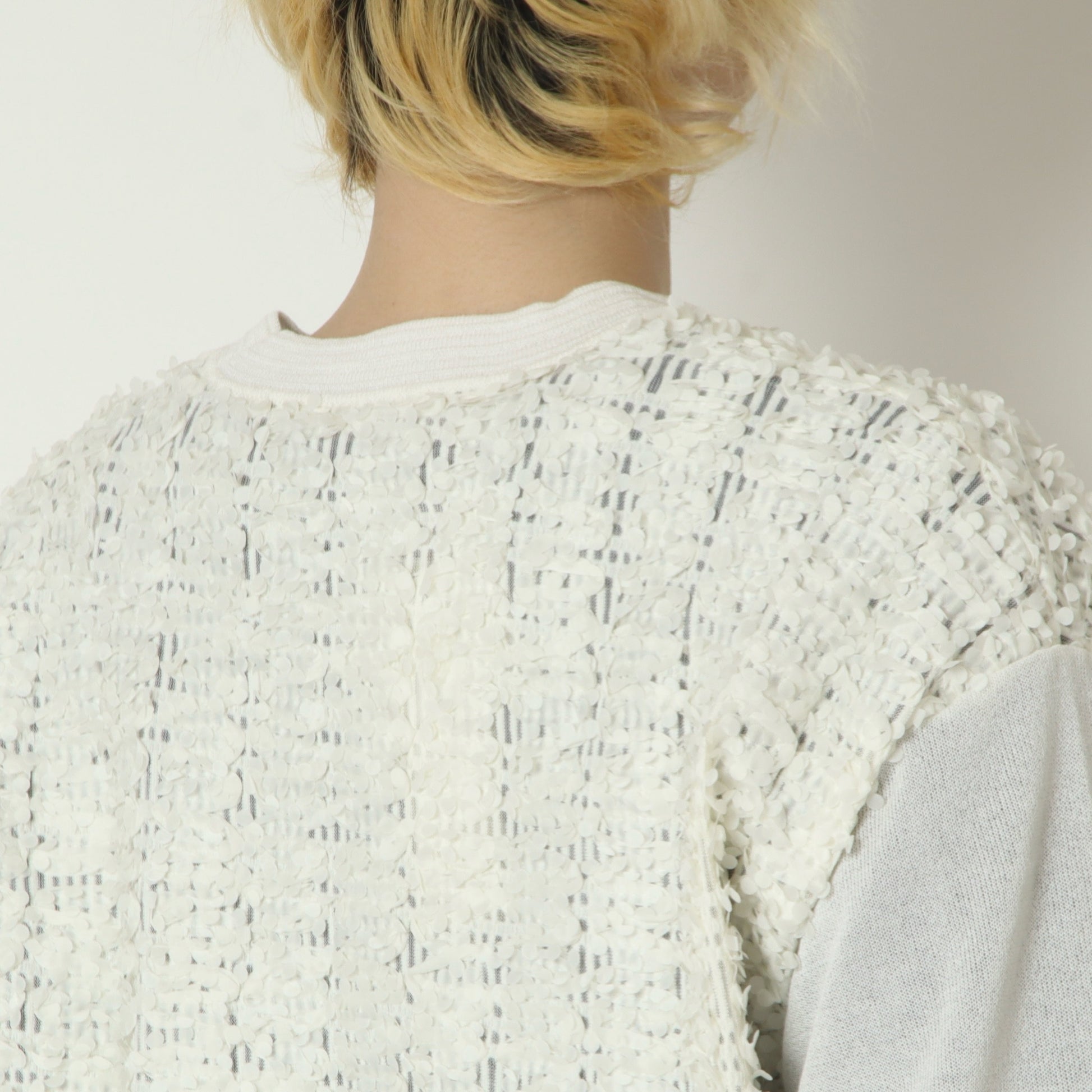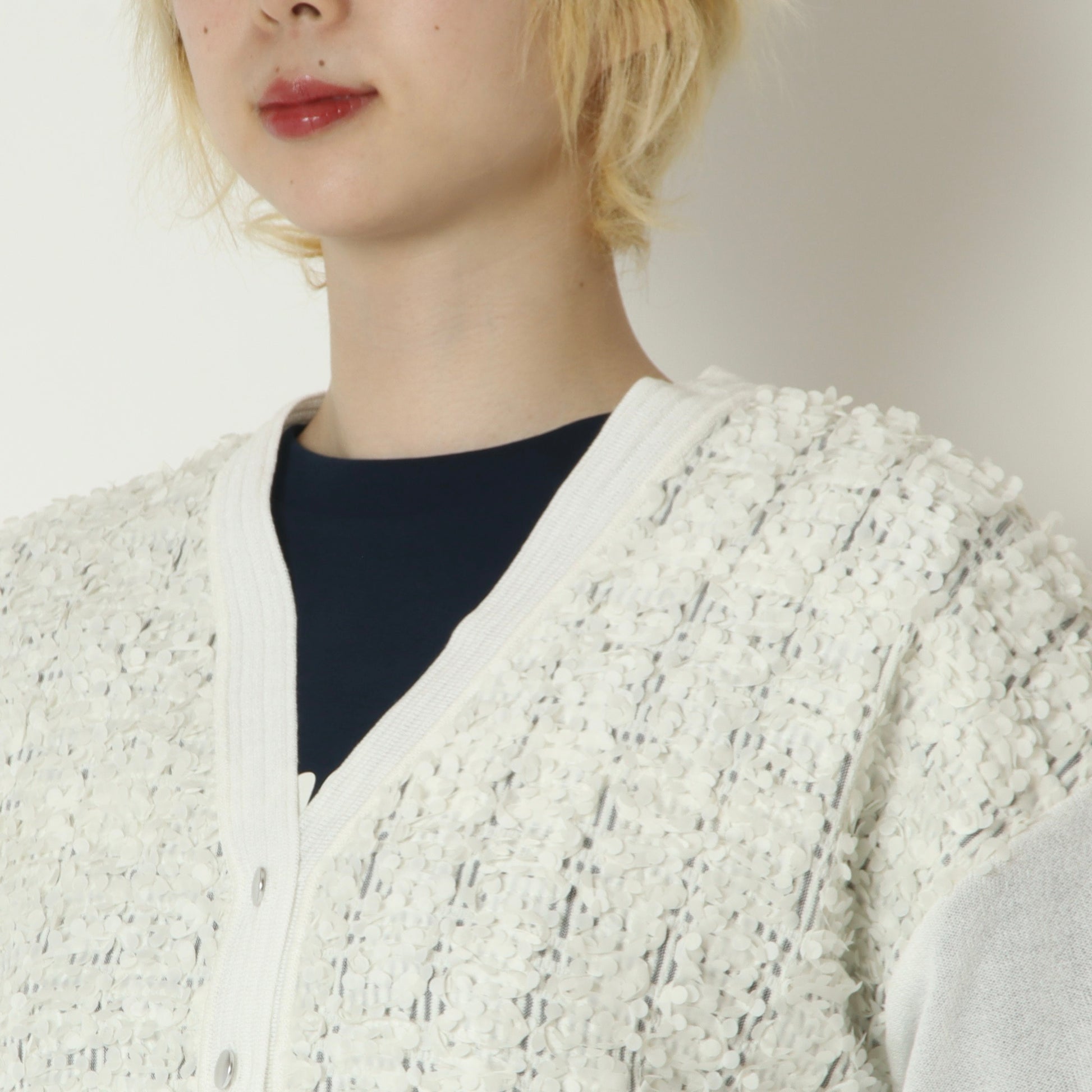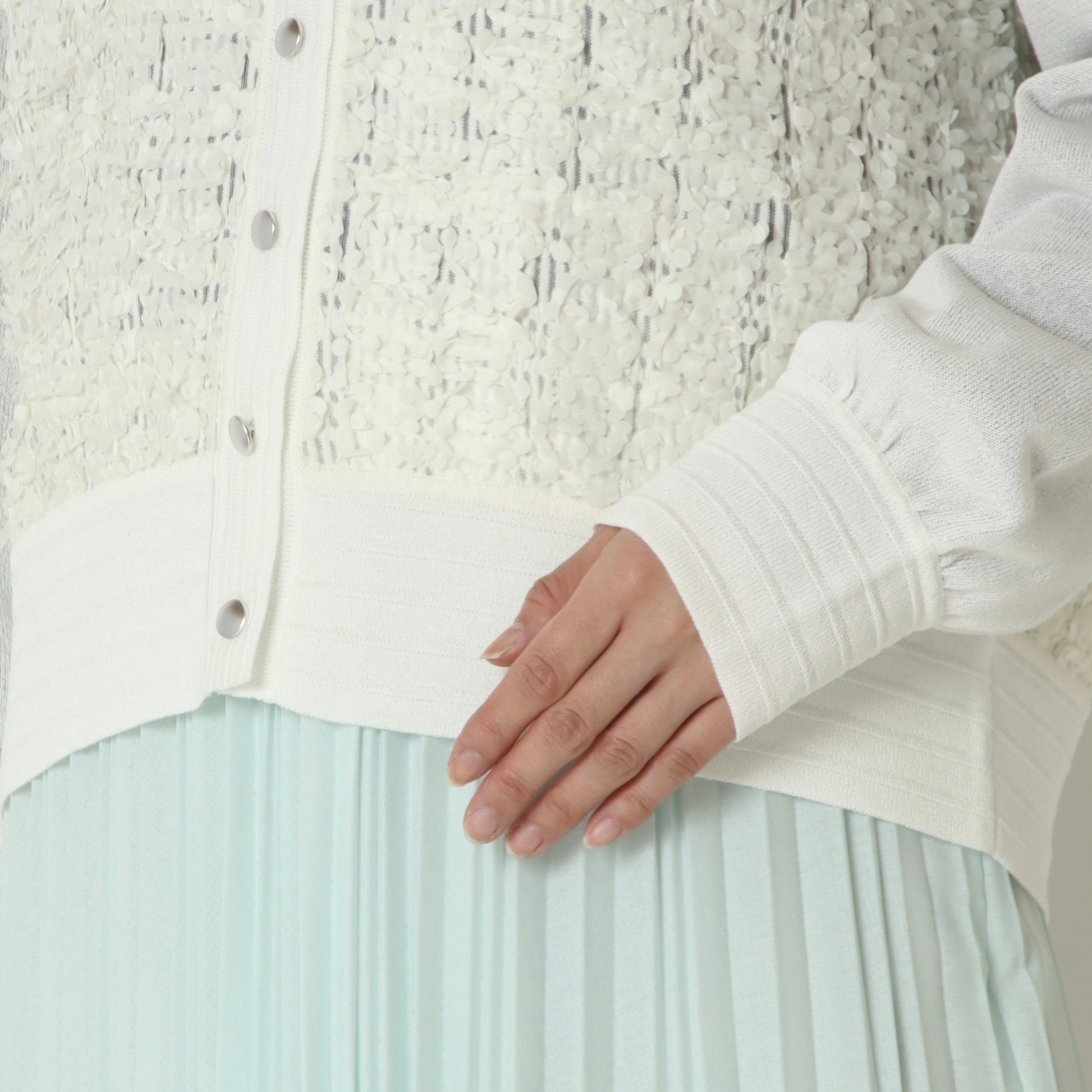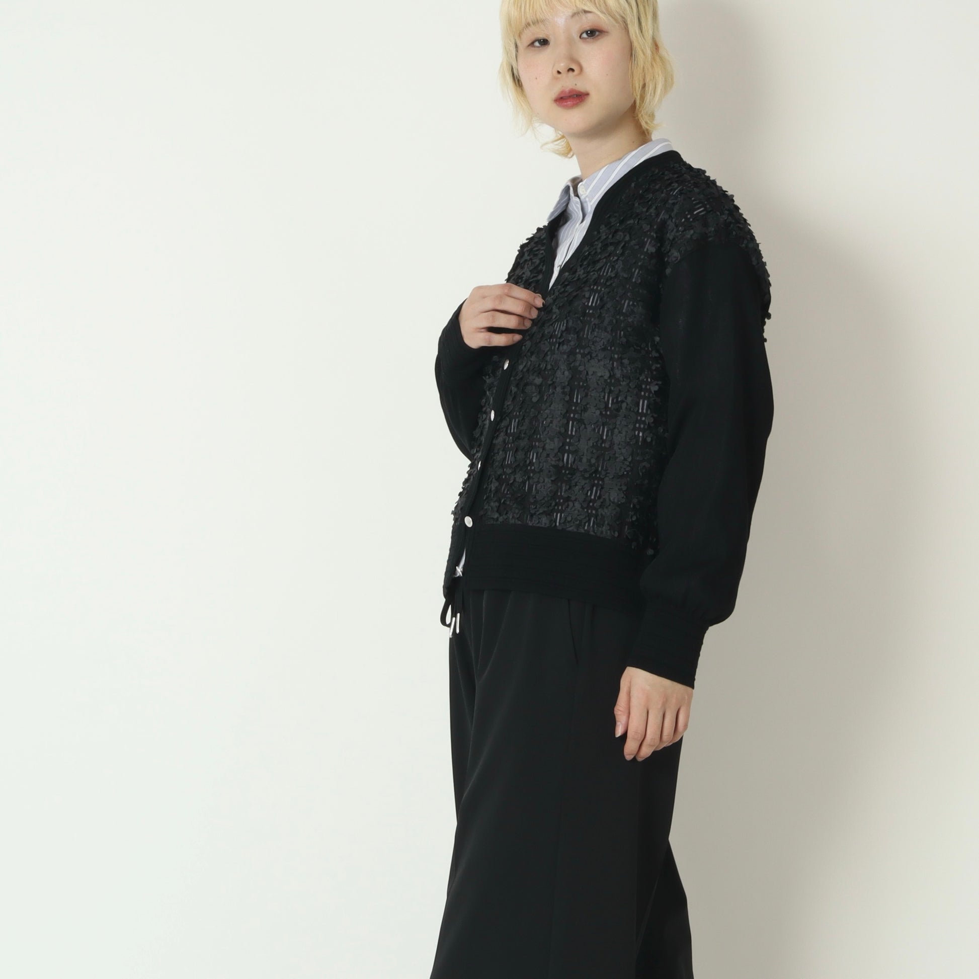 身頃はシアー素材に小さな花びらのような立体的なモチーフがあしらわれて華やかな印象◎
