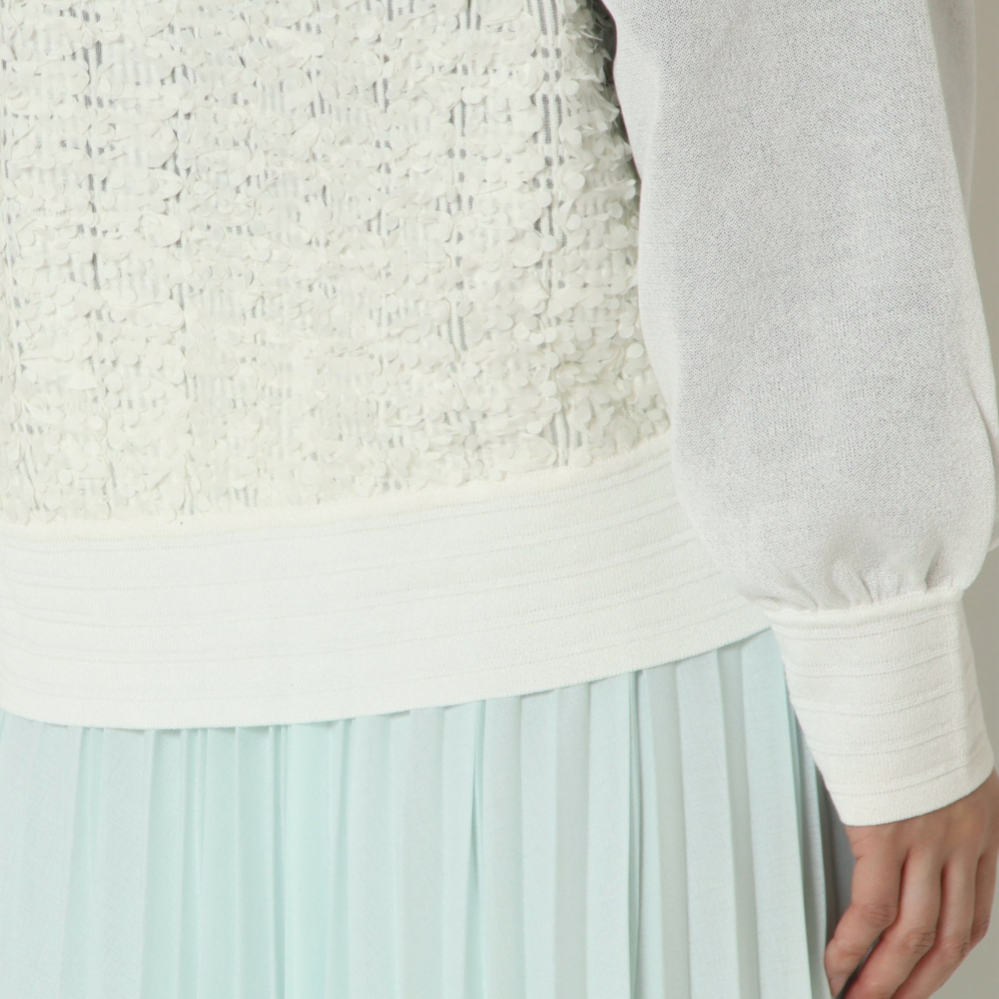 袖部分や裾にはシアー感のある軽やかなニット素材をドッキングしたメリハリのあるデザインです。