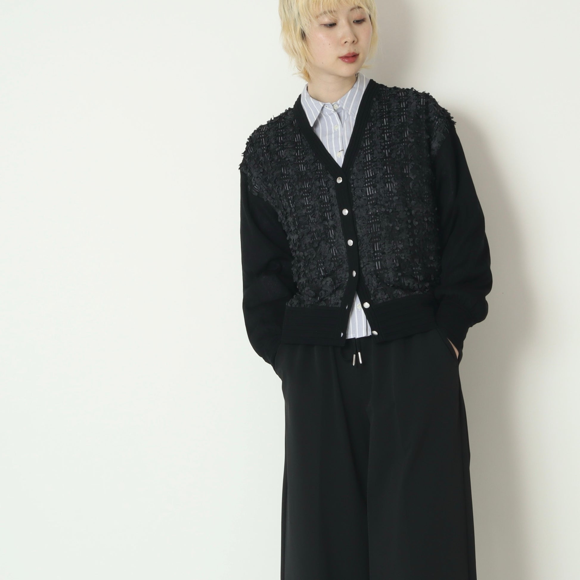 異素材を組み合わせたデザインが魅力のドッキングカーディガン。