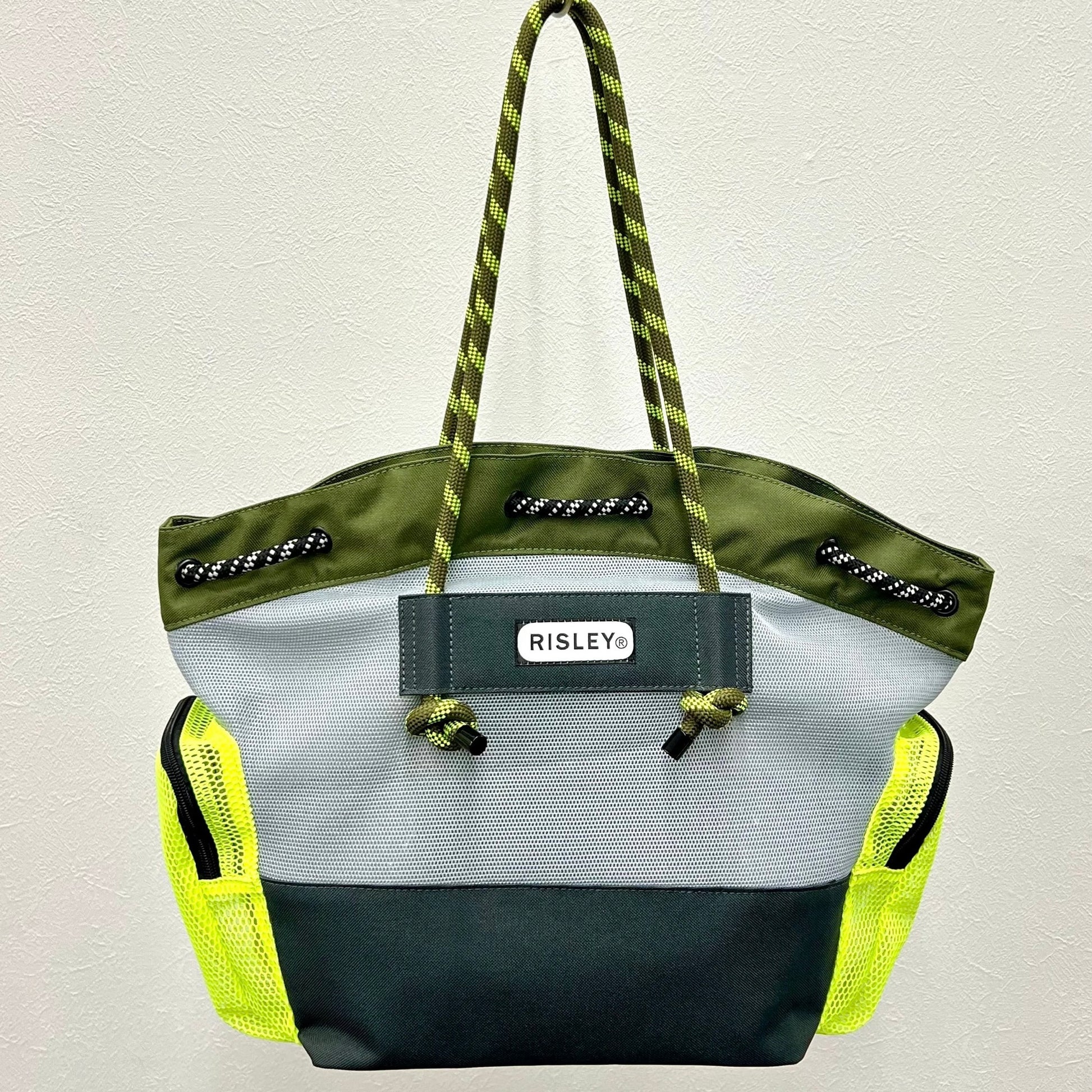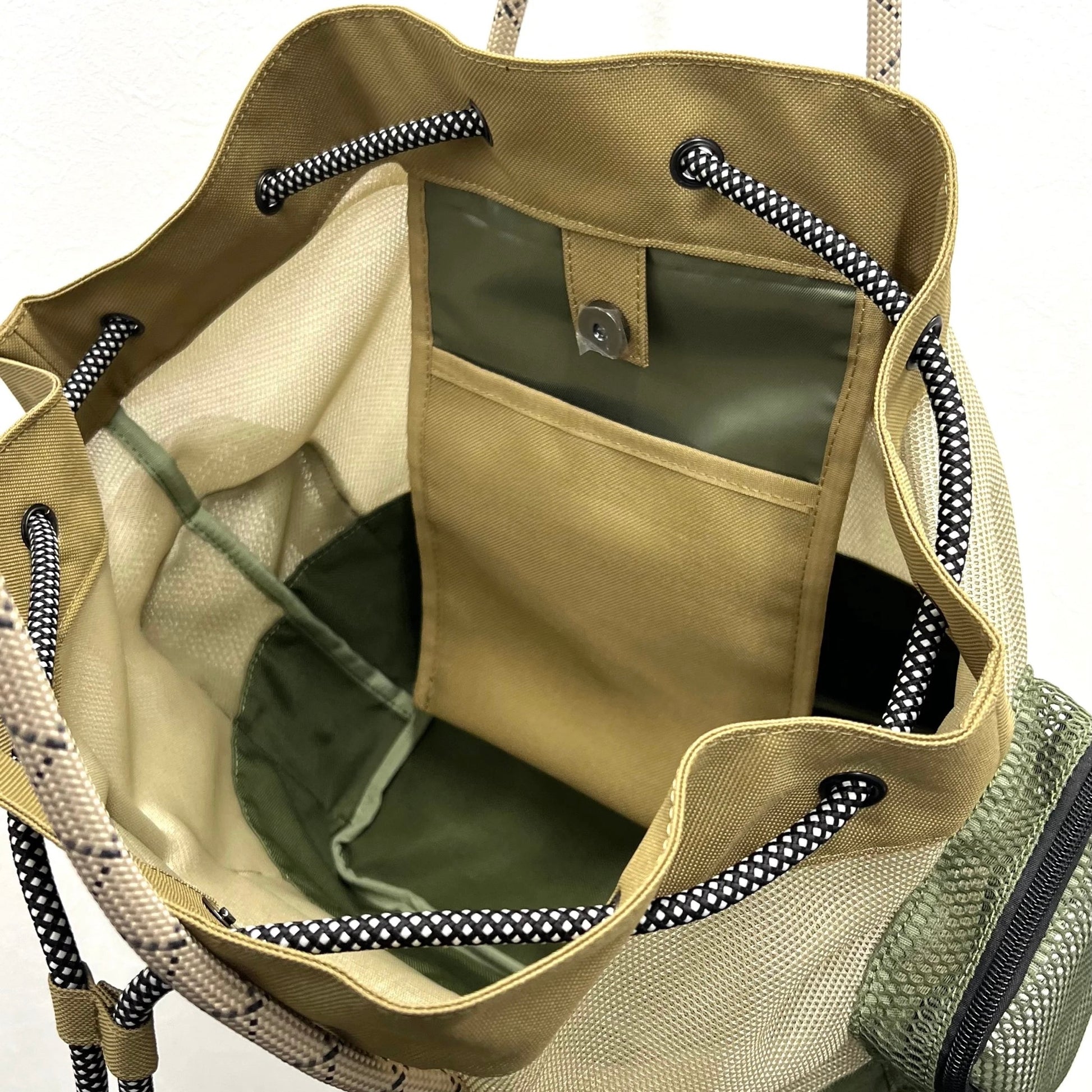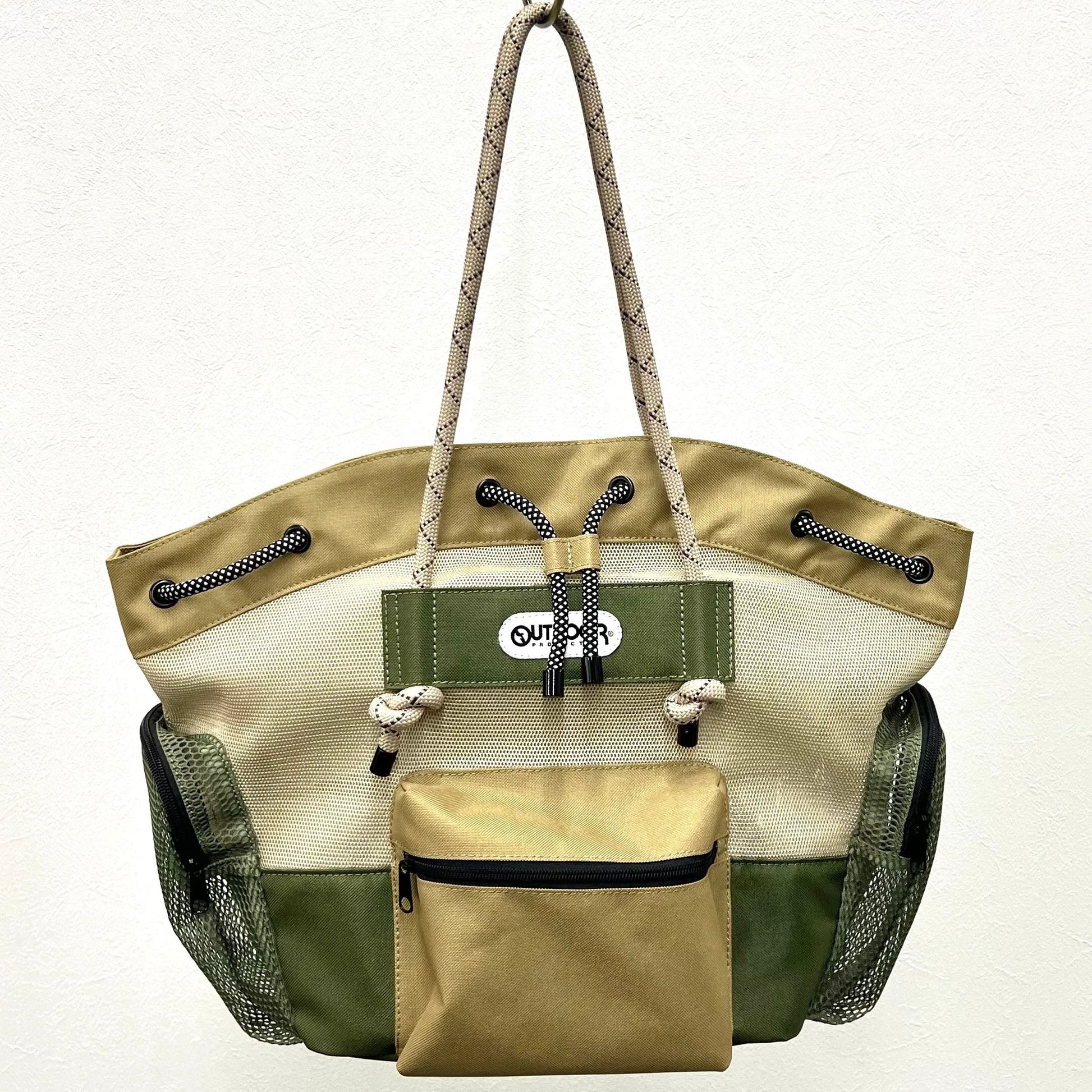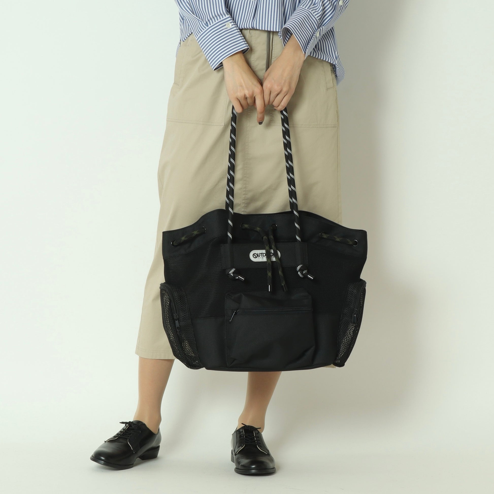 外側に収納ポケットを備えたメッシュトートバッグ。