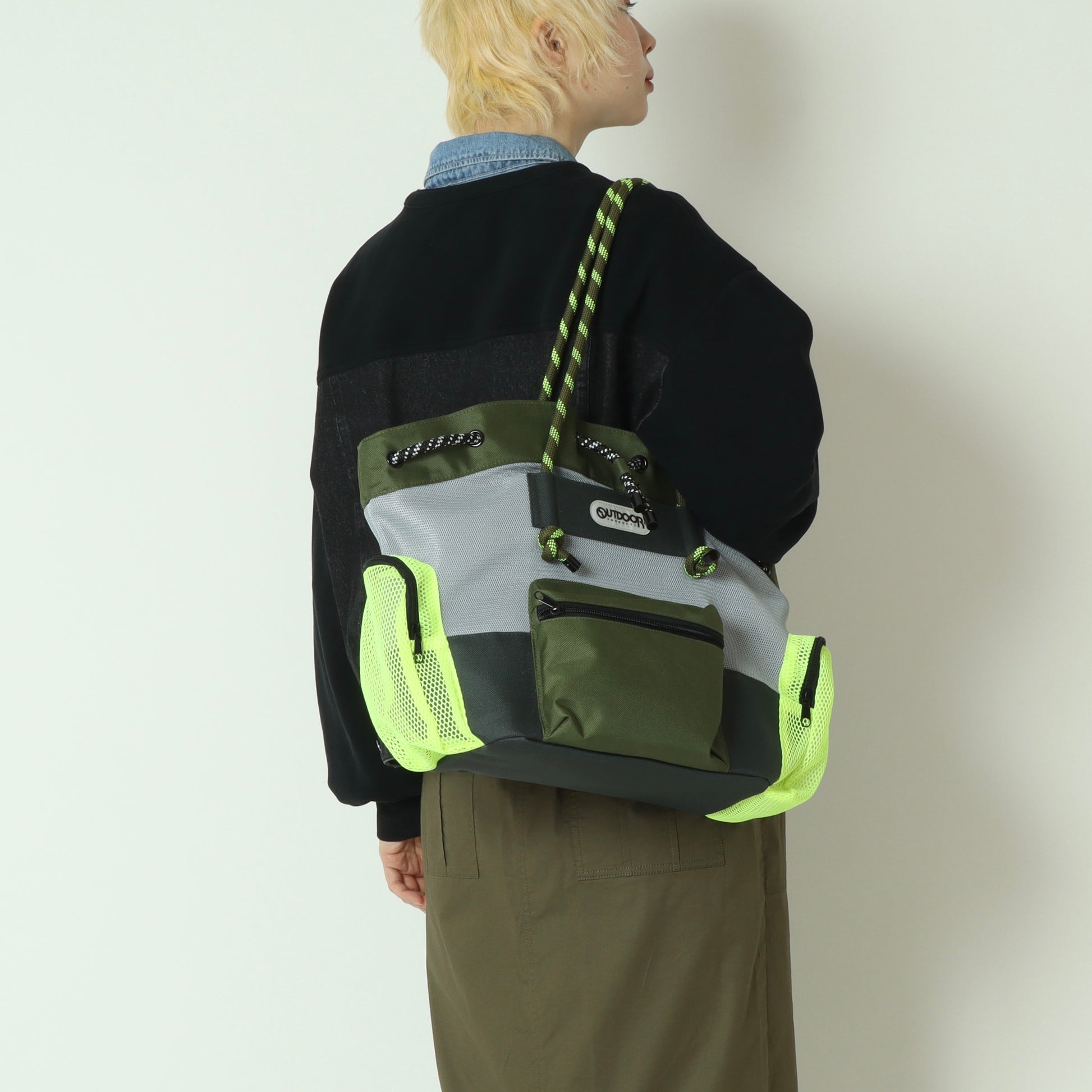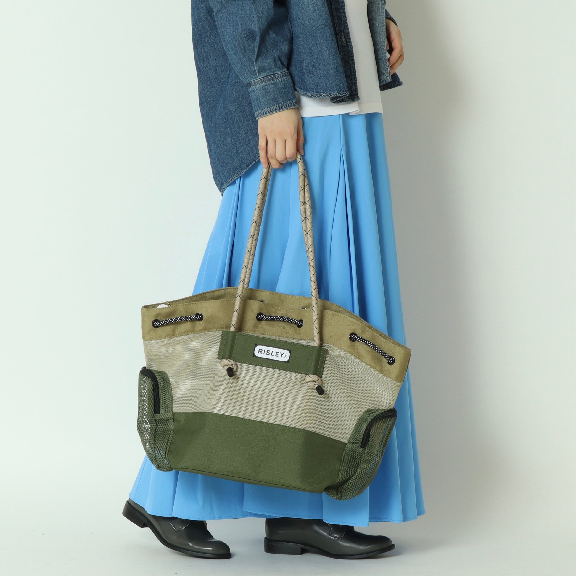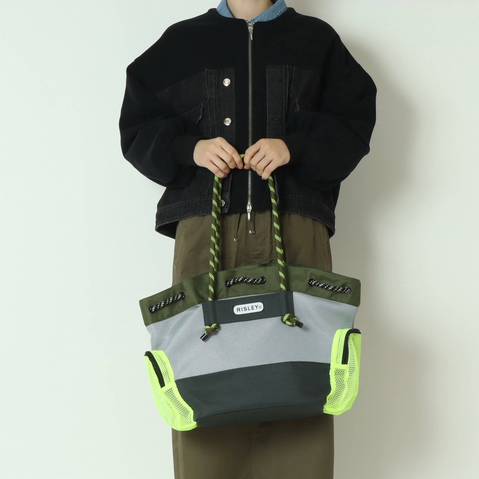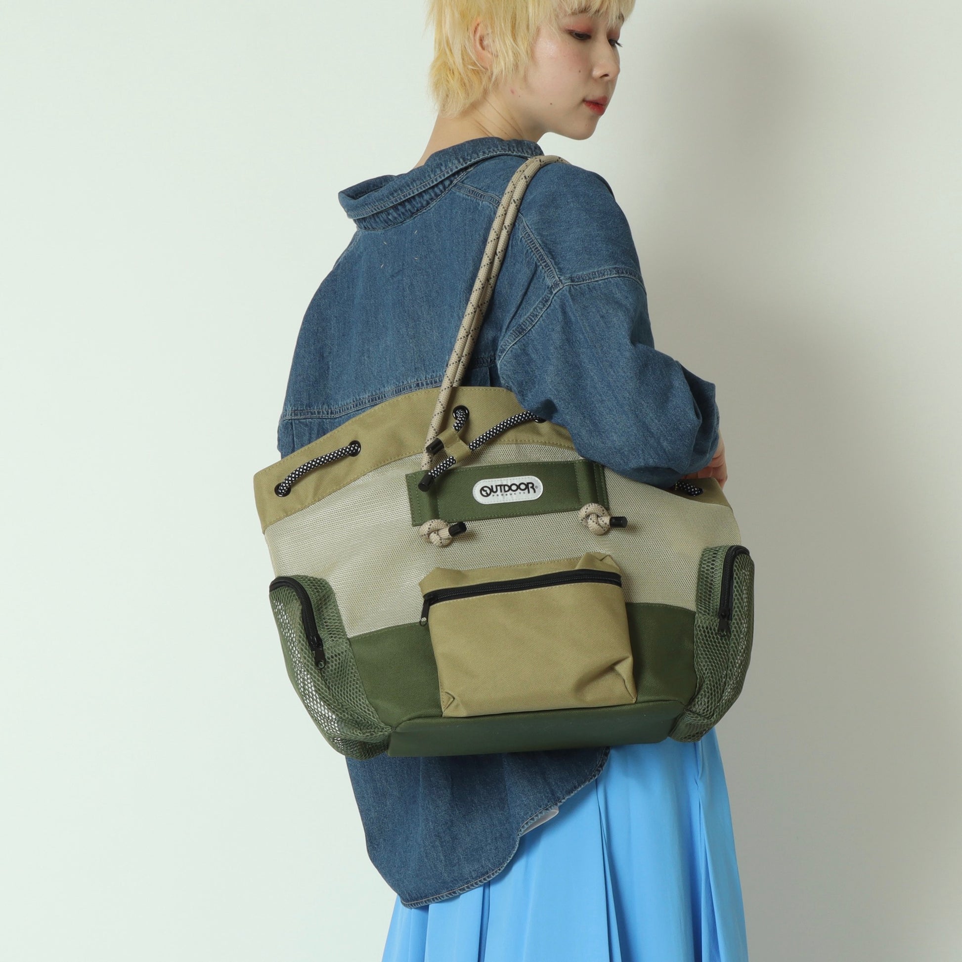 外側に収納ポケットを備えたメッシュトートバッグ。