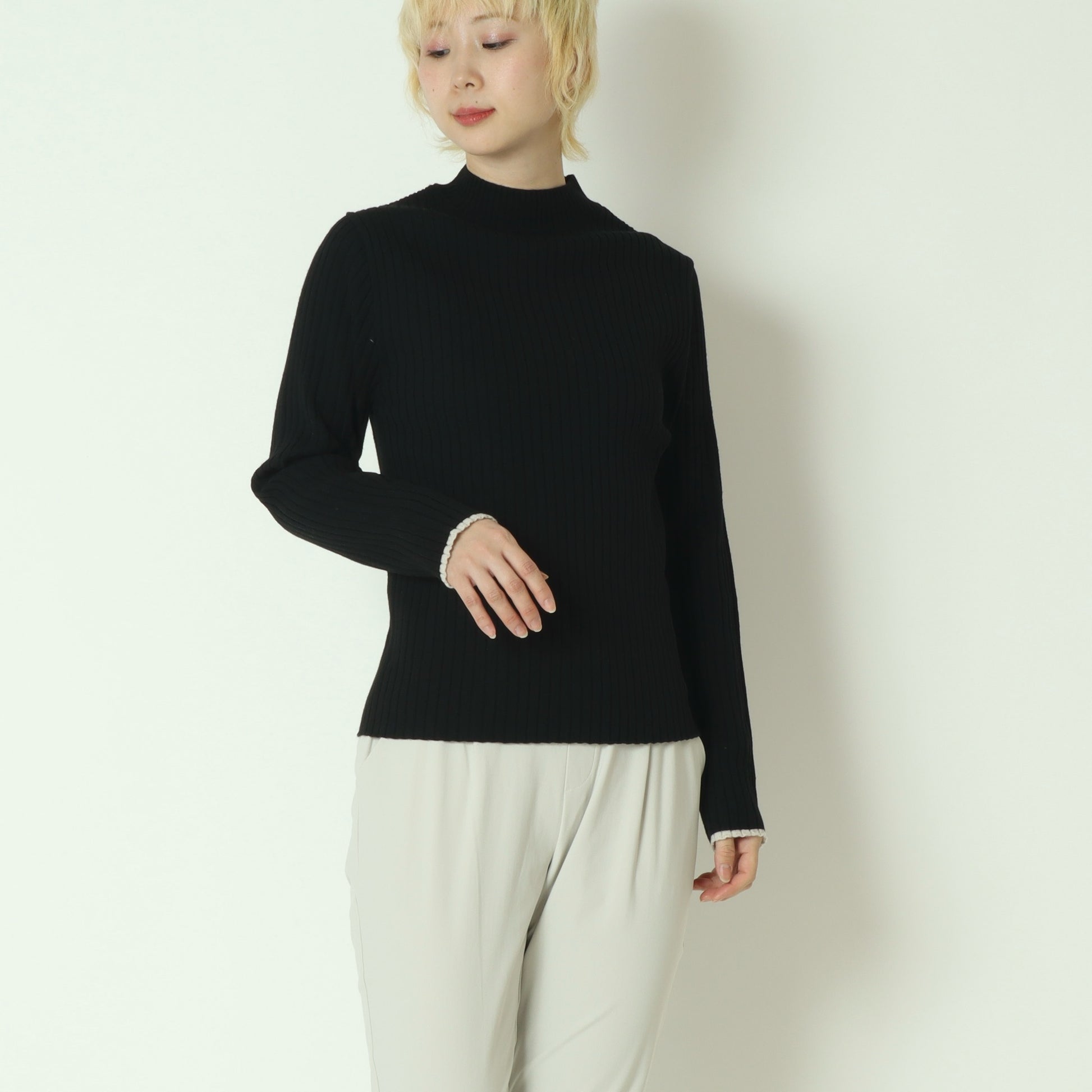 シンプルな中にさりげないアクセントを効かせたリブニットトップス。